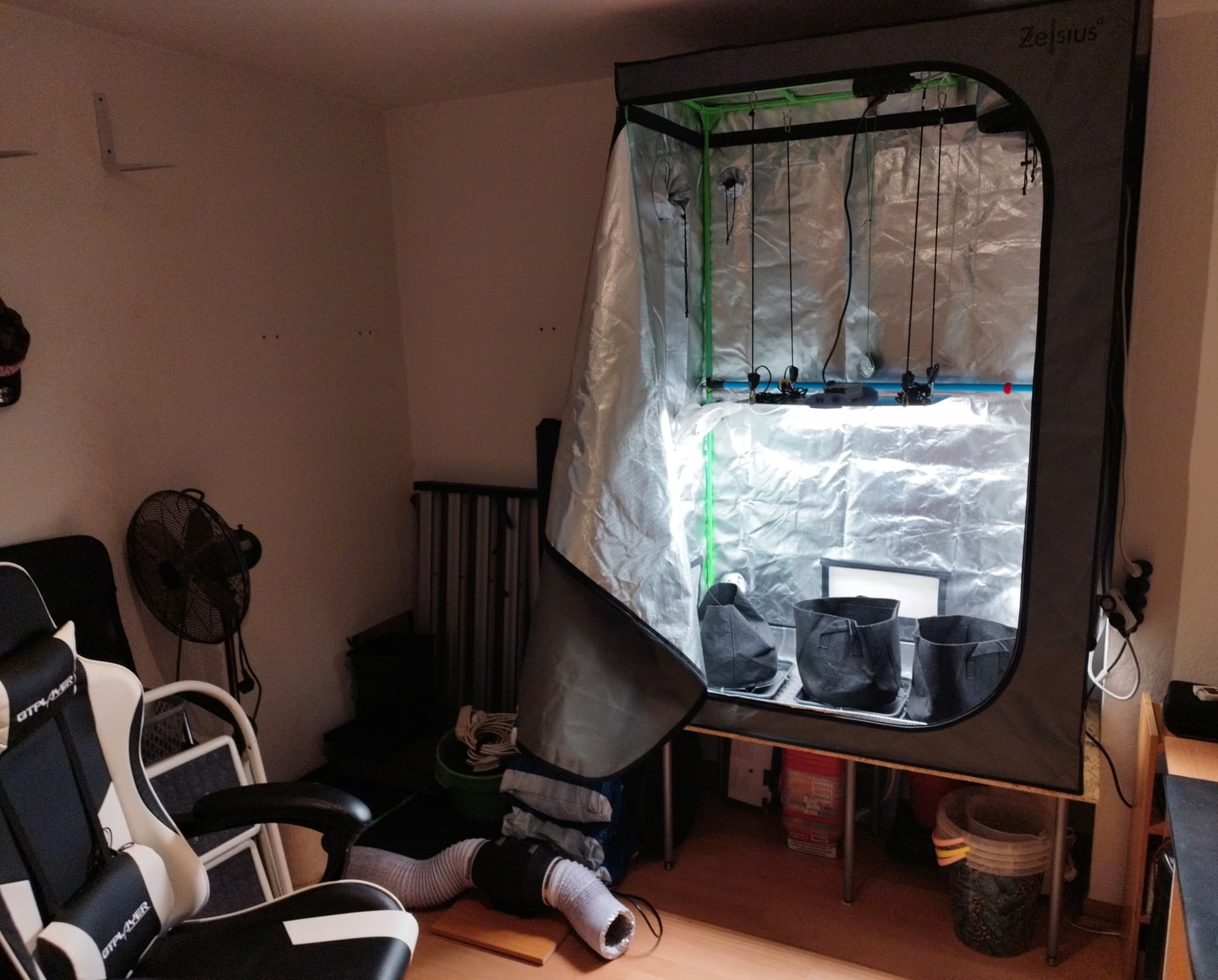 Location: Indoor, 120x120 und 120x60 Beleuchtung: 640W Philzon & 200W Phlizon Belüftung: 600m3 Absaugung mit 930m3 Filter, 440m3 Absaugung mit 500m3 Filter Growmedium: T.A. Organic Soil Light Mix Dünger: BioBizz Grow / Hesi Bio Bloom Zusätze/Booster: CalMag-Top Max-Bittersalz-Alfa Boost-Aptus Super PK-EM`s-Root Max-PH+ Bewässerung: LW 5,3dh mit 30mg Cal.und 3,5mg Mag.