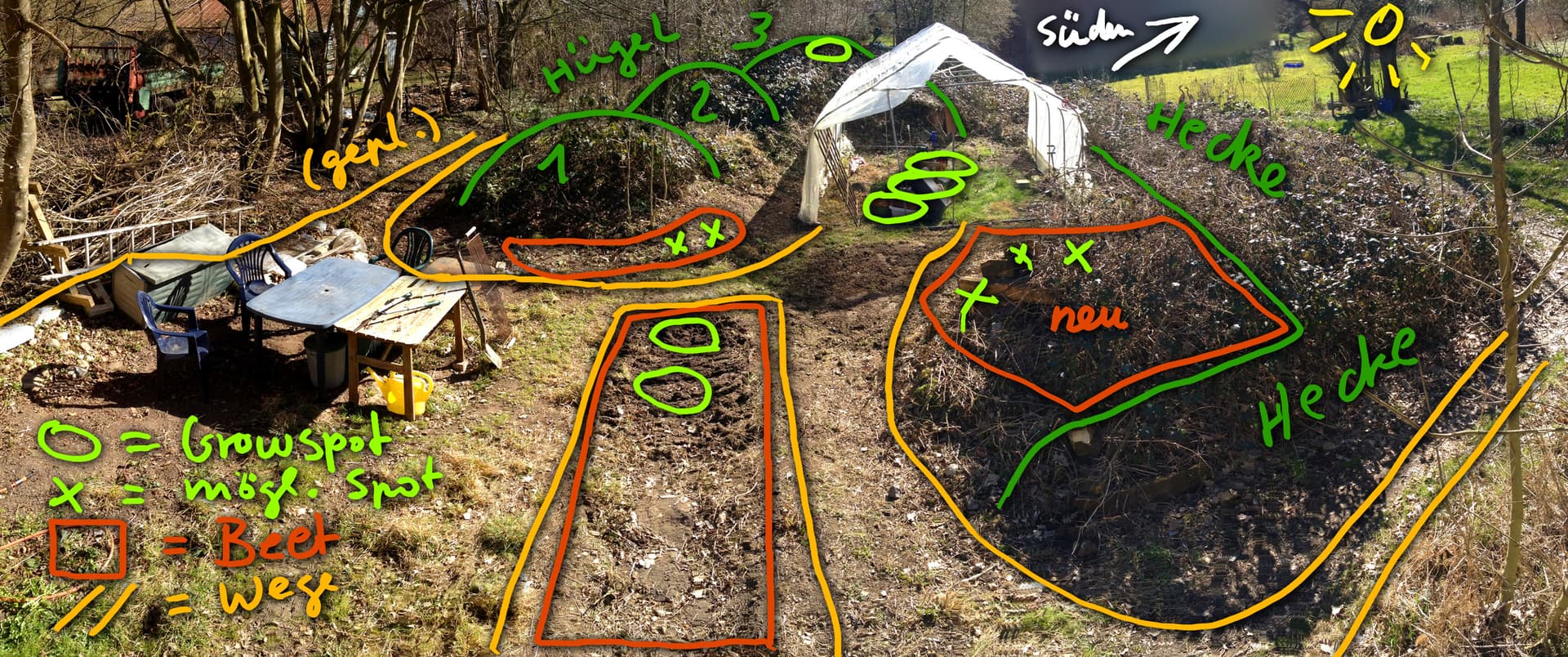 In meinem Garten werde ich die 6 Spots von 2023 wieder besetzen. Nachdem er letztes Jahr zugewuchert war, und ich nur im Zelt gegrowt hab, haben wir ihn jetzt wieder freigelegt