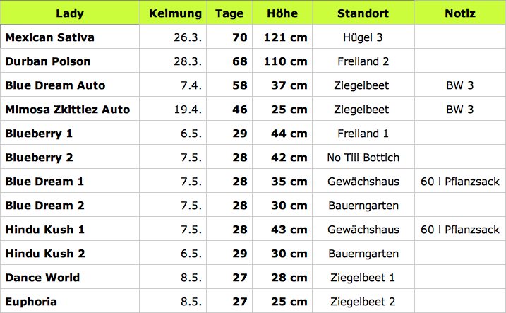 Die Sativa-Ladies hab ich gar nicht fotografiert heute. Naja, nächstesmal. Sie sehen gut aus und wachsen fröhlich weiter, siehe Tabelle.