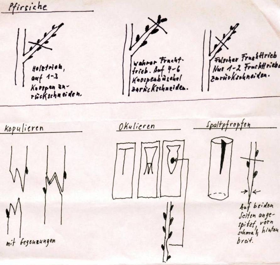 Schnitt am besten während der Blüte: Falsche Fruchttriebe (nur runde Blütenknospen) und Holztriebe (nur spitze Blattknospen) bis auf zwei Augen zurückschneiden. Wahre Fruchttriebe (Mischung von Knospen und Blattknospen, an der Zweigbasis zwei Blattknospen), auf 6 - 8 Augen zurückschneiden. Im September die alten Fruchttriebe abschneiden. Ebenfalls nach innen weisende, zu dicht stehende Triebe, Konkurrenztriebe und senkrechte Ständer wegschneiden, die wahren Fruchttriebe müssen erhalten bleiben. - Wenn sich nicht mehr genügend Fruchttriebe bilden oder wenn der Baum im unteren Bereich verkahlt, müssen nach der Ernte die Leitäste abgeschnitten werden bis zu einem starken Seitenspross. Dieser wird wieder als Leitast gezogen. Die Schnittstelle gut verstreichen.(…)