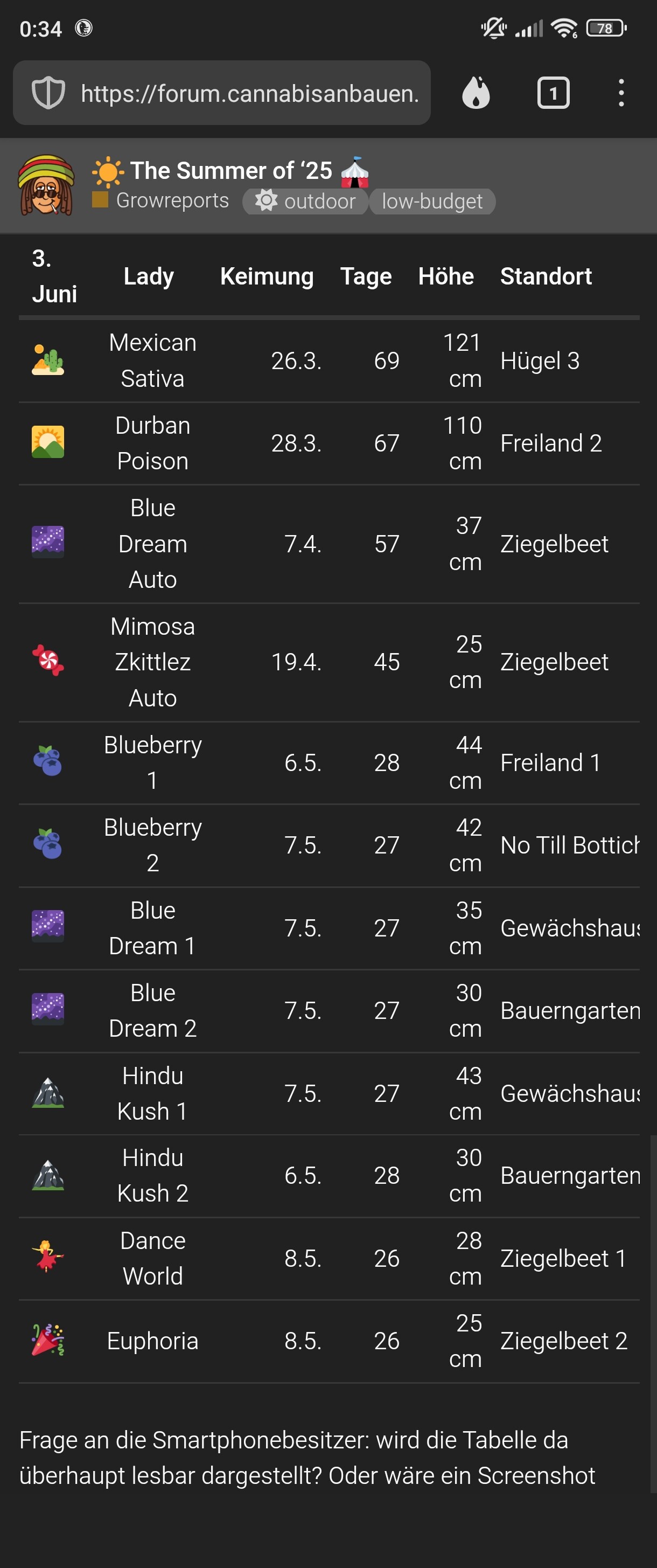 | 3. Juni | Lady | Keimung | Tage | Höhe | Standort | Notiz |