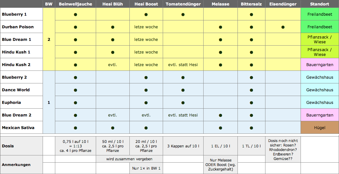 Heute muss ich jedenfalls sehen, ob ich überhaupt noch genug Hesi hab, um den obigen Plan zu erfüllen. Ansonsten gibts Tomatendünger zur Überbrückung, und nächstesmal dann einheitlich weiter.