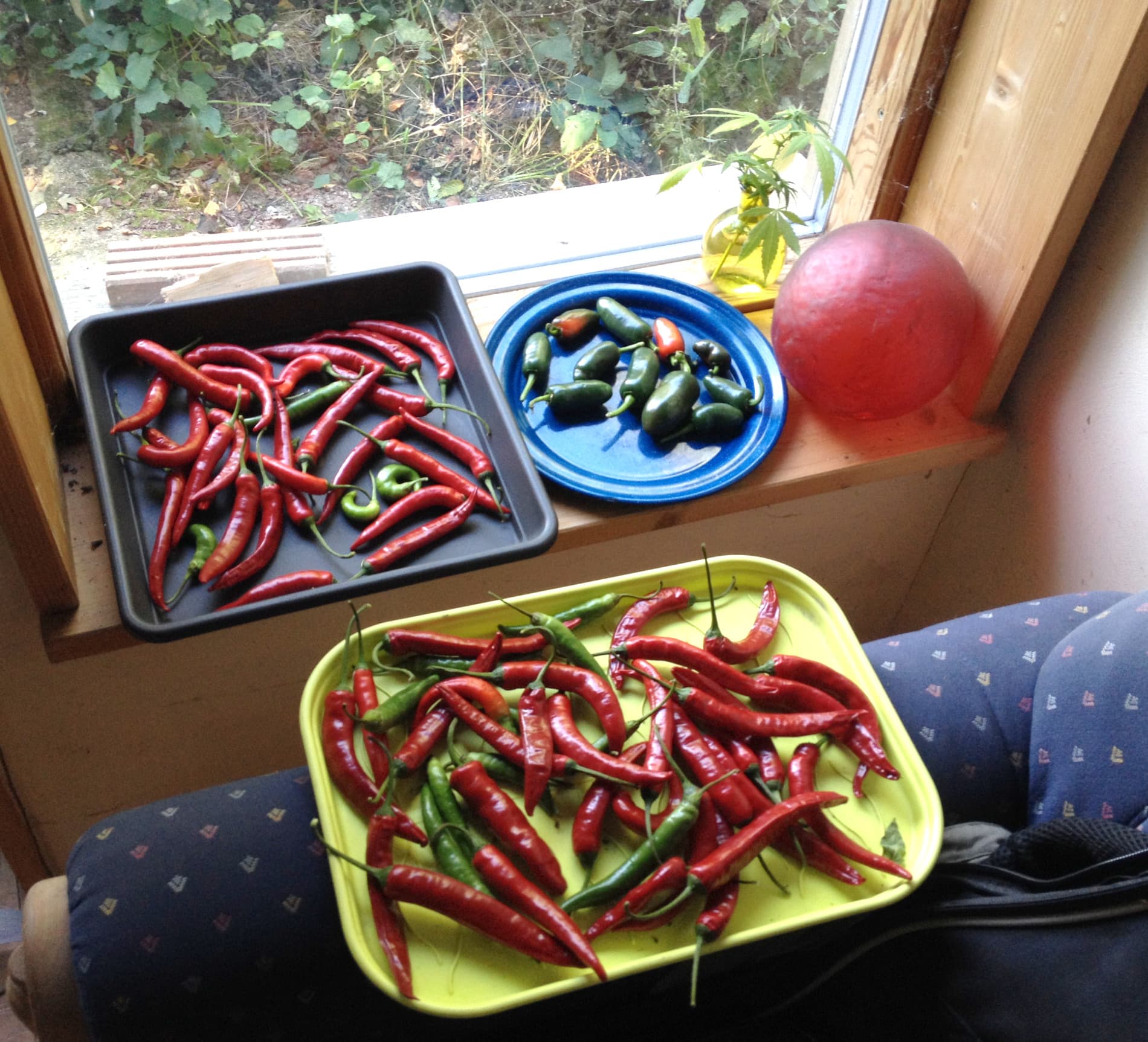 Die Cayennes werden wie gesagt getrocknet; die grĂŒnen Jalapeños sollen nur nachreifen, die kommen dann auch in die GefriertĂŒte zu den 2 Dutzend roten Jalapeños, die ich frisch eingefroren habe, die koch ich noch ein irgendwann. NĂ€chstes Jahr will ich so nen Regenbogen-Strain