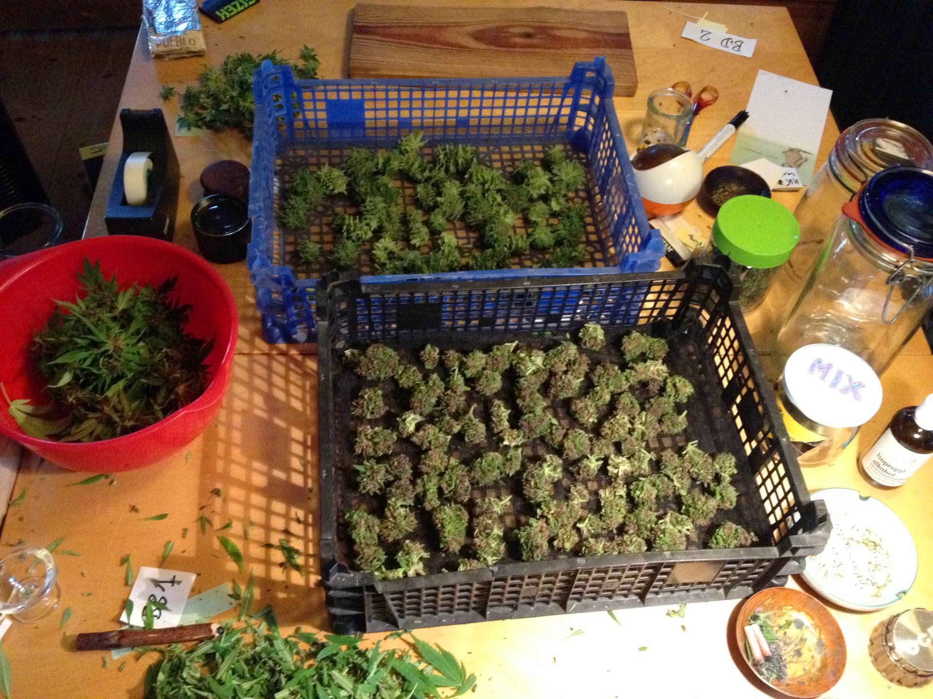 Auch die Mexican Sativa wurde verarbeitet, und noch ein paar letzte Buds von Blue Dream und Durban Poison. Momentan sind jetzt alle Netze & Tüten belegt, aber morgen wird einiges ins Glas wandern, dann gehts weiter (Dance World fehlt noch …).