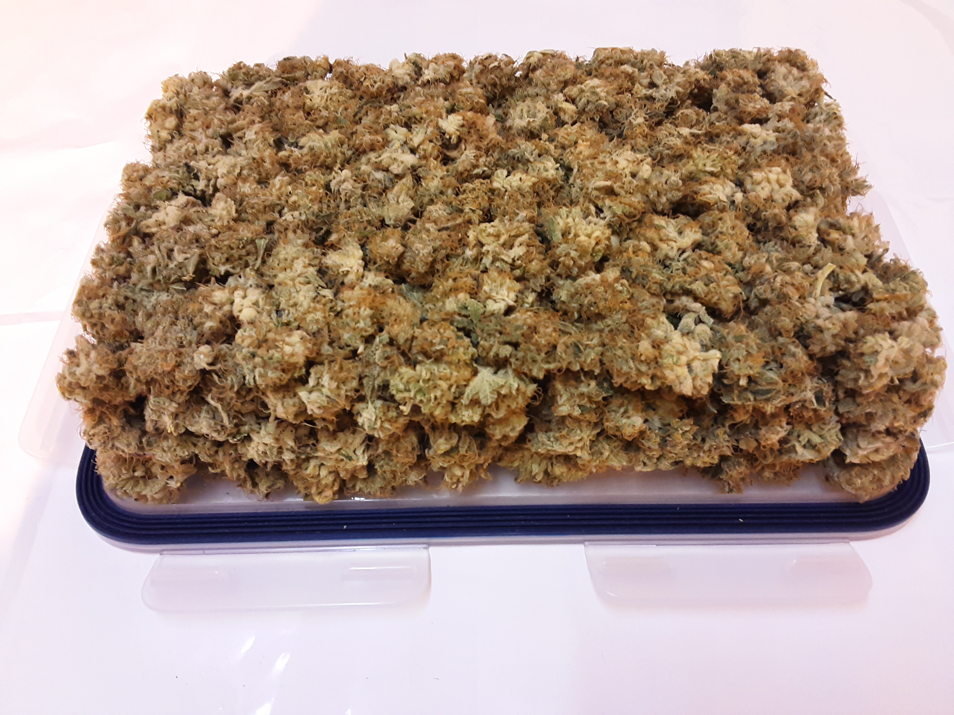 Sind die Bedingungen wie oben beschrieben… empfiehlt es sich die Blumen möglichst einheitlich klein zu zerlegen… nach 2 Tagen im trockennetz landen die Knospen bei meinem derzeitigen Klima von 23°c und 42% rLf direkt in solche glasernen Auflaufform mit luftdicht schließenden… für die Lebensmittelindustrie zugelassene Deckel.