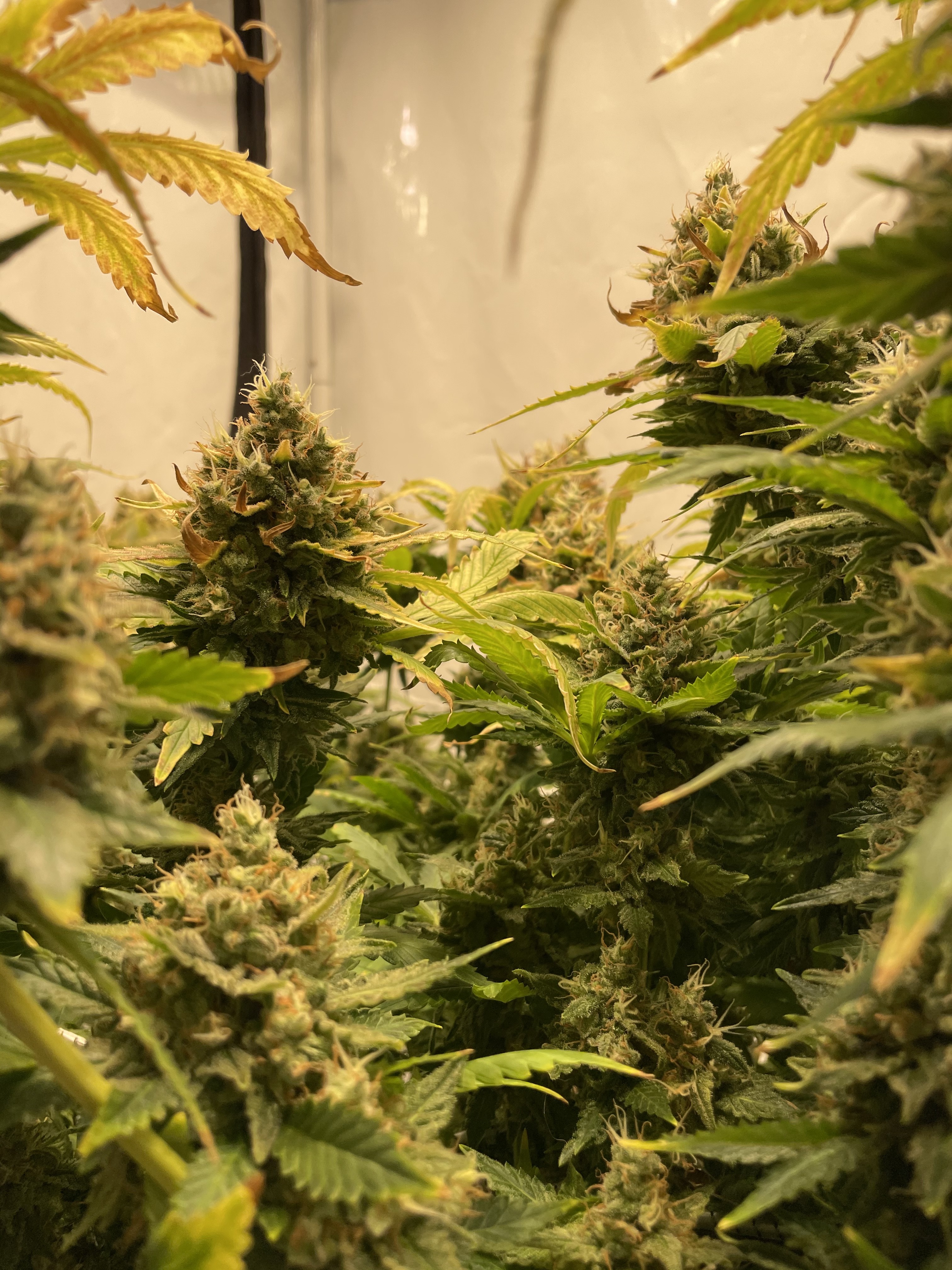 Die Pflanze hat in der Blüte Leiche Schwäche gezeigt - an leichten Mangel an Nährstoffen. Da die vegi Phase zu lange war . Und erst beobachten musste , um zu lernen . Für die Zukunft natürlich.
