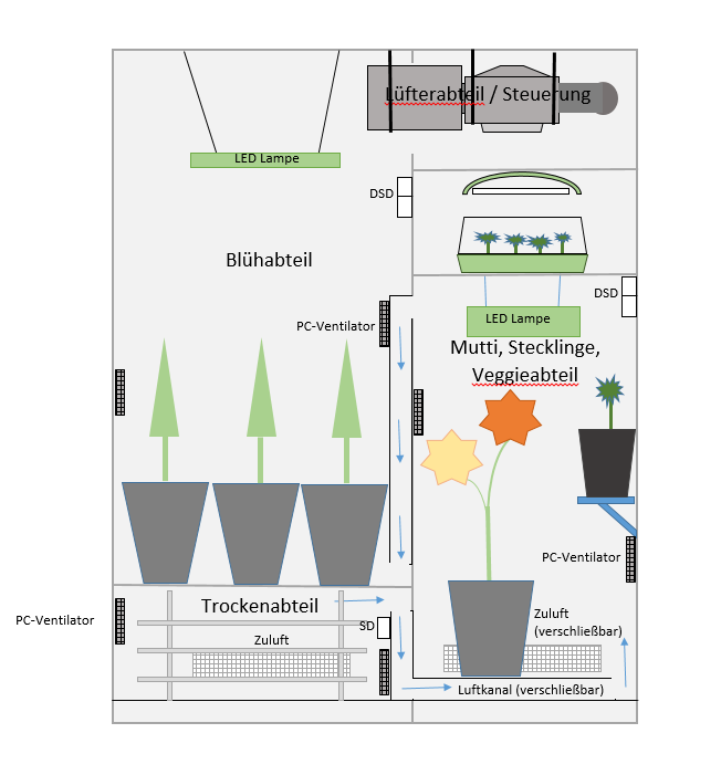 Das Abteil wird ca. B 60 cm x H 130 cm x T 50 cm groß sein. Im oberen Teil will ich einen Boden von ca. der halben bis 2/3 der Tiefe des Schrankes einlegen worauf das Minigewächshaus mit Stecklingsbeleuchtung steht. Darunter soll dann das Veggie- / Muttiabteil kommen. Die Mutti kommt auf den Boden, für die Pflanzen in der Wuchsphase will ich ein Regal an die Wand schrauben für 3 bis 4 Töpfe (3,6l oder 2l Töpfe).