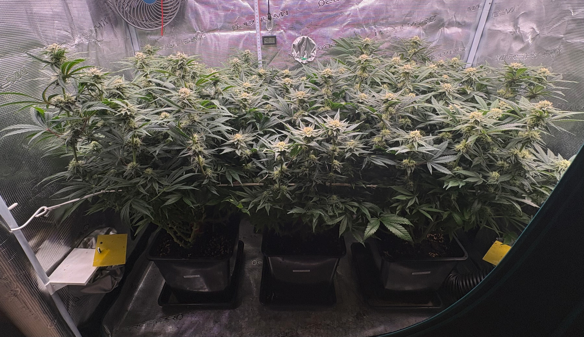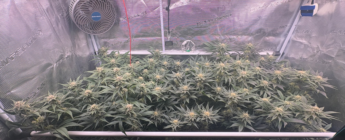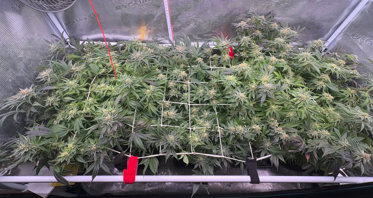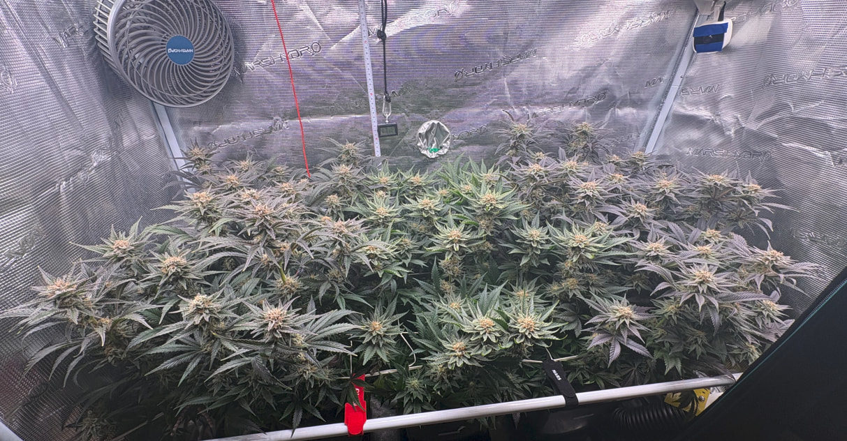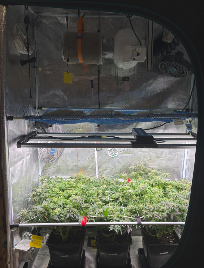Die obere Hälfte wurde geerntet und in DryFerm Bags gepackt. Die dürfen jetzt langsam trocknen und dann - in zwei Wochen oder so - ist der Rest fällig. Ursprünglich wollte ich erst morgen bevor das Licht angeht ernten. Da ich aber relativ trocken im Zelt bin (45%) habe ich mich für eine Teilernte tagsüber entschieden, da hier die Blüten mehr Feuchtigkeit in sich tragen. Dadurch können sie dennoch recht langsam und qualitativ trocknen.