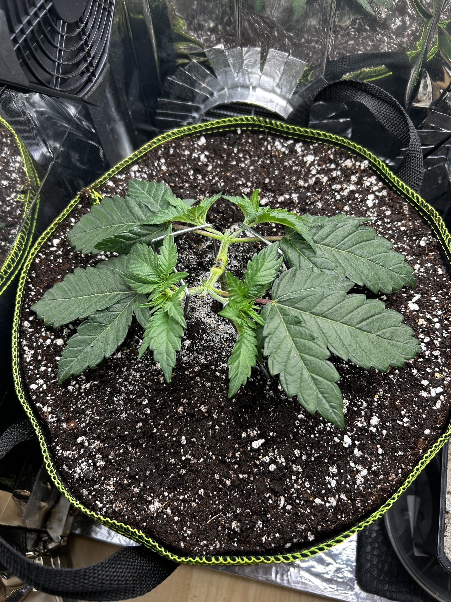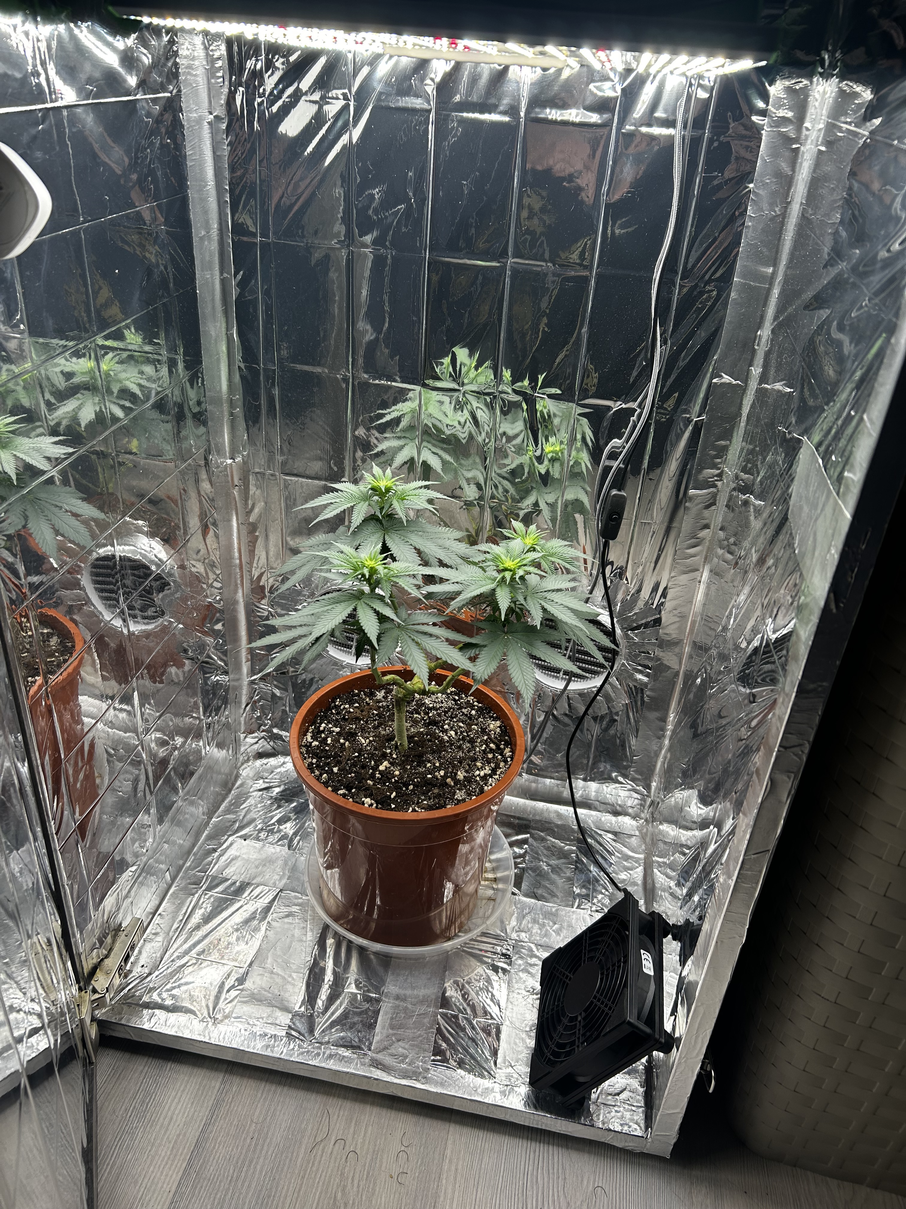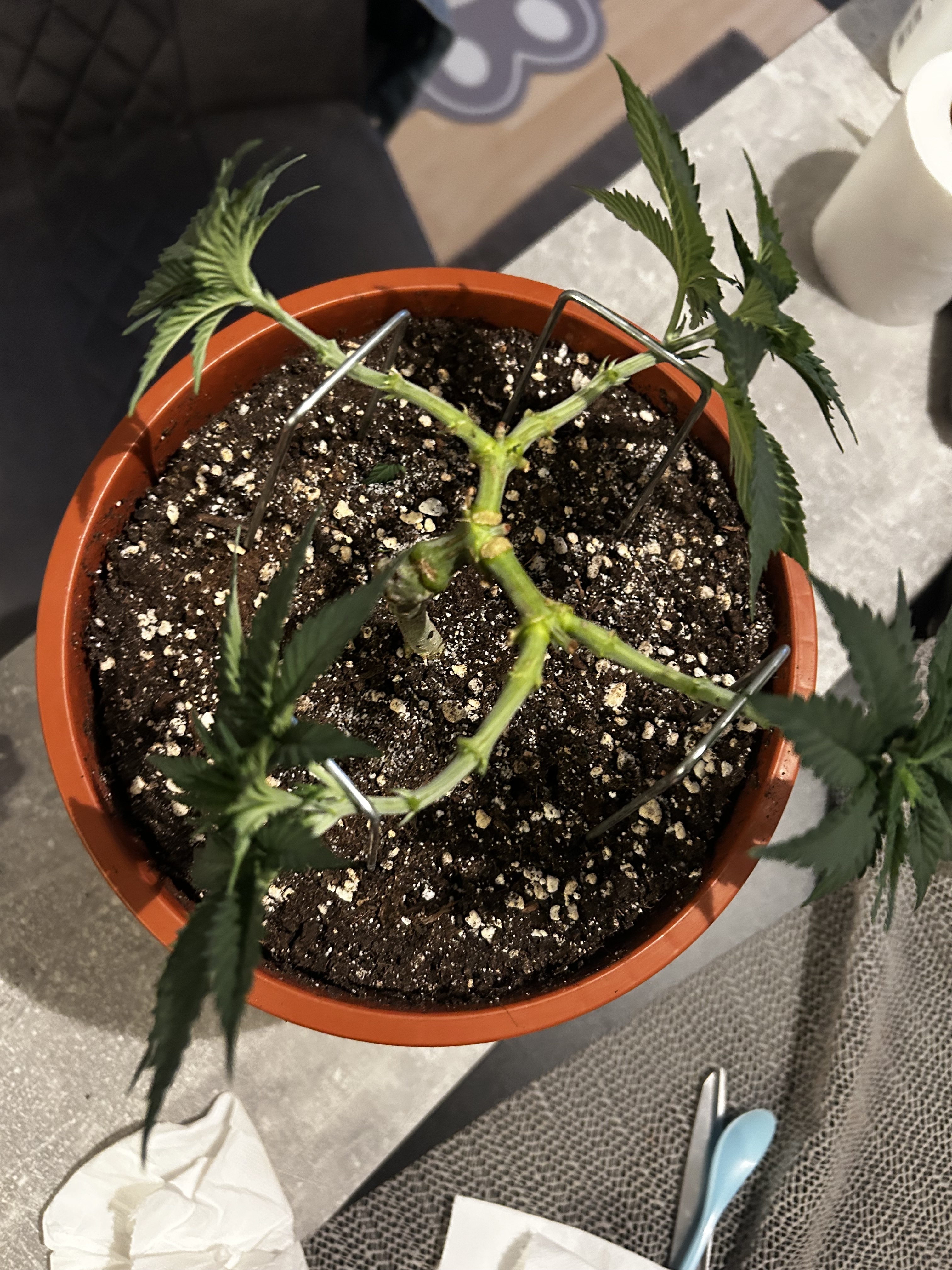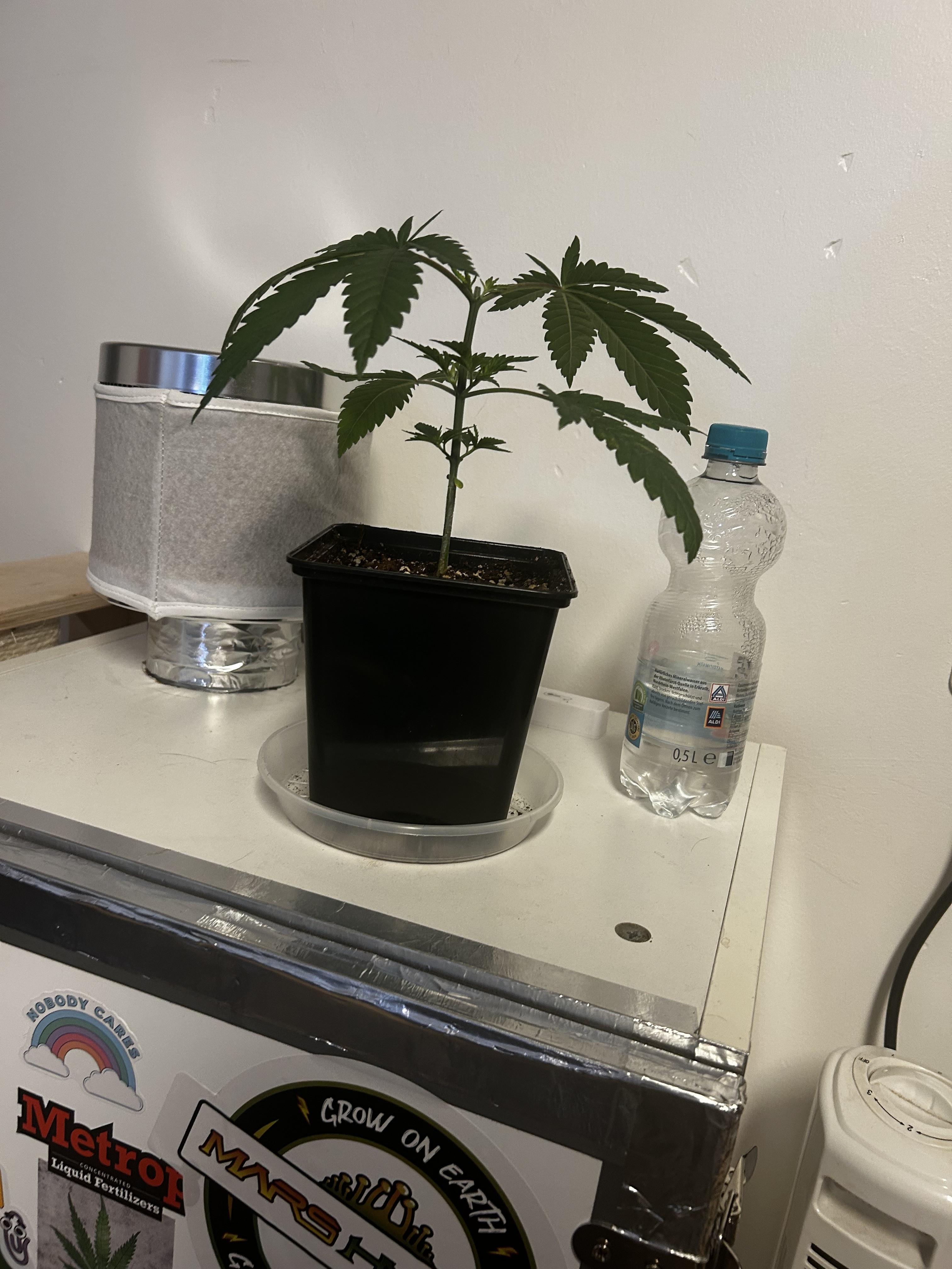 Die Layer Cake läuft seit Anfang an einfach so nebenbei im DIY-Schrank mit. Ich hatte ursprünglich zwei Pflanzen, aber hab mich jetzt endgültig für die eine entschieden – bei der anderen war ein Haupttrieb kaputt, das hat sich eh nicht mehr richtig gefangen. Die, um die’s hier geht, hab ich sauber getoppt, bisschen trainiert und die hat jetzt vier stabile Haupttriebe. Vielleicht werden’s später noch acht oder sogar sechzehn – mal schauen, wie sie sich entwickelt. Heute ging’s dann in den Endtopf (15 L), gegossen wurde nur ganz leicht mit pH-korrigiertem Wasser – die Erde ist ja voll geladen, also alles easy.