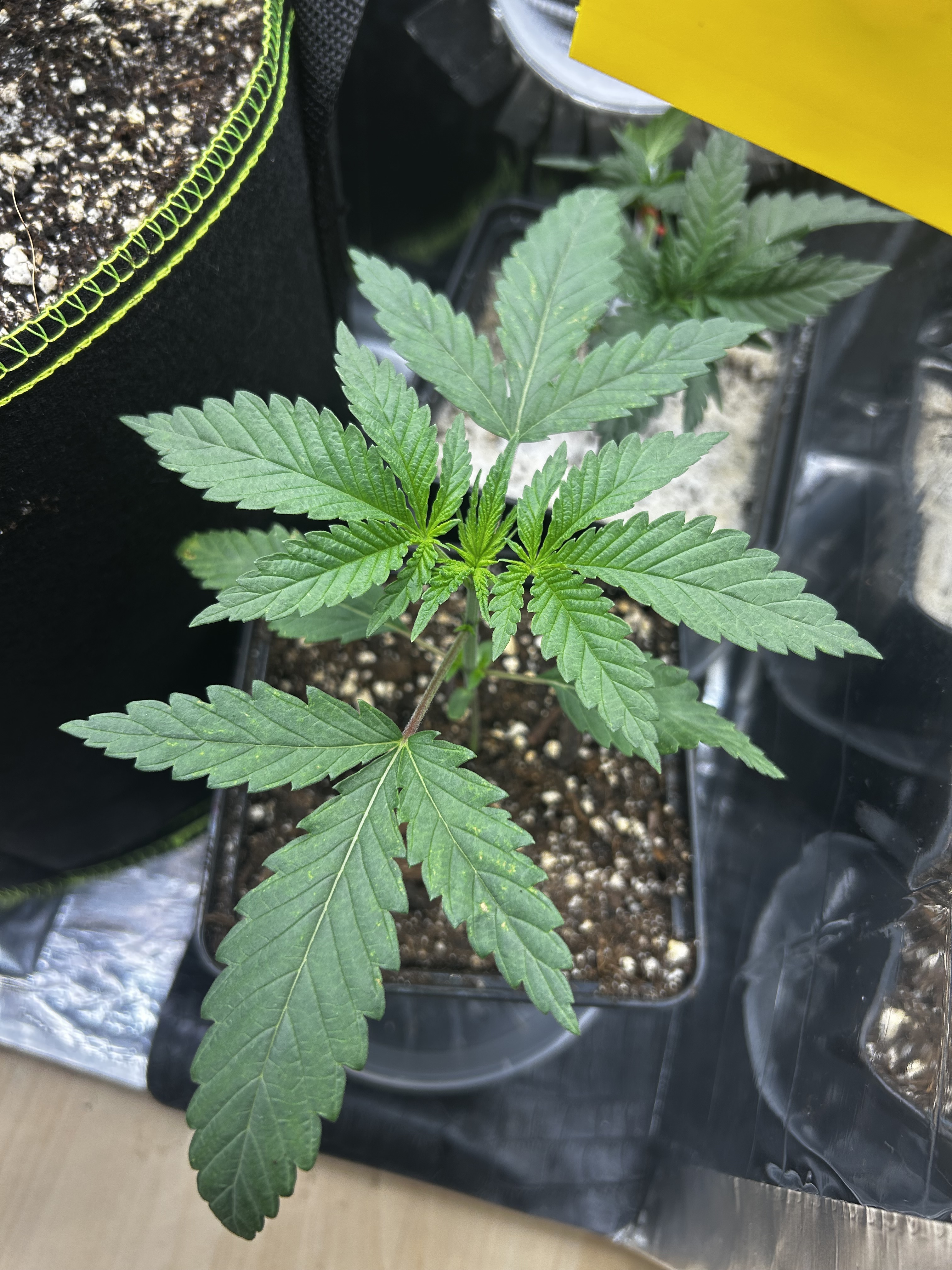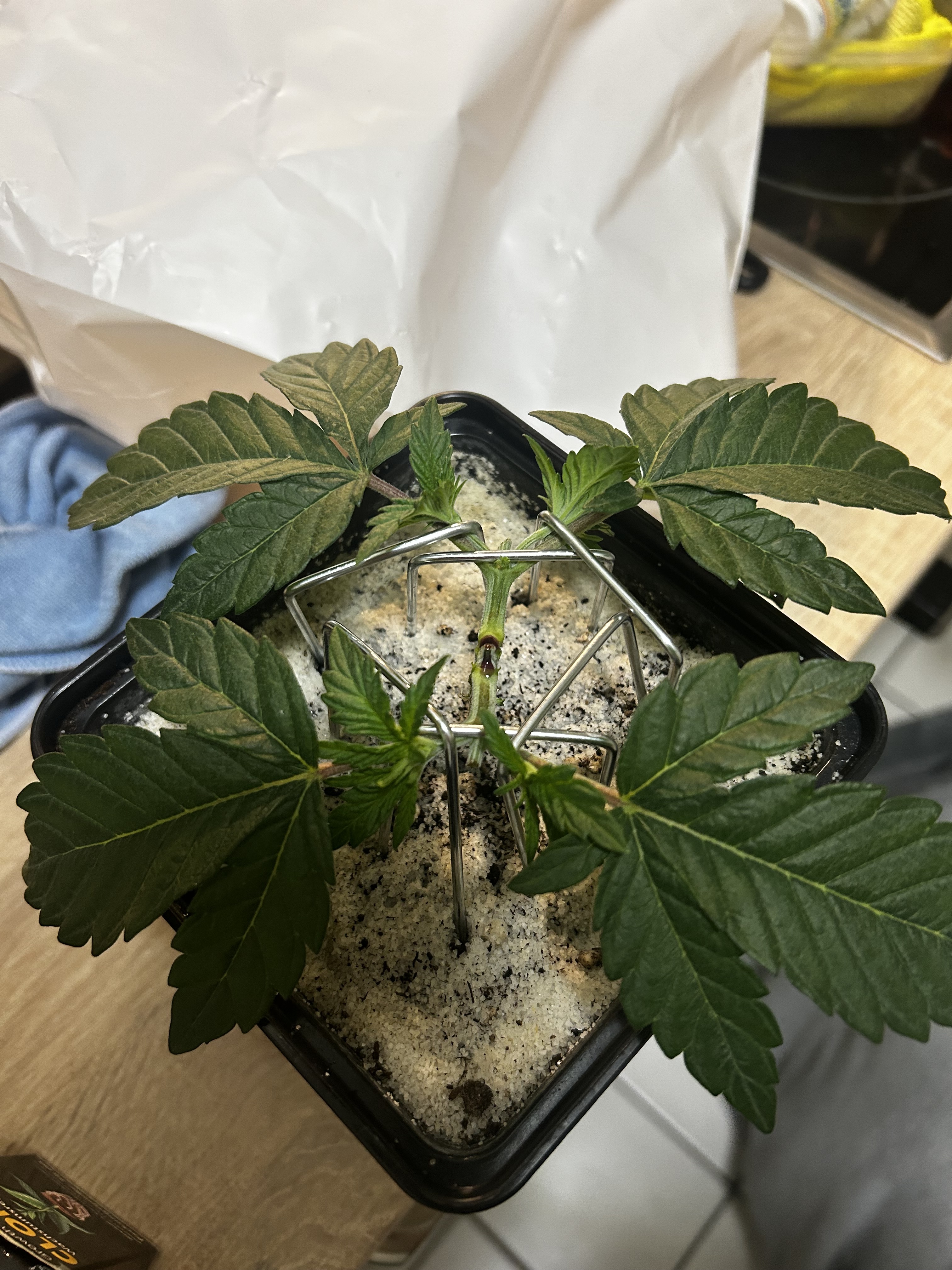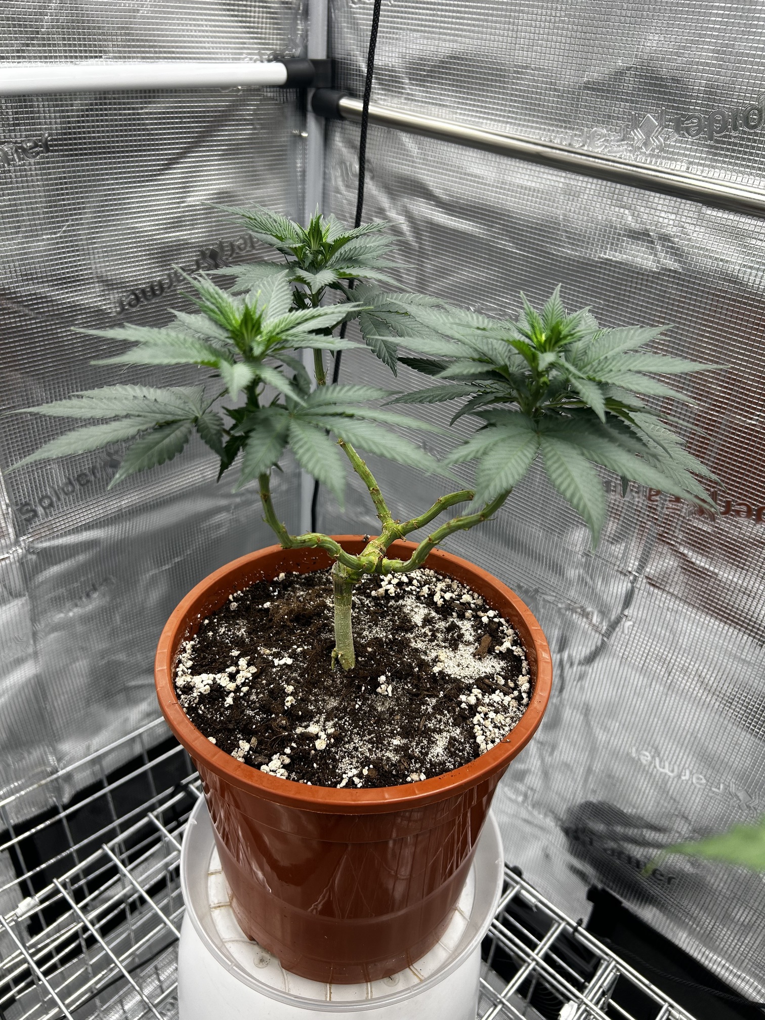 Die Layer Cake läuft seit Anfang an einfach so nebenbei im DIY-Schrank mit. Ich hatte ursprünglich zwei Pflanzen, aber hab mich jetzt endgültig für die eine entschieden – bei der anderen war ein Haupttrieb kaputt, das hat sich eh nicht mehr richtig gefangen. Die, um die’s hier geht, hab ich sauber getoppt, bisschen trainiert und die hat jetzt vier stabile Haupttriebe. Vielleicht werden’s später noch acht oder sogar sechzehn – mal schauen, wie sie sich entwickelt. Heute ging’s dann in den Endtopf (15 L), gegossen wurde nur ganz leicht mit pH-korrigiertem Wasser – die Erde ist ja voll geladen, also alles easy.