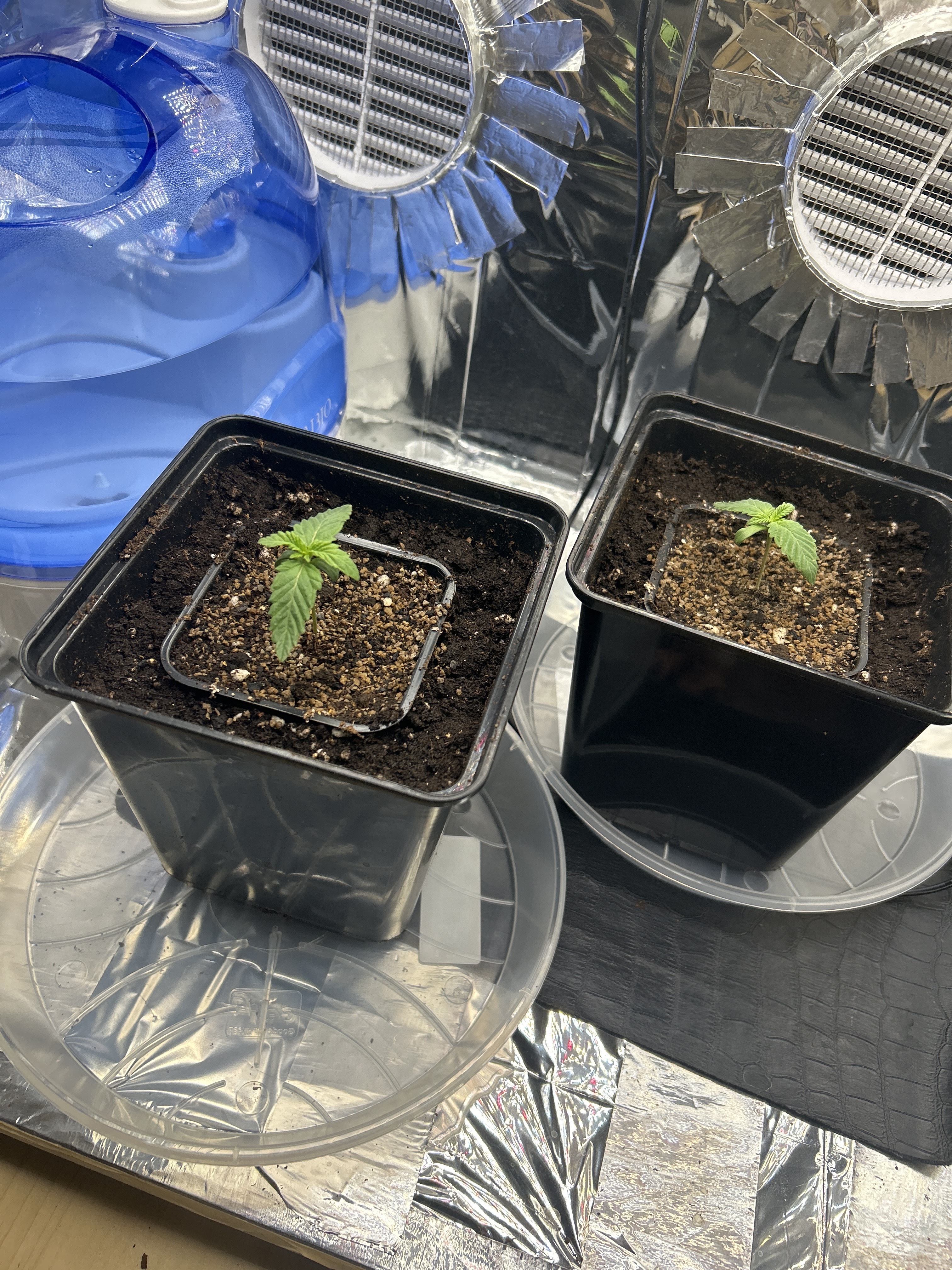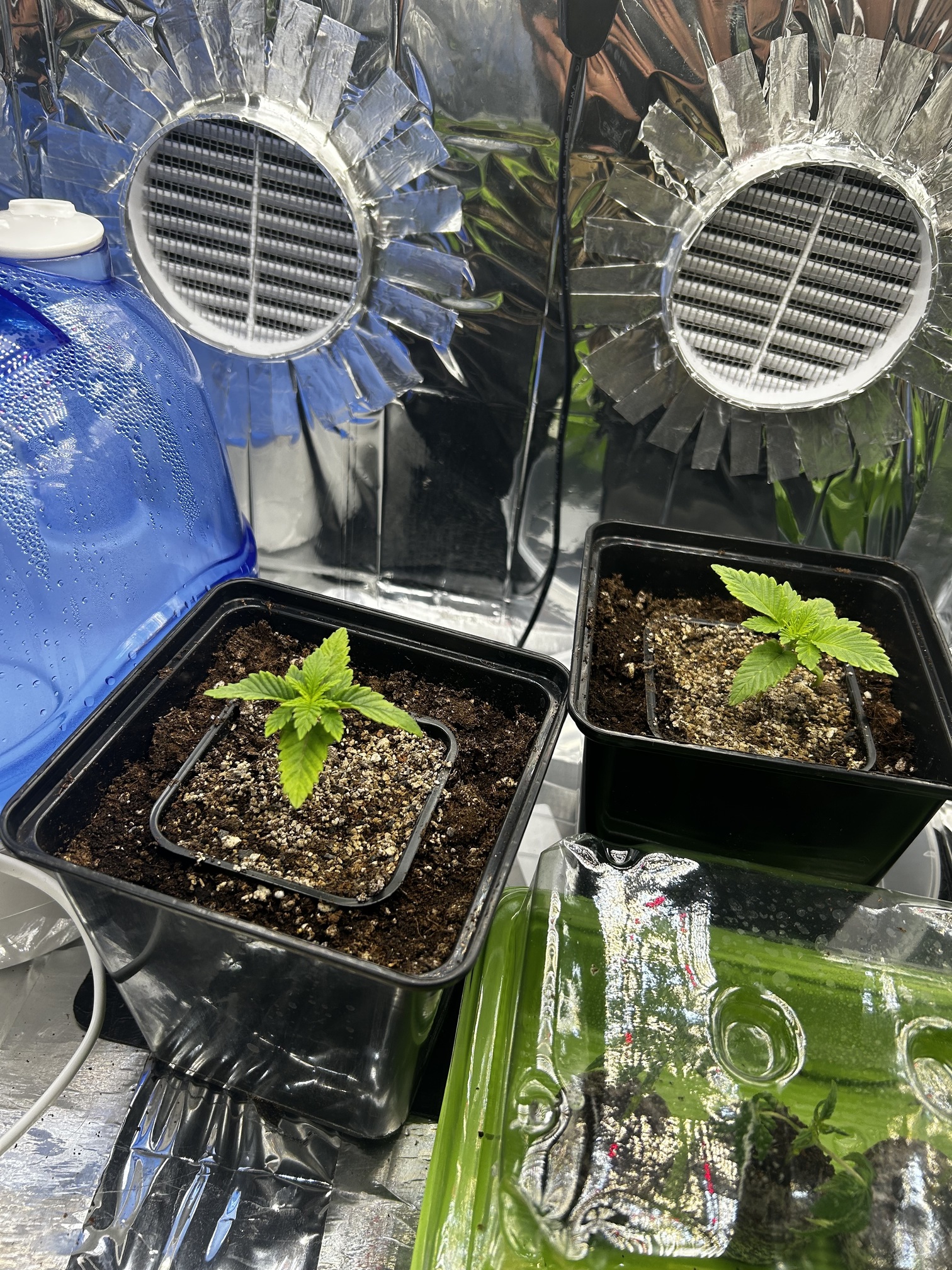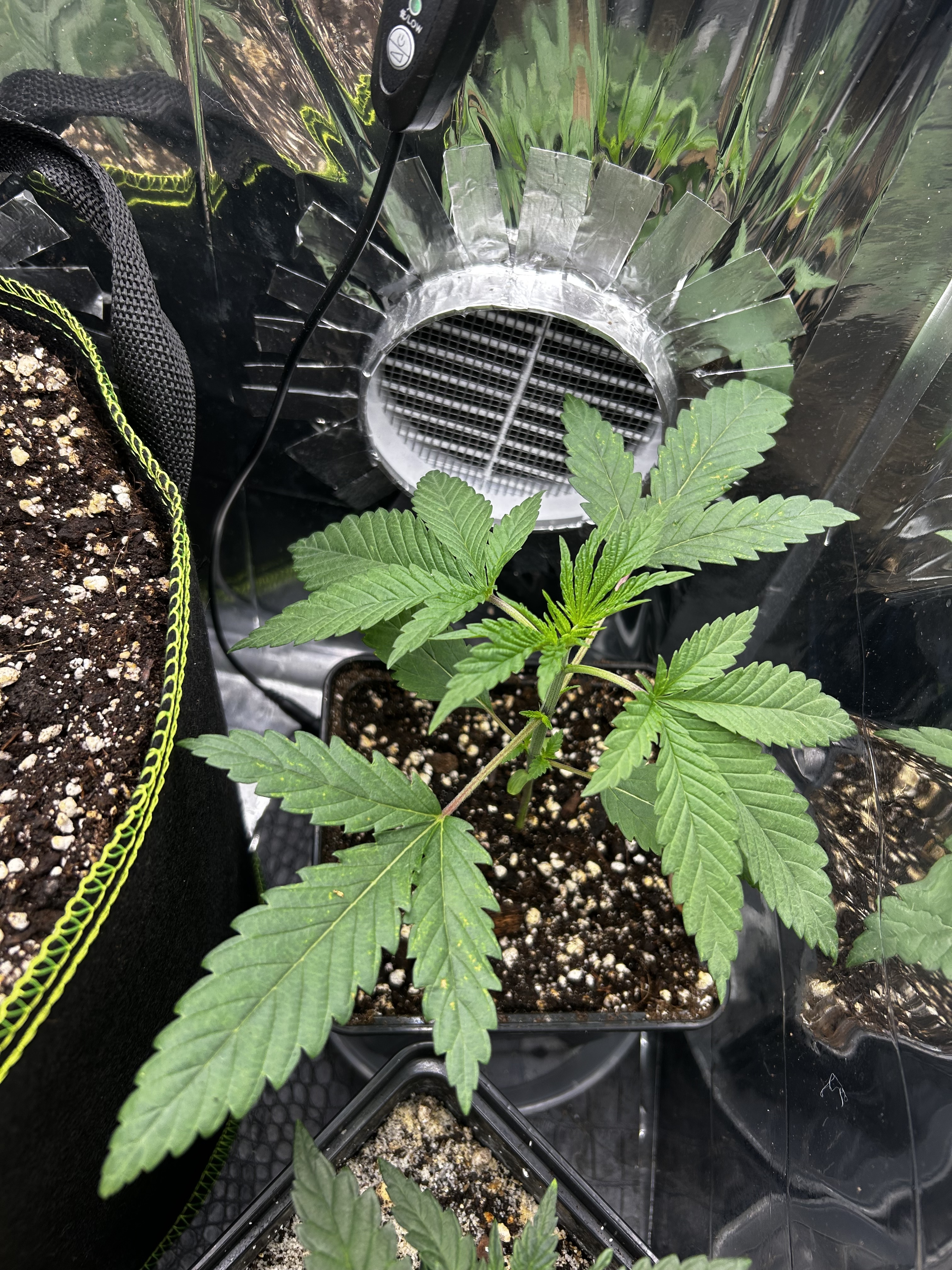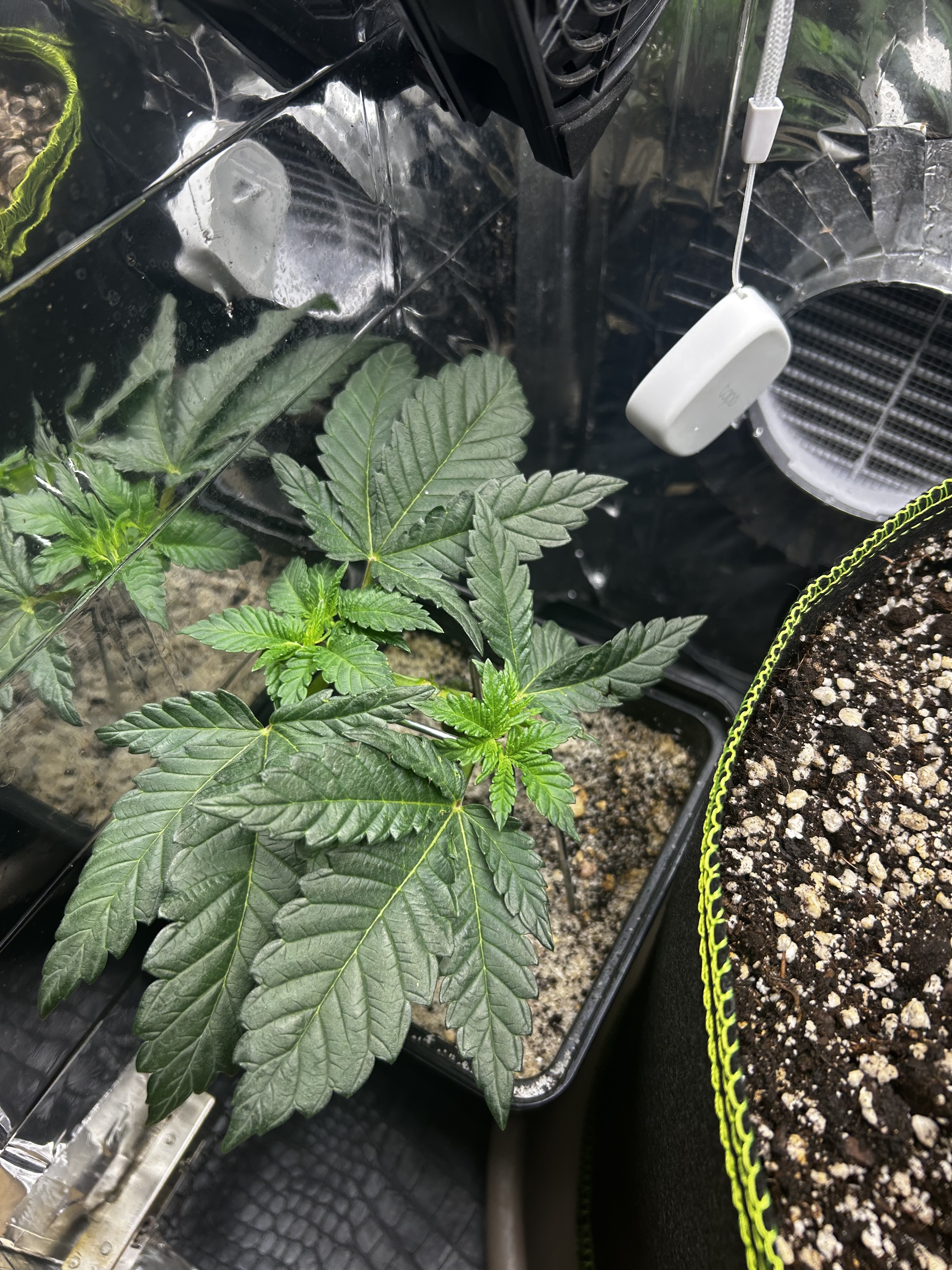 Die Layer Cake läuft seit Anfang an einfach so nebenbei im DIY-Schrank mit. Ich hatte ursprünglich zwei Pflanzen, aber hab mich jetzt endgültig für die eine entschieden – bei der anderen war ein Haupttrieb kaputt, das hat sich eh nicht mehr richtig gefangen. Die, um die’s hier geht, hab ich sauber getoppt, bisschen trainiert und die hat jetzt vier stabile Haupttriebe. Vielleicht werden’s später noch acht oder sogar sechzehn – mal schauen, wie sie sich entwickelt. Heute ging’s dann in den Endtopf (15 L), gegossen wurde nur ganz leicht mit pH-korrigiertem Wasser – die Erde ist ja voll geladen, also alles easy.