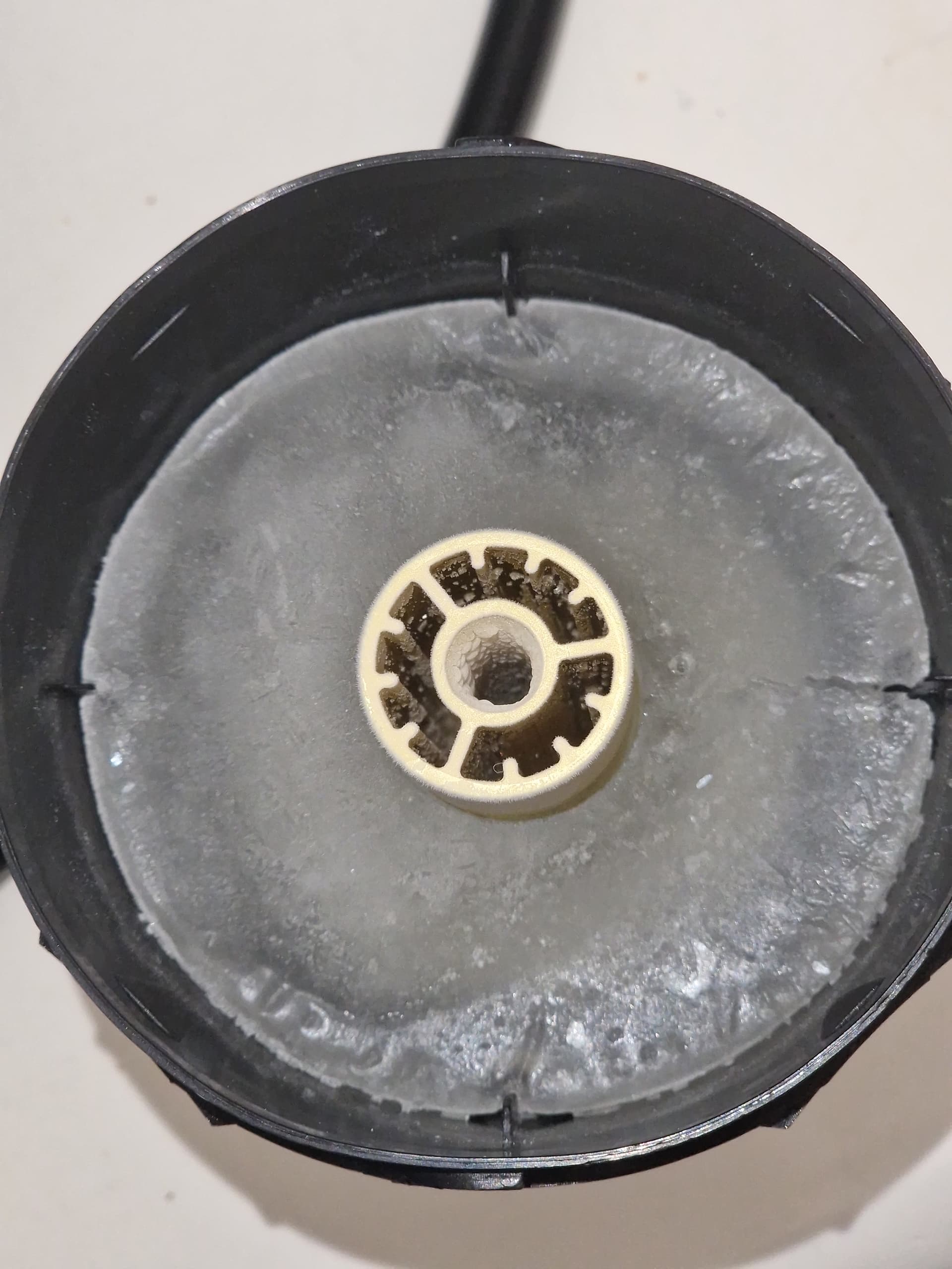In der mitte von diesem behälter steckt ein rohr .. darin befinden sich ein luftkanal .. der warme dampf kommt über den anschluss-schlauch der am Mundstück vom Venty angeschlossen ist…nimmt seinen weg durch dieses rohr .. wird dabei extrem runtergekühlt da um das komplette rohr eis ist .. und kommt am anderen schlauch wo man ein iceborn Mundstück hat wieder raus.