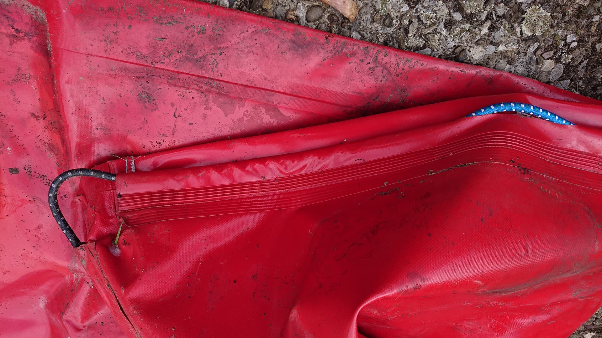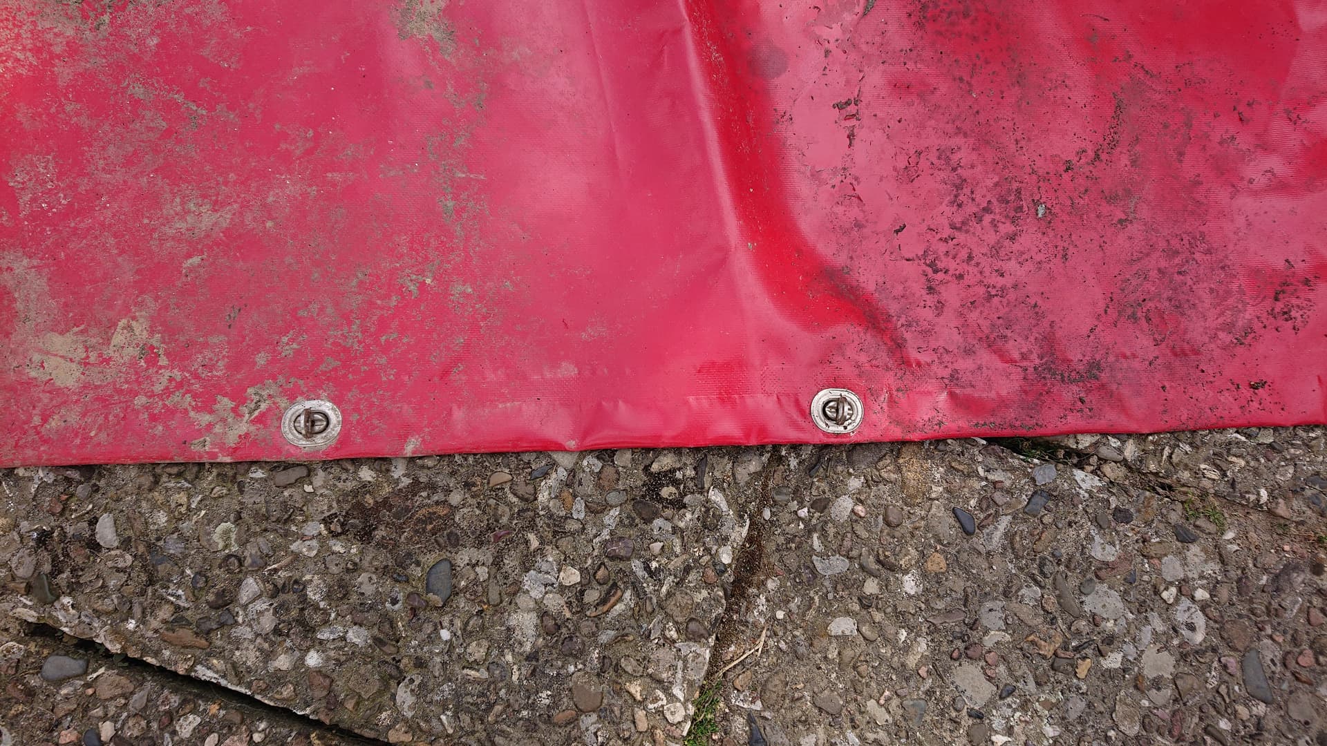 Der Dreck geht aber ab. ist halt eine alte PickUp Plane. Aber praktischerweise sind Ösen und Zugseil noch da! Aber für das ganze Gestell wird es nicht reichen fürchte ich