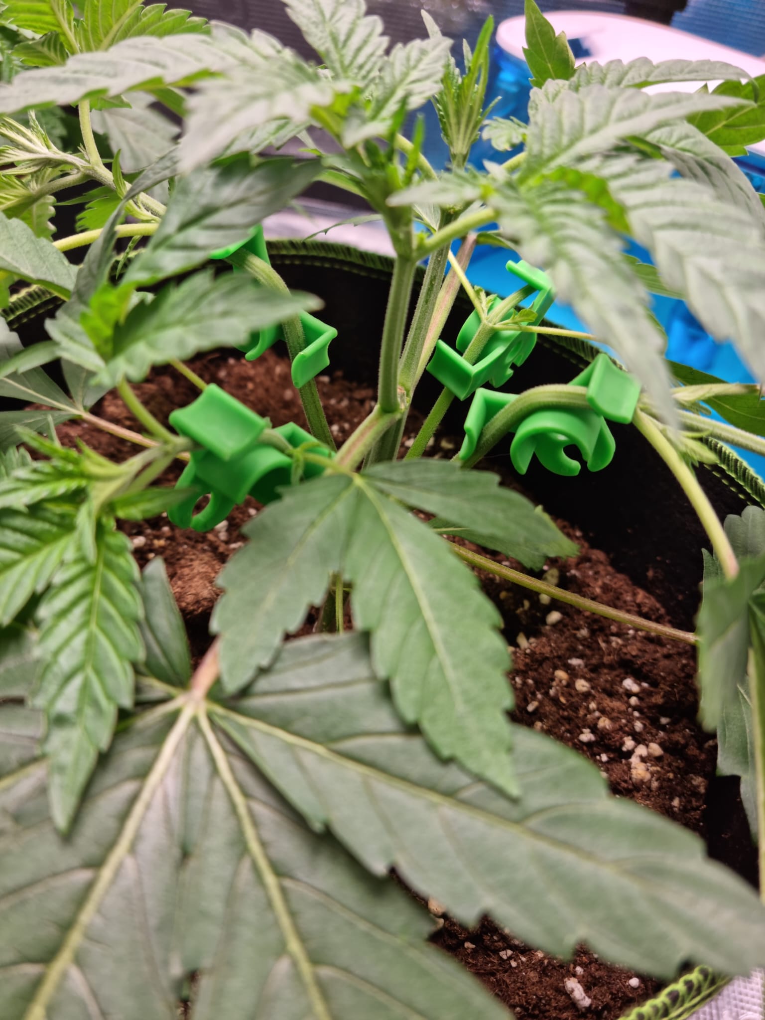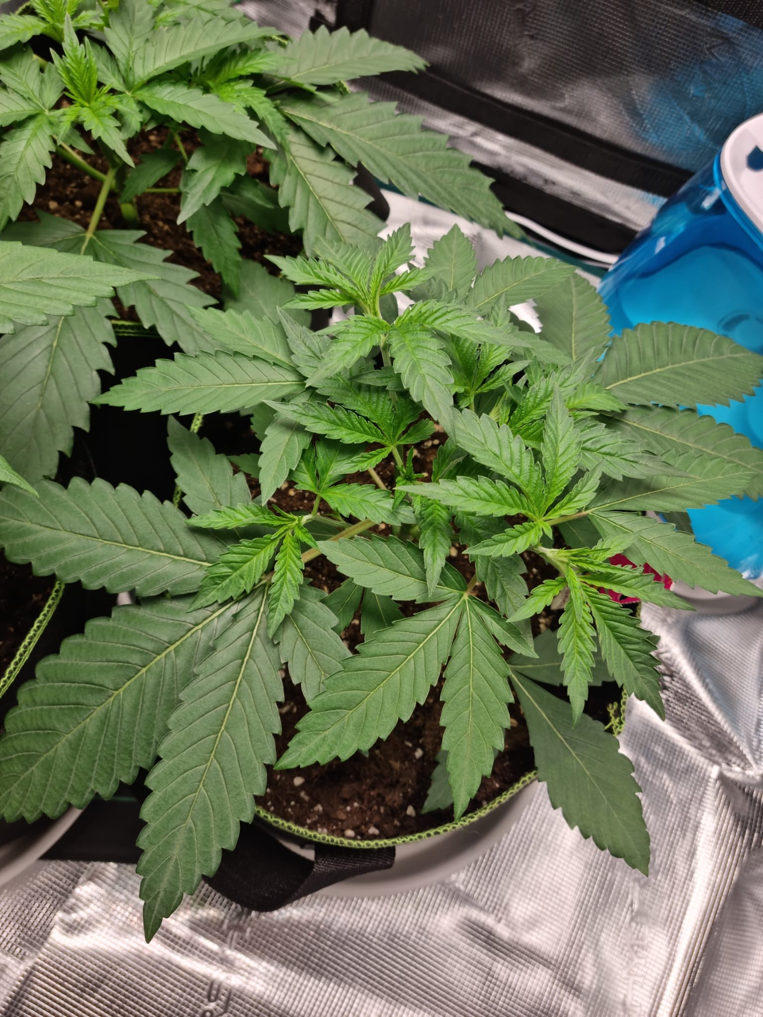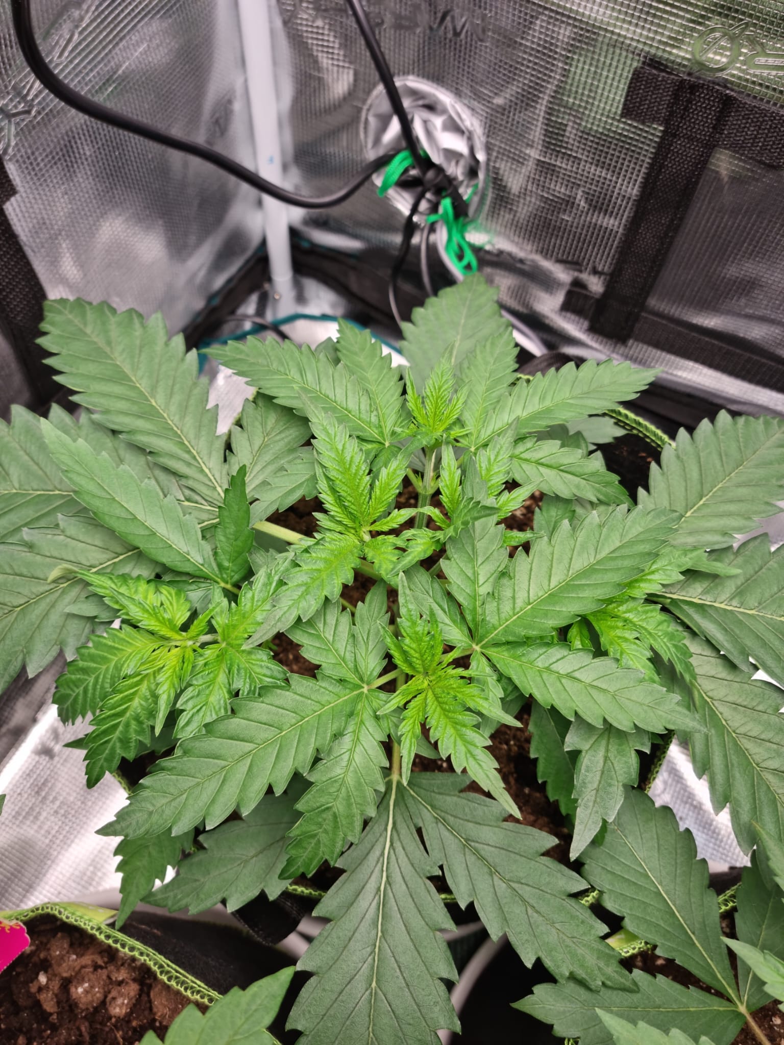 Lichtstärke habe ich aktuell bei ca. 250 ppfd, ich hatte zwischendurch mal kurz die Lichtintesität von aktuell 50% auf 70% gestellt bei 40cm Abstand, allerdings haben die beiden Legendary OG Punch Damen dann die Blätter hängengelassen und die linke Pflanze hat sich ein paar kleine Verfärbungen zugezogen.