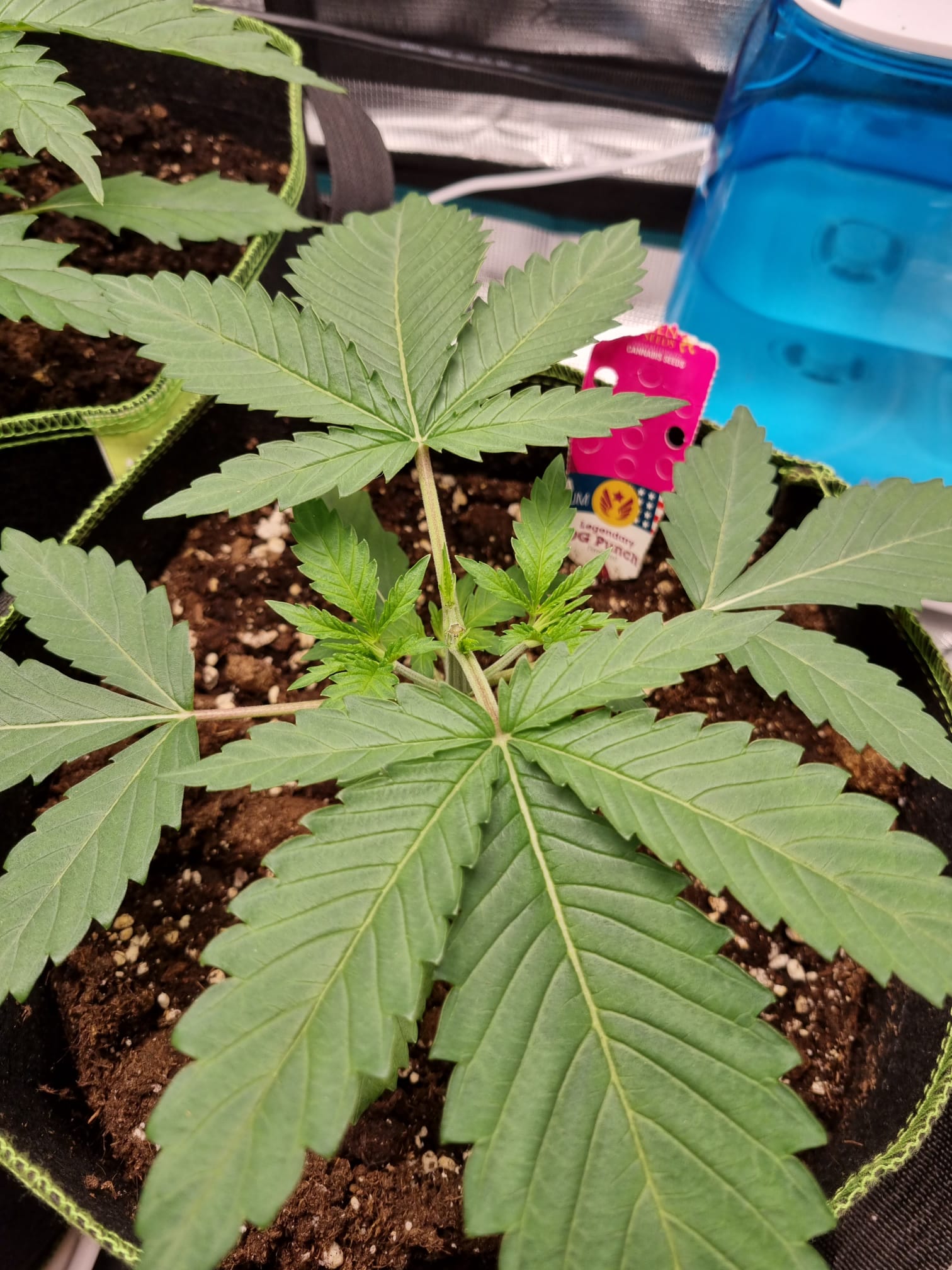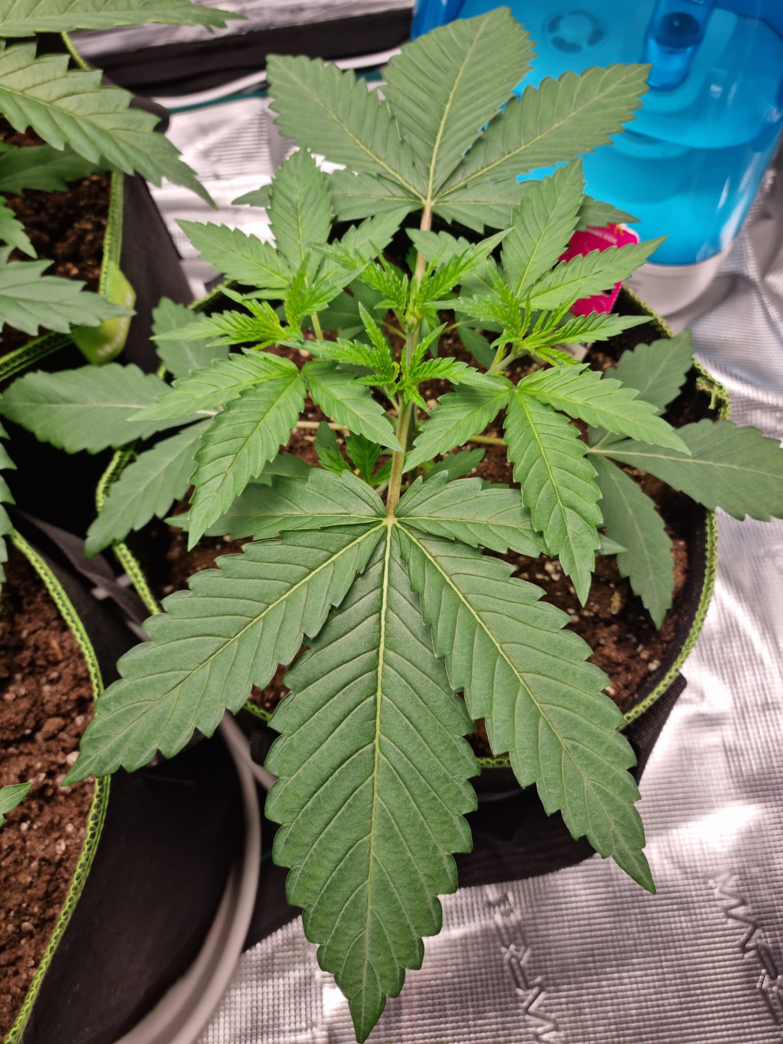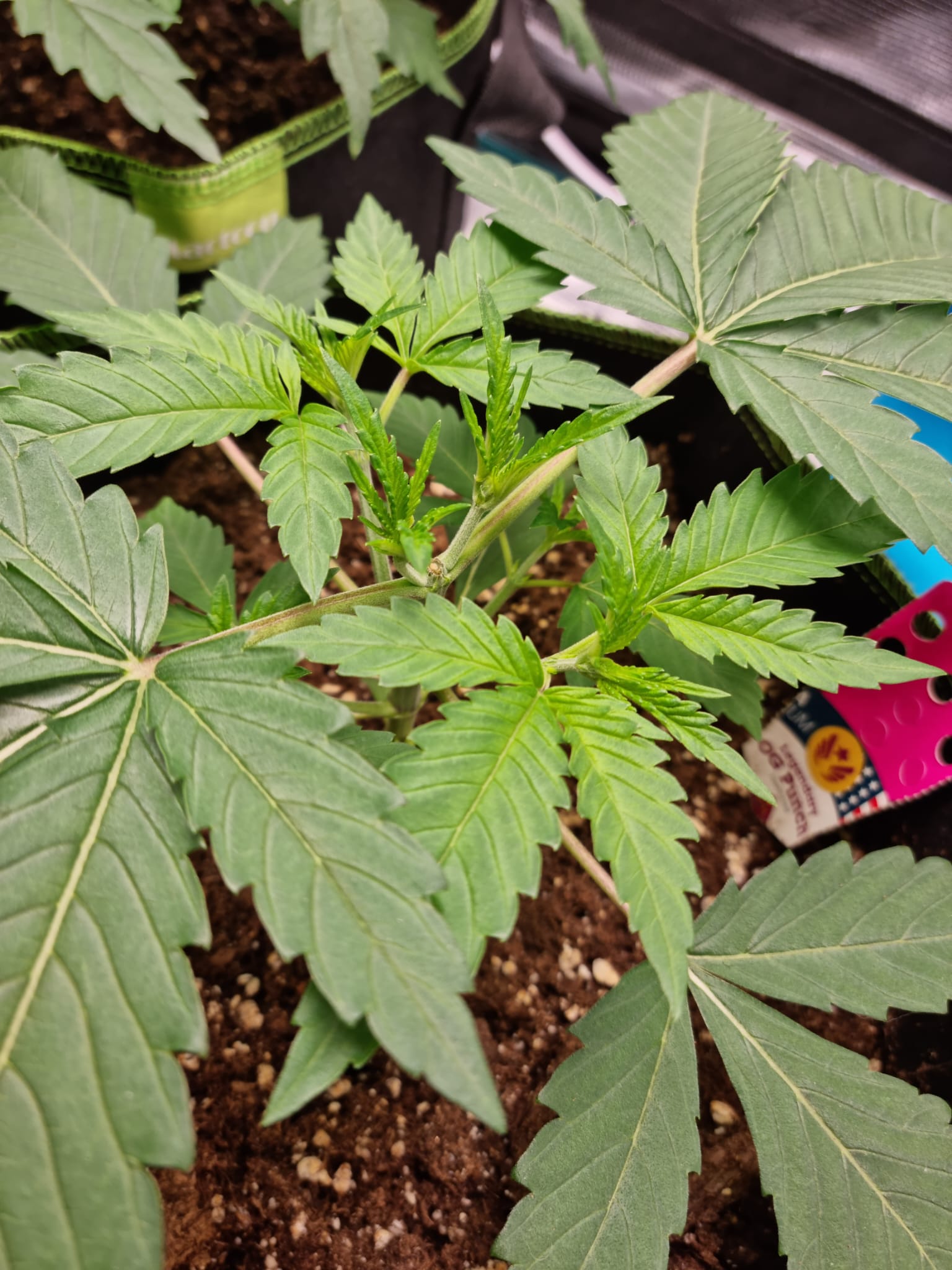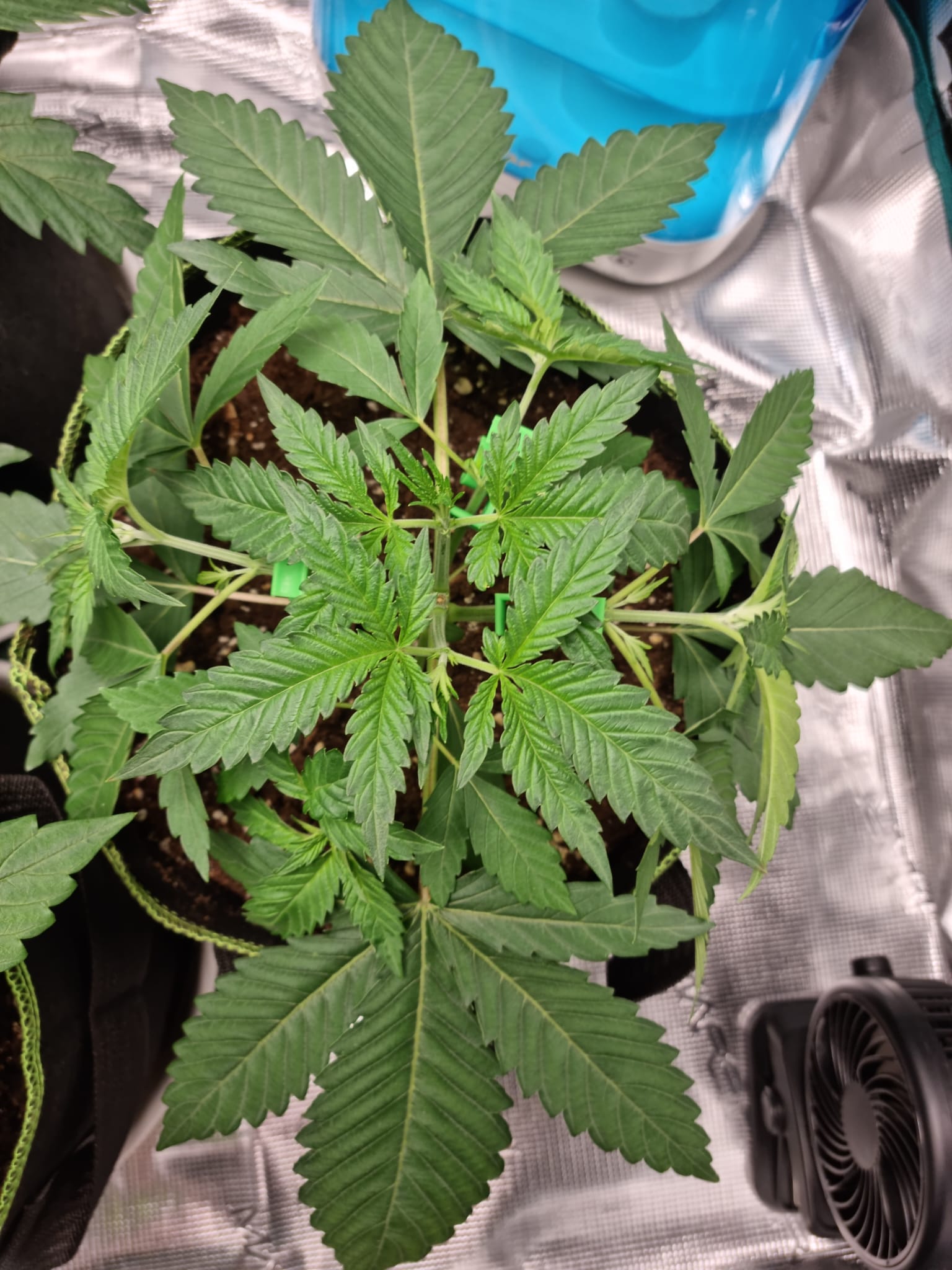 Lichtstärke habe ich aktuell bei ca. 250 ppfd, ich hatte zwischendurch mal kurz die Lichtintesität von aktuell 50% auf 70% gestellt bei 40cm Abstand, allerdings haben die beiden Legendary OG Punch Damen dann die Blätter hängengelassen und die linke Pflanze hat sich ein paar kleine Verfärbungen zugezogen.