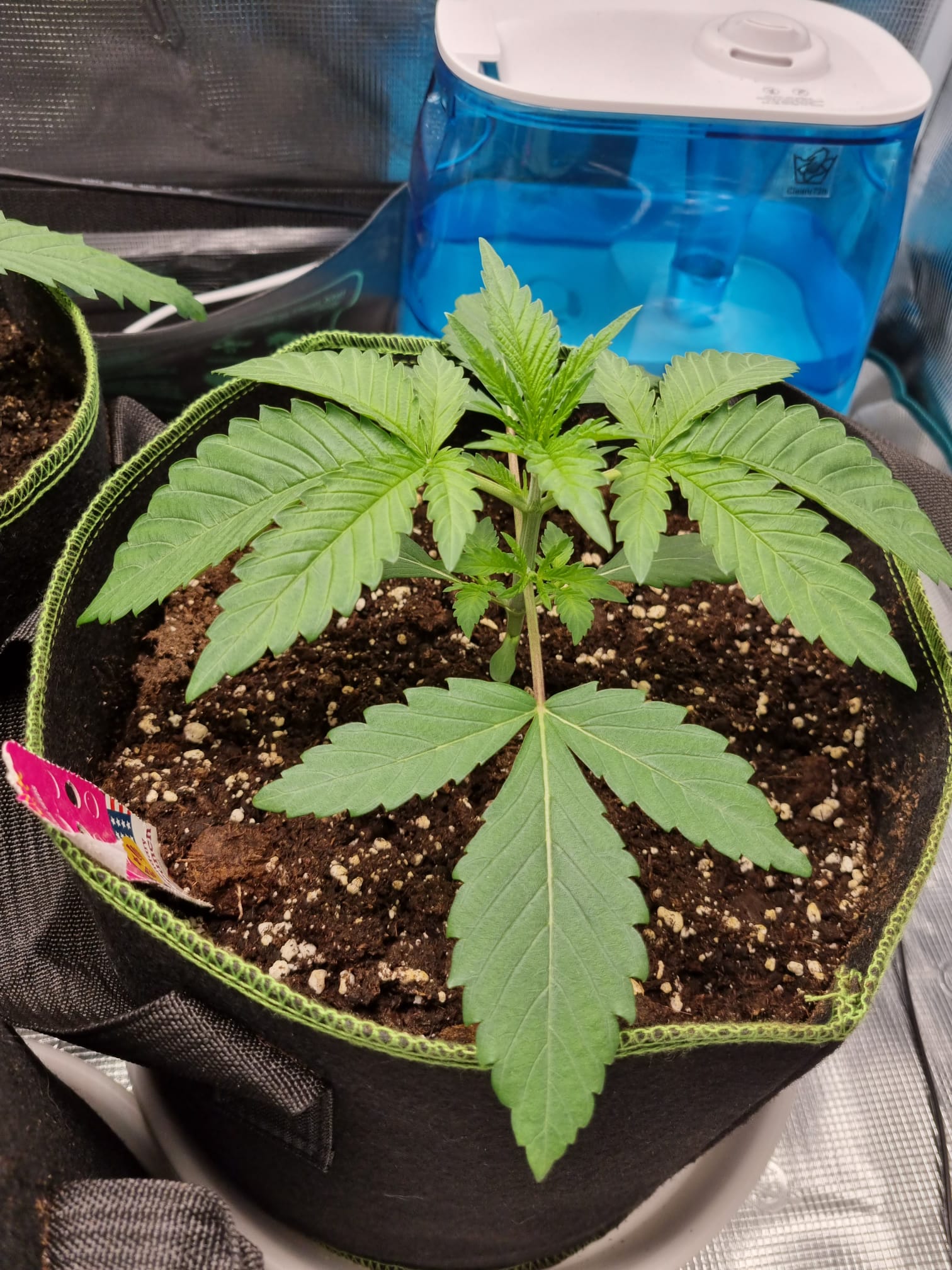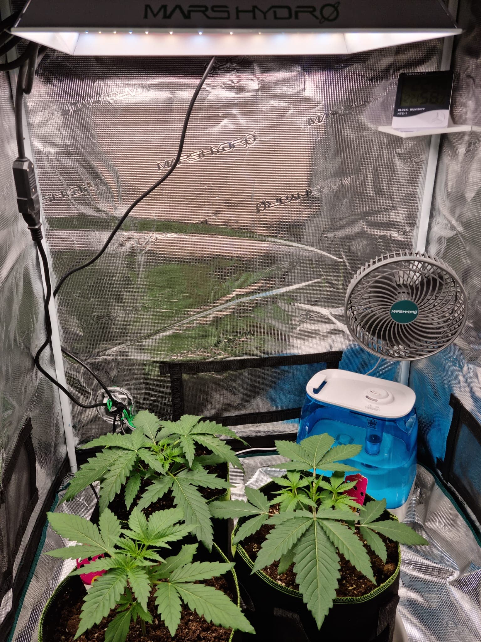 Ein oszilierender Clipventilator bläst auf das Blätterdach und ein kleiner Ventilator am Boden sorgt für ein bisschen Zirkulation. Außerdem stehen die Töpfe auf einer Heizmatte, die bis dato gute Leistungen erbracht hat. Ich brauche aktuell nichtmal den extra gekauften Luftbefeuchter zu benutzen, weil auch so immer eine RLF von 55-65% herrscht.