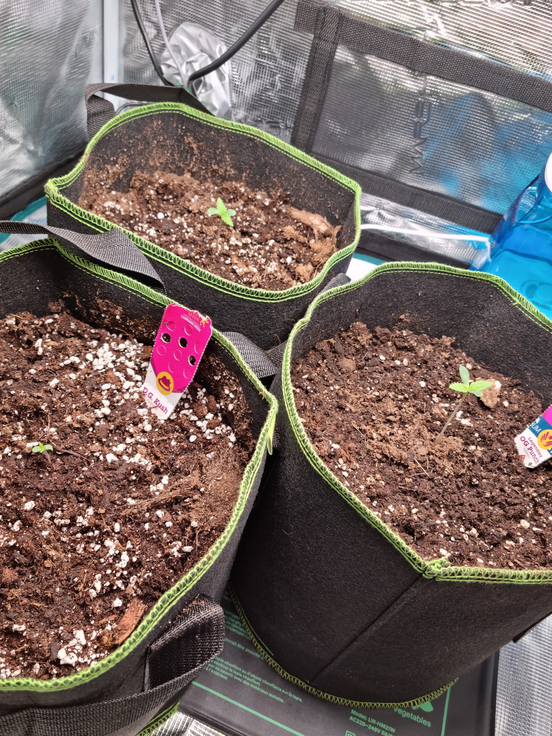 Zum Anfang wollte ich mit 3 Pflanzen beginnen, leider sind nur 2 Samen vom OG Purple gekeimt, deswegen habe ich mit 2 Tagen Versatz noch einen OG Kush Samen nachgeschoben. Dazu habe ich die Samen jeweils 24 Stunden in einem Wasserglas mit Mineralwasser aufgeweicht und dann zwischen zwei angefeuchteten Wattepads in einem Ziplockbag nochmals 12 Stunden an einem warmen und dunklen Ort platziert.
