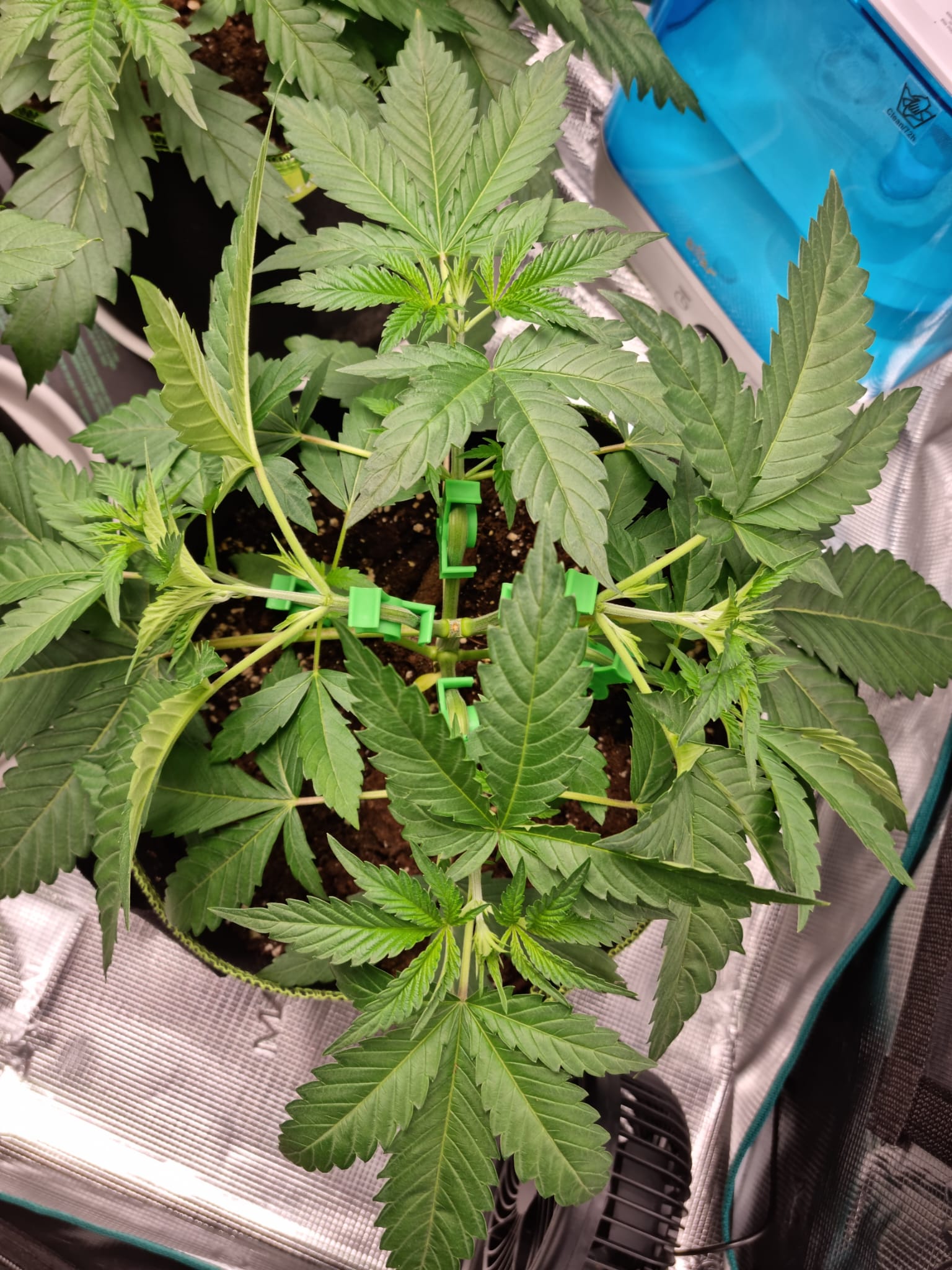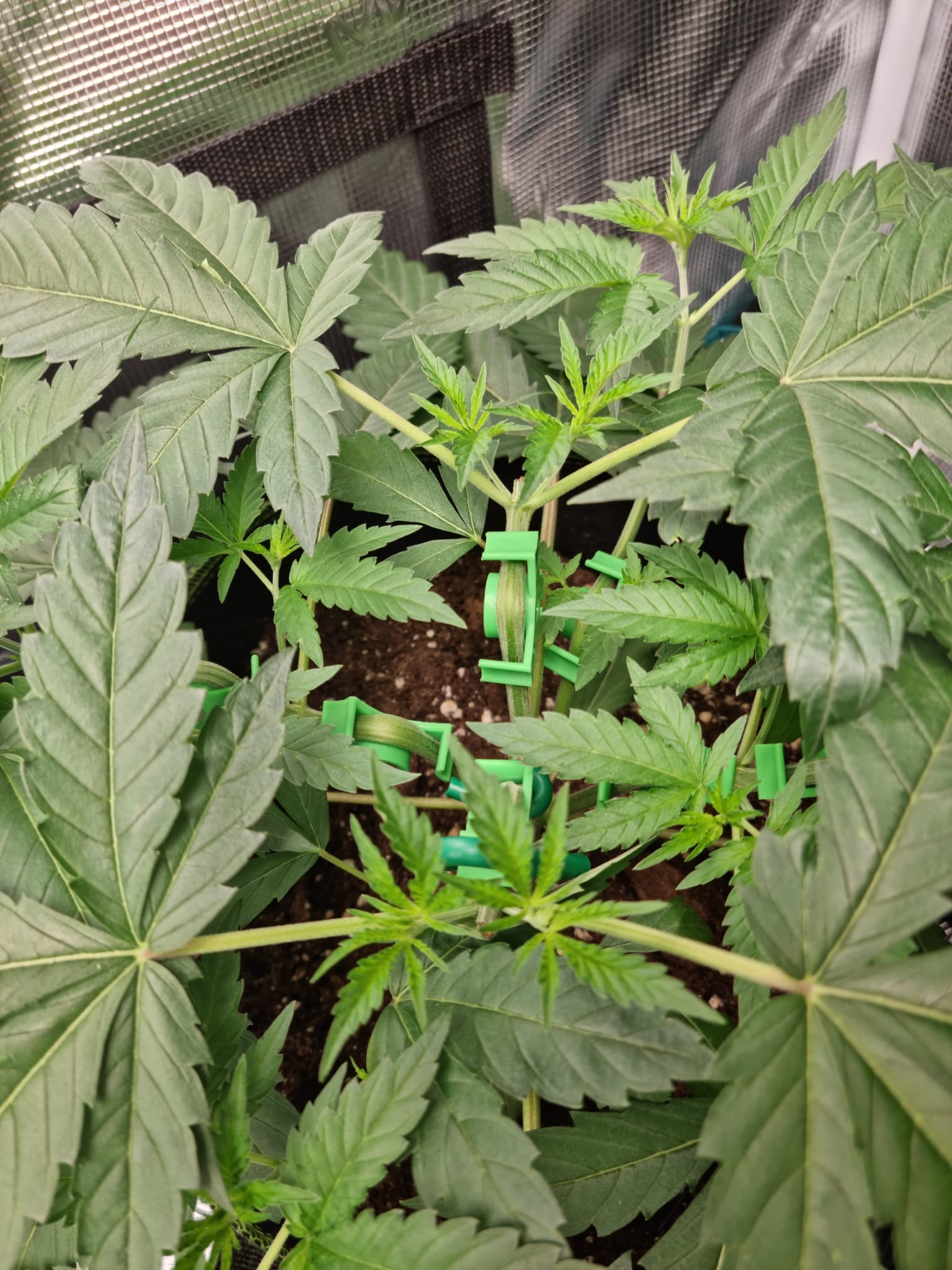 Heute habe ich mal die obersten Triebe beider Legendary OG Punch Damen mit LST geformt, um weiter eine gute Belüftung und Durchleuchtung beizubehalten.