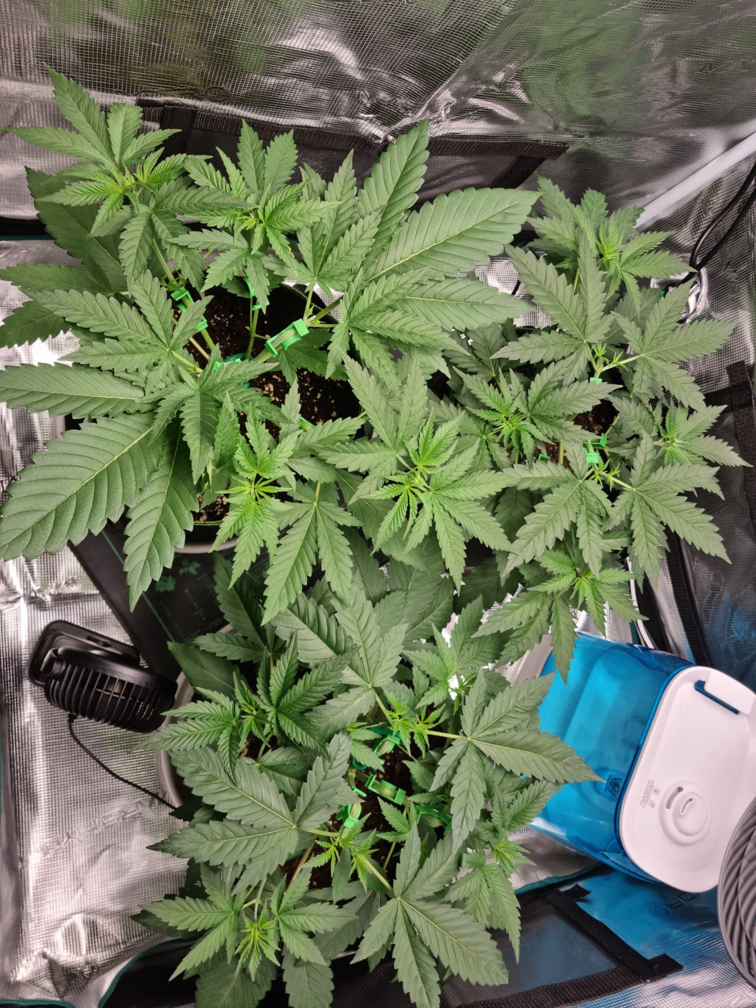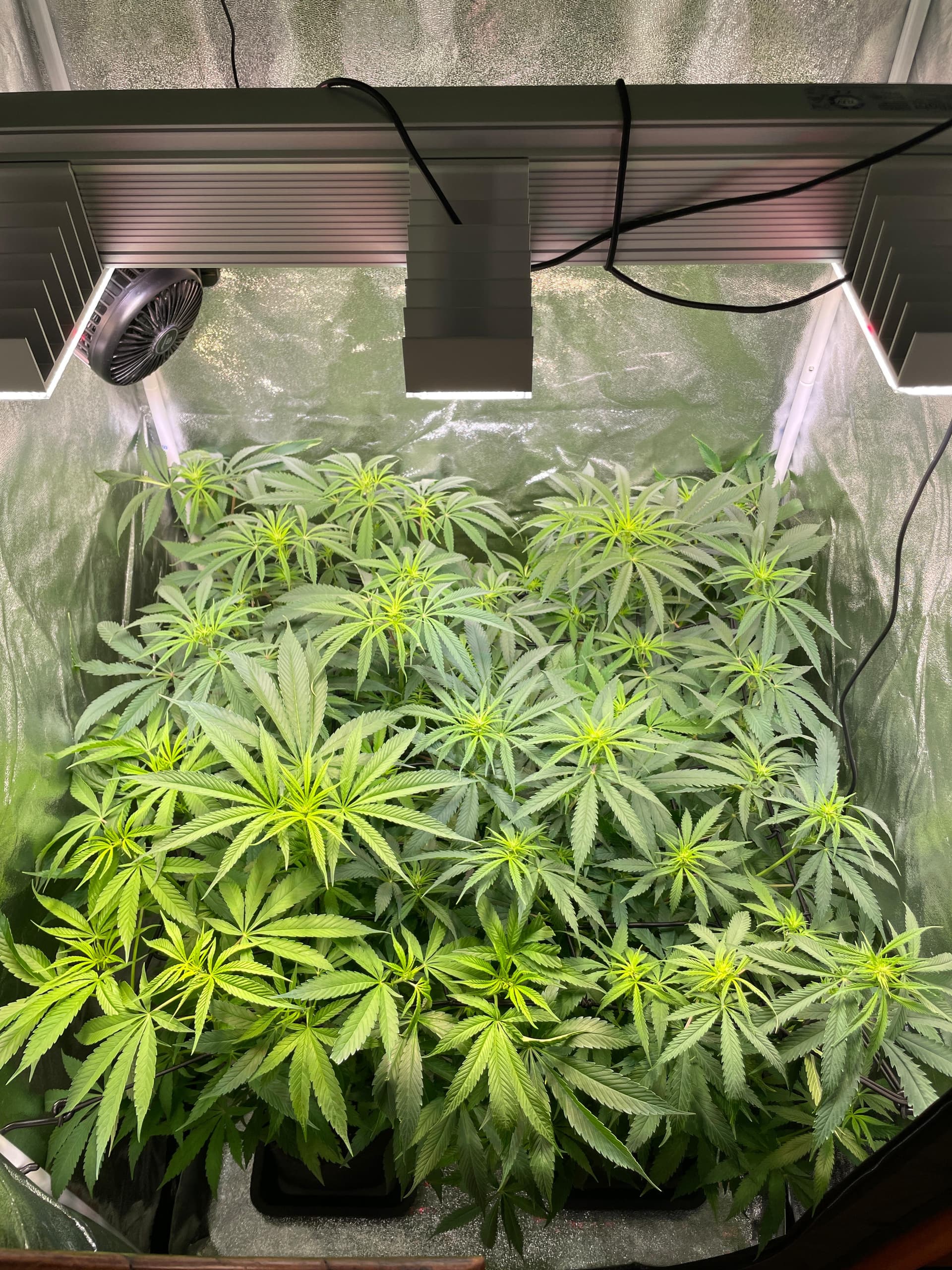 Hier mein Zelt, auch 80x80, 4 Pflanzen, mit Netz und LST das ganze Zelt ausgefüllt und Alle ungefähr auf einer Höhe