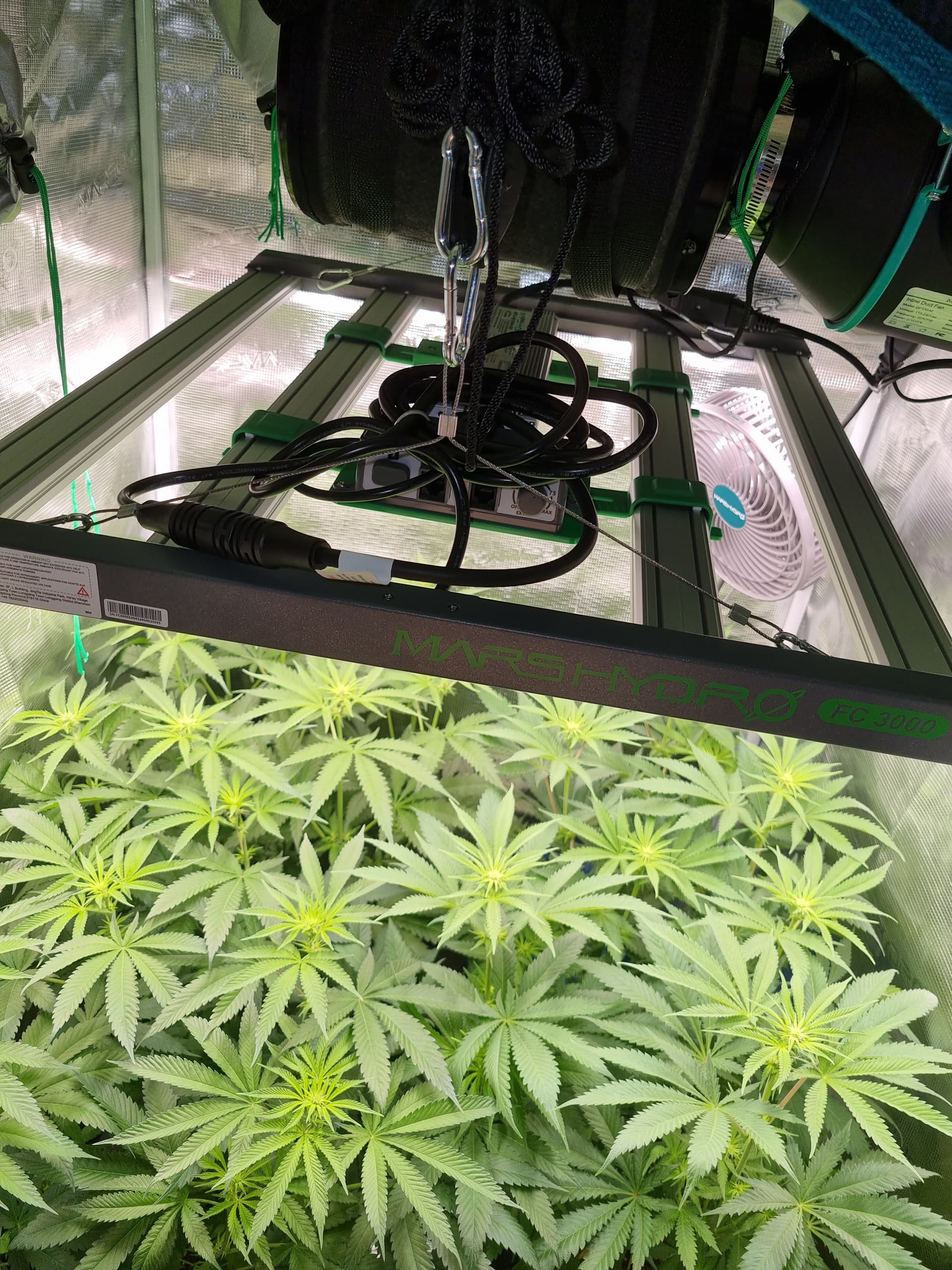 Die Lampe nimmt fast das komplette Zelt ein und verteilt das Licht mindestens doppelt so gut wie die TS1000. Die Blüten sind weiterhin gut am wachsen, habe das Licht jetzt Stück für Stück auf 70% erhöht, also ca. 200 Watt.