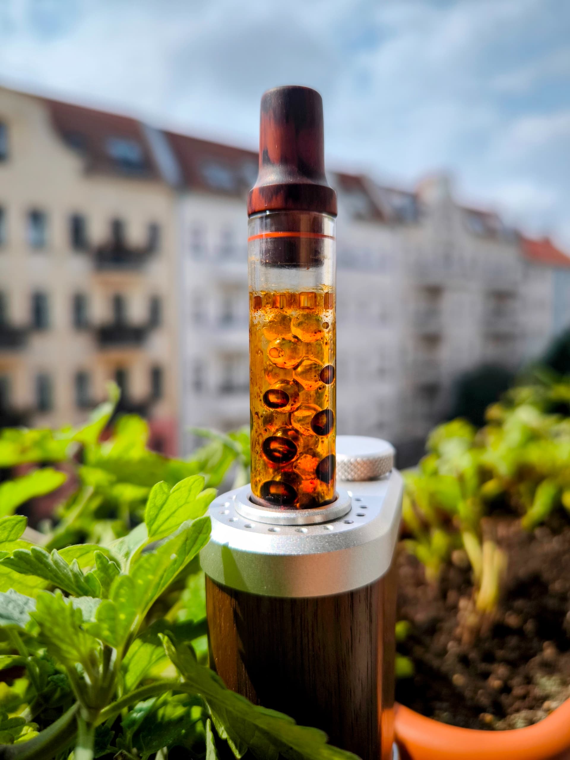 Einmal, in der Woche, wird der Stem in Pflanzenmilch (Wissenschaft!) ausgekocht. Die Glasperlen, das Sieb, der Stem - alles ist danach wieder blitzeblank.