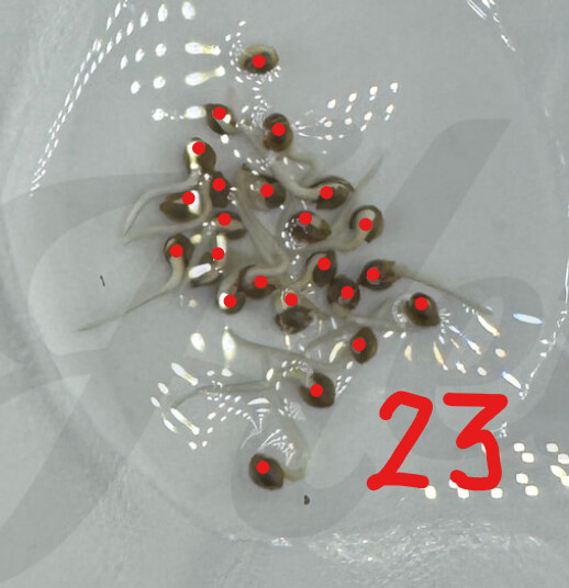 Wir nehmen 50 bis 100 Stück aus der Charge – immer eine statistisch relevante Stichprobe. Jeder Samen kommt in einen eigenen kleinen Wasserbehälter oder Aufzuchtbehälter. Und dann: abwarten.