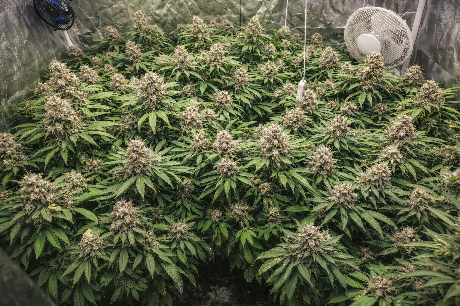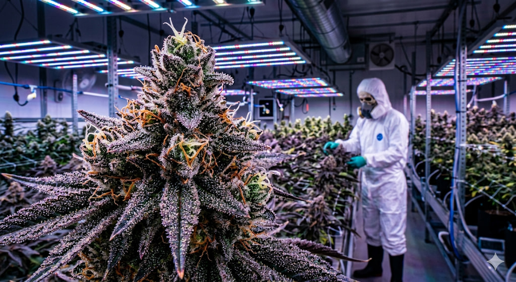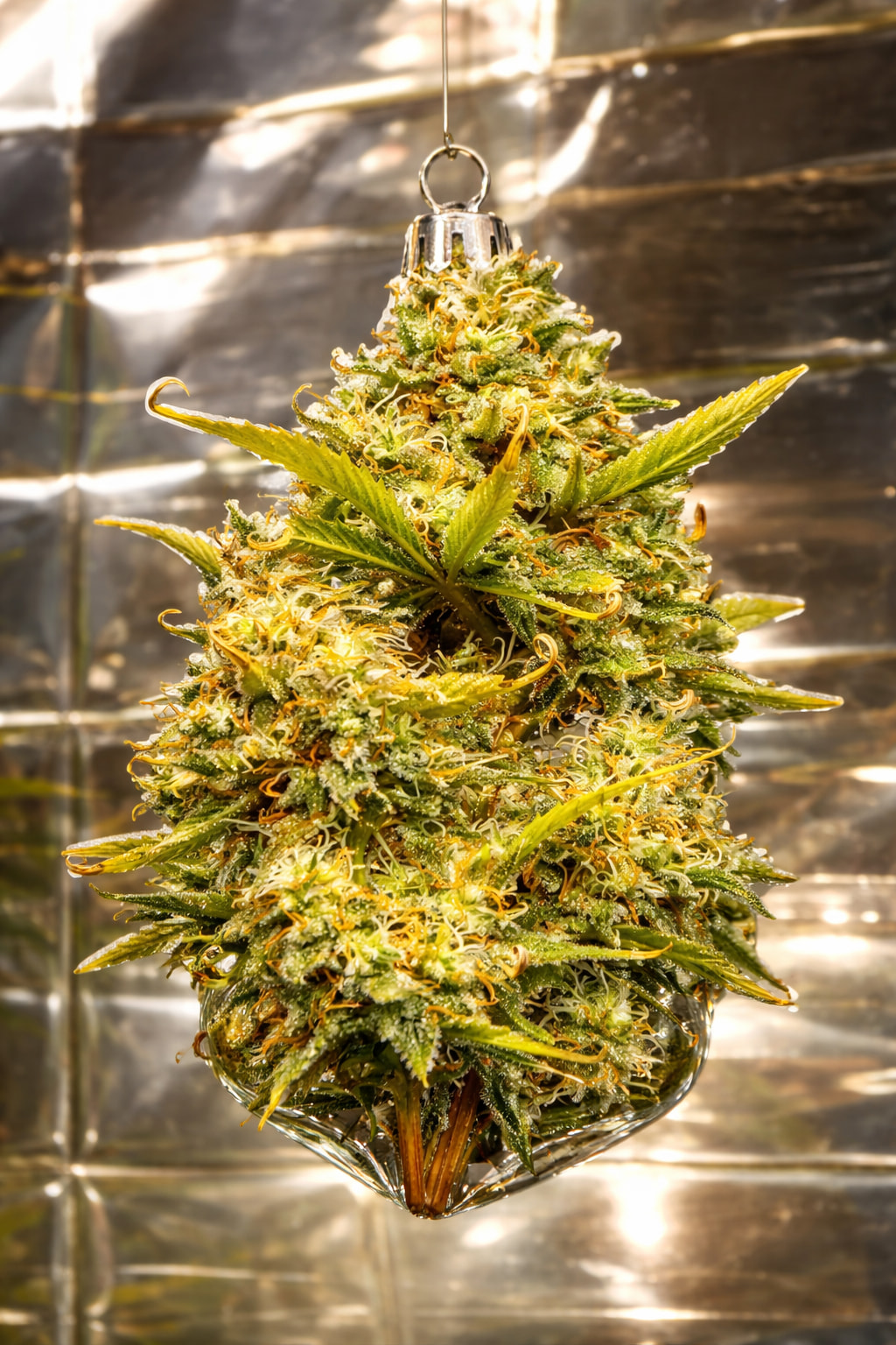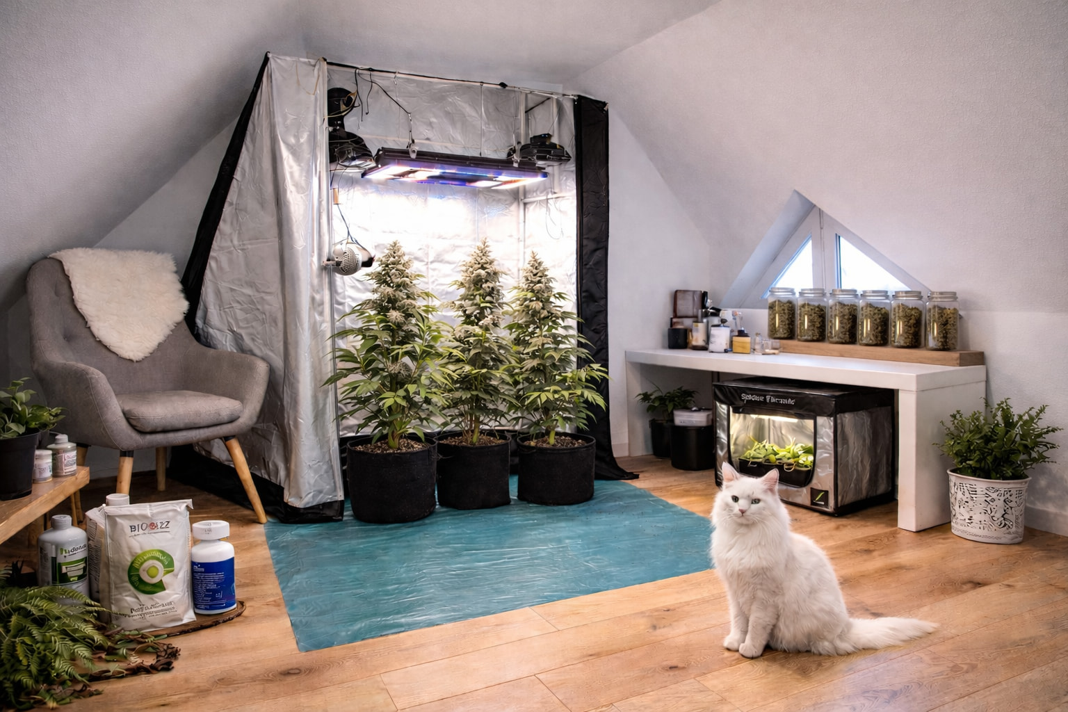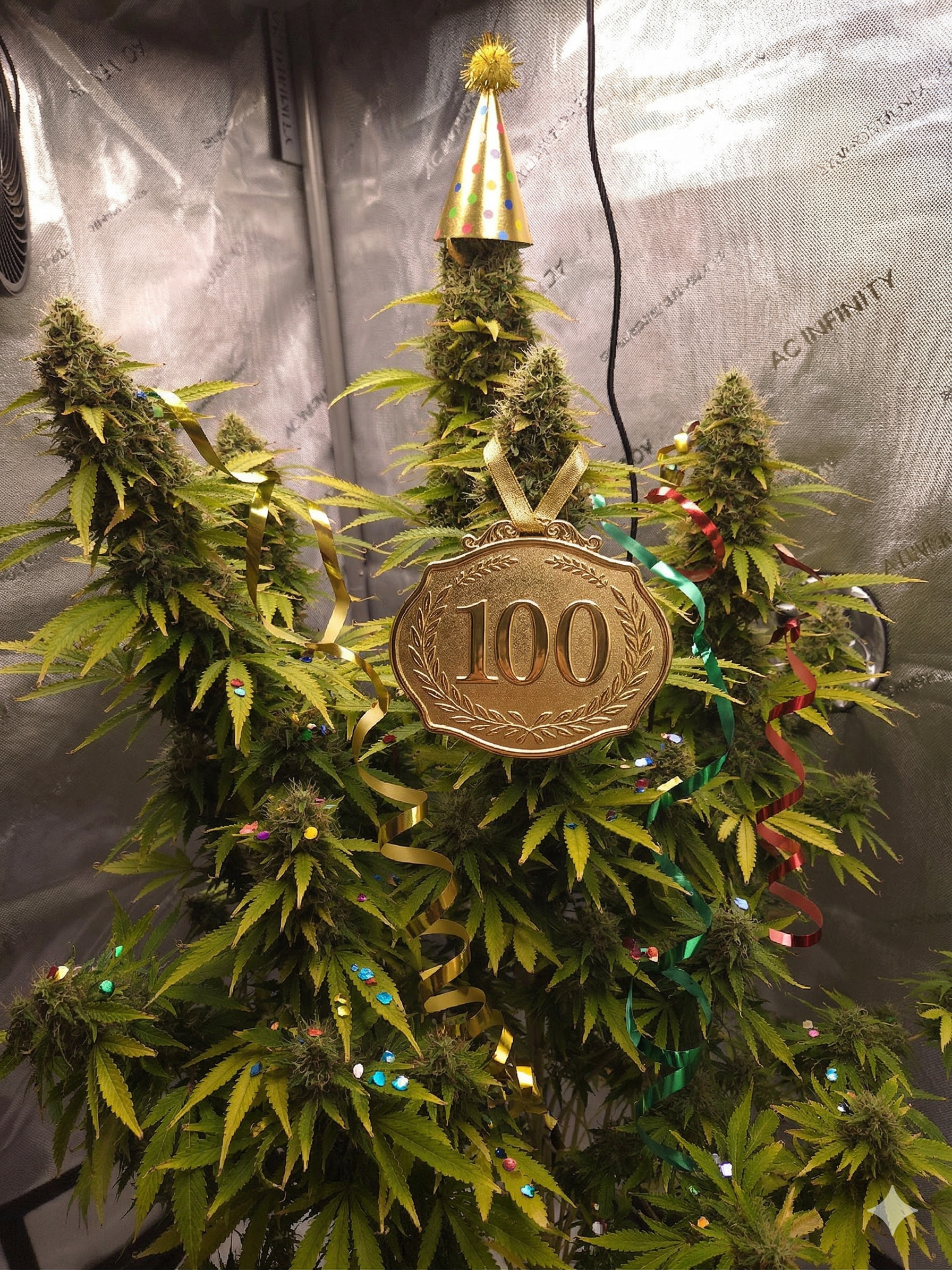 Ein richtiges Foto aus der Box, das mit KI-UnterstĂŒtzung bearbeitet wurde. KI: Nano Banana (Gemini). Die Pflanze ist eine âAuto Acapulco Goldâ von âBulk Feminized Seedsâ.