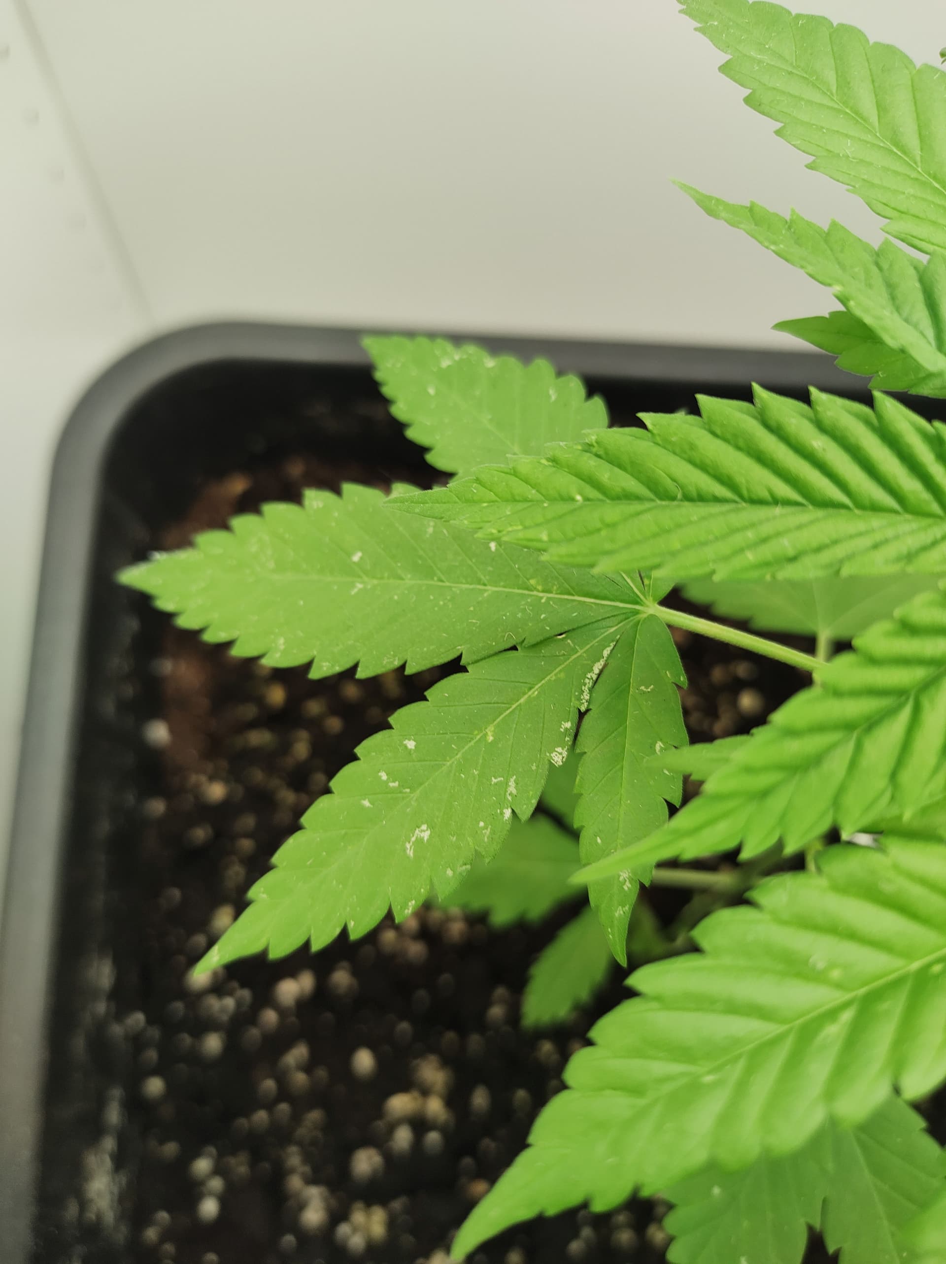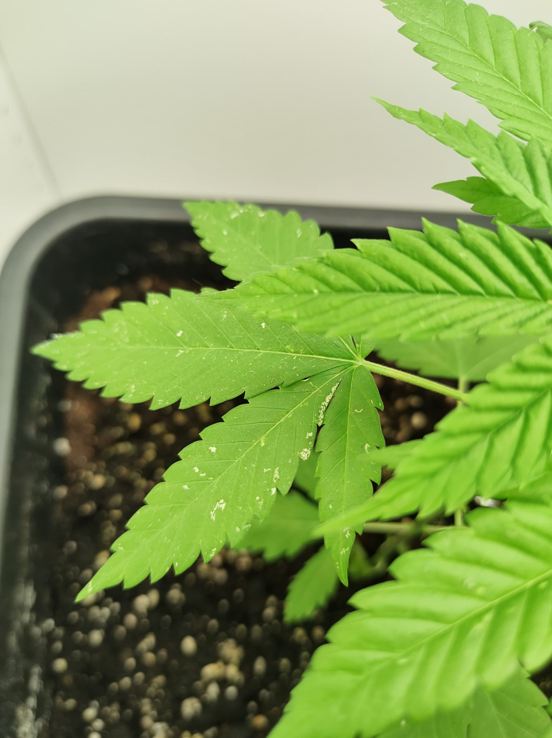 bei meiner 3 Wochen alten Pflanzen bilden sich weiße stellen an den Blättern nachdem ich sie in einen Growschrank gestellt habe. Davor stand sie noch draußen und hatte keine Probleme. Die Weißen stellen sind 2-3 Tage nach dem Umstellen in den Schrank aufgetreten. Als Dünger nutze ich momentan nur BioBizz Grow. Ich habe ihm Forum bereits nach ähnlichen Fällen gesucht und bin mir jetzt nicht sicher was davon es sein könnte, z.B. Thripse, Spinnenmilben oder Mehltau. Tiere sehe ich keine an der Pflanze auch nicht an der Blattunterseite.