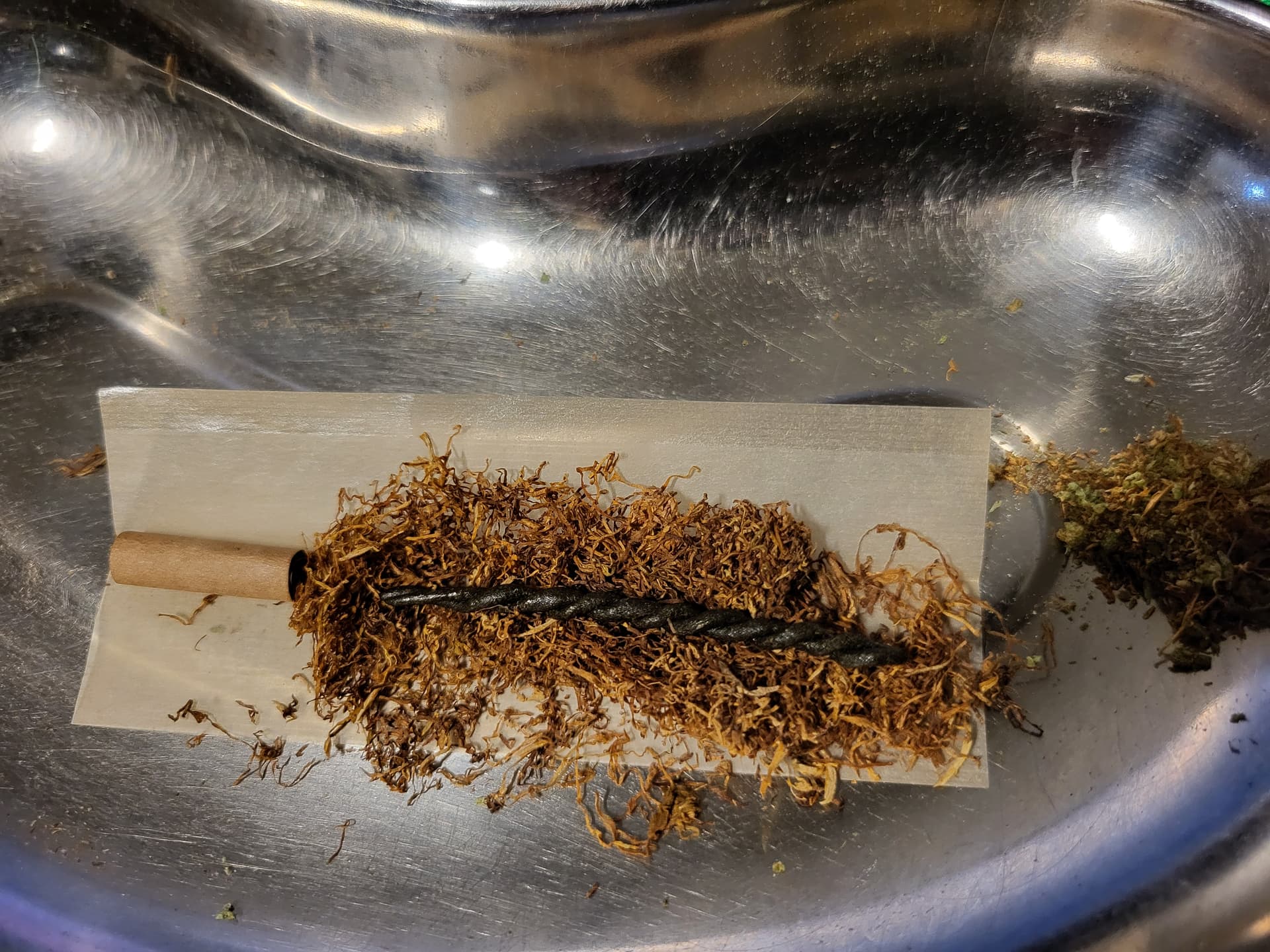 Wenn ich nur mit Tabak baue, so wie auf dem Foto, ist mir das zu viel Tabak. Deshalb mache ich so eine Wurst und leg die in einen Gras Joint. Ist halt echt selten, dass ich Hash rauche. Maximal 2 mal im Jahr. Dann wenn mein Homie meint, dass ich genau das Hash rauchen muss, weil es keine Ahnung was ist ![]()