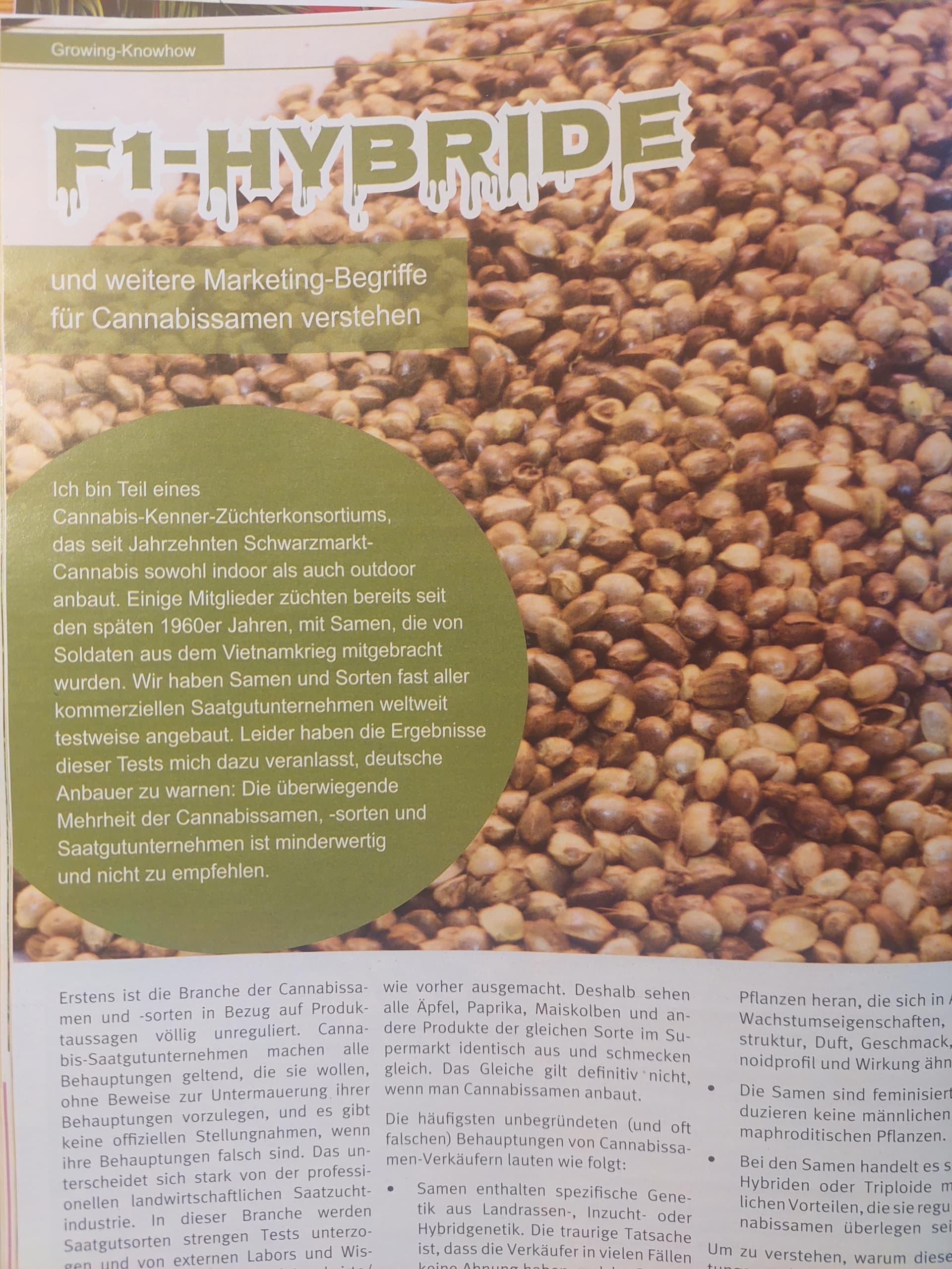 Der Autor, Steve Davis, geht dabei auf bestimmte Marketingstrategien der Samenhändler ein. Er beschreibt auch, dass es wohl keine Regeln oder Nachweispflichten gibt, wenn Hersteller und Verkäufer von Cannabissamen ihre Waren anbieten. Steve Davis bezieht sich im Artikel hauptsächlich auf den neuen Verkaufsschlager(?) F1-Hybride. Ich denke seine Kritik richtet sich aber damit auch an die Samenproduzenten/-verkäufer allgemein.