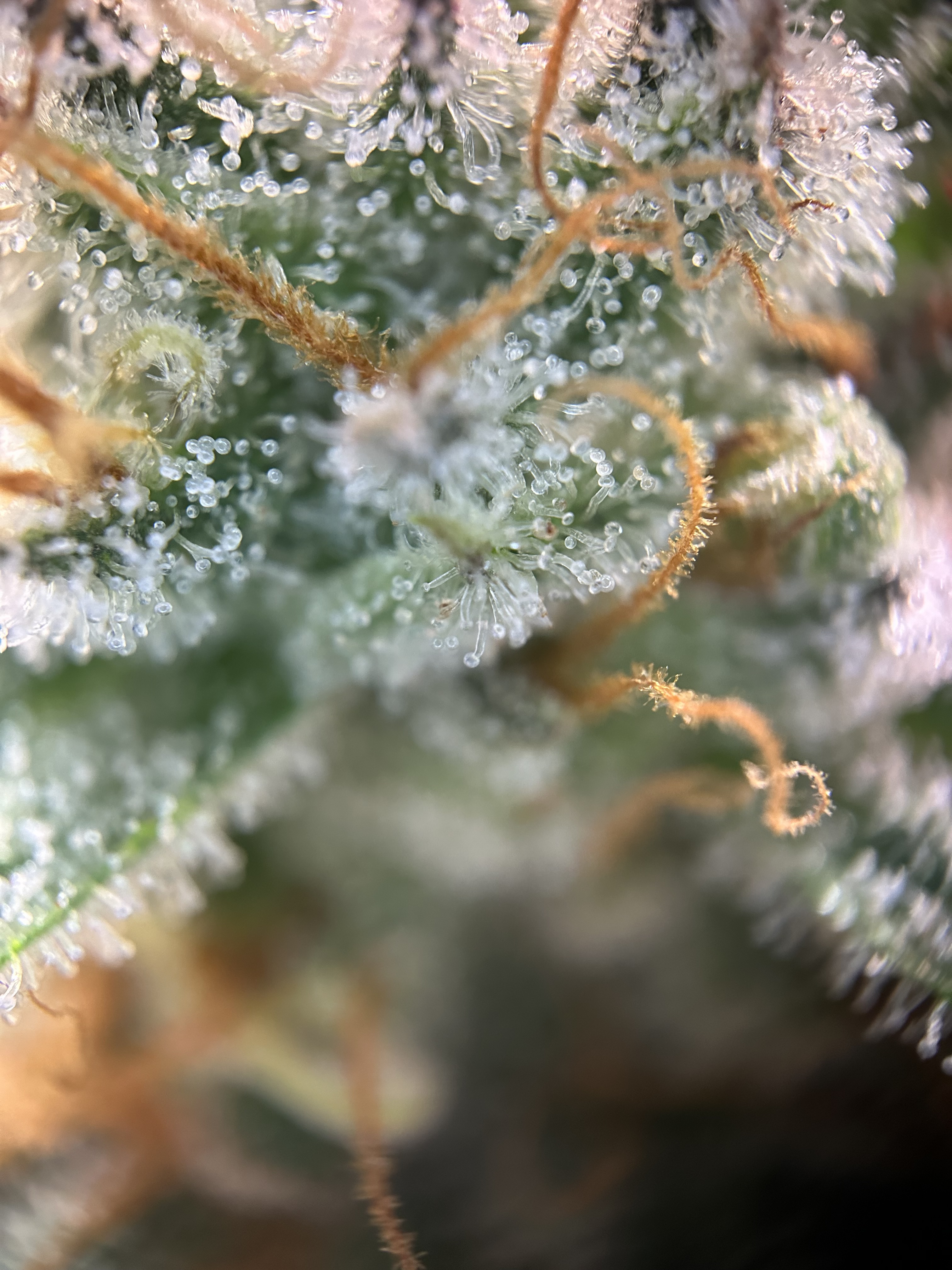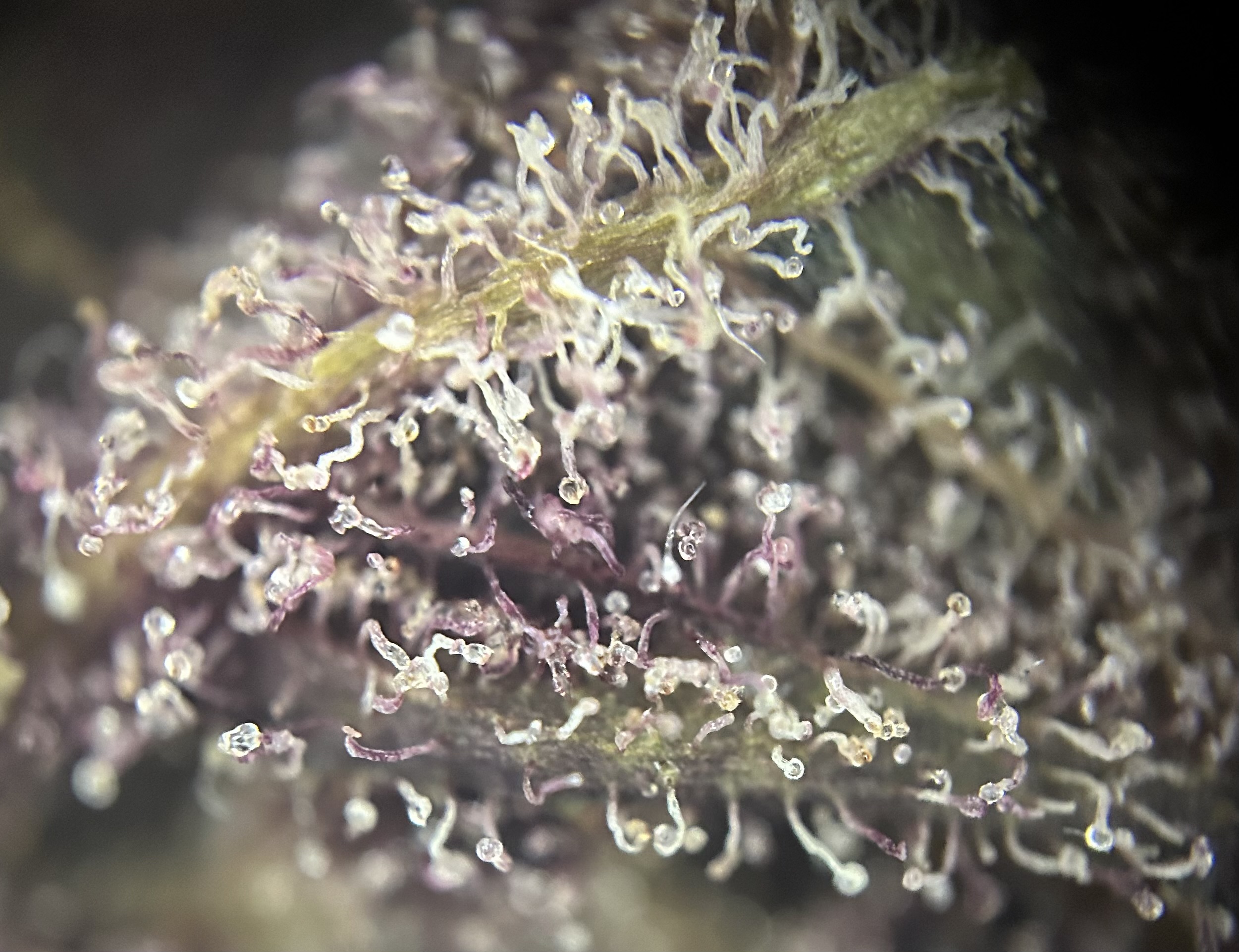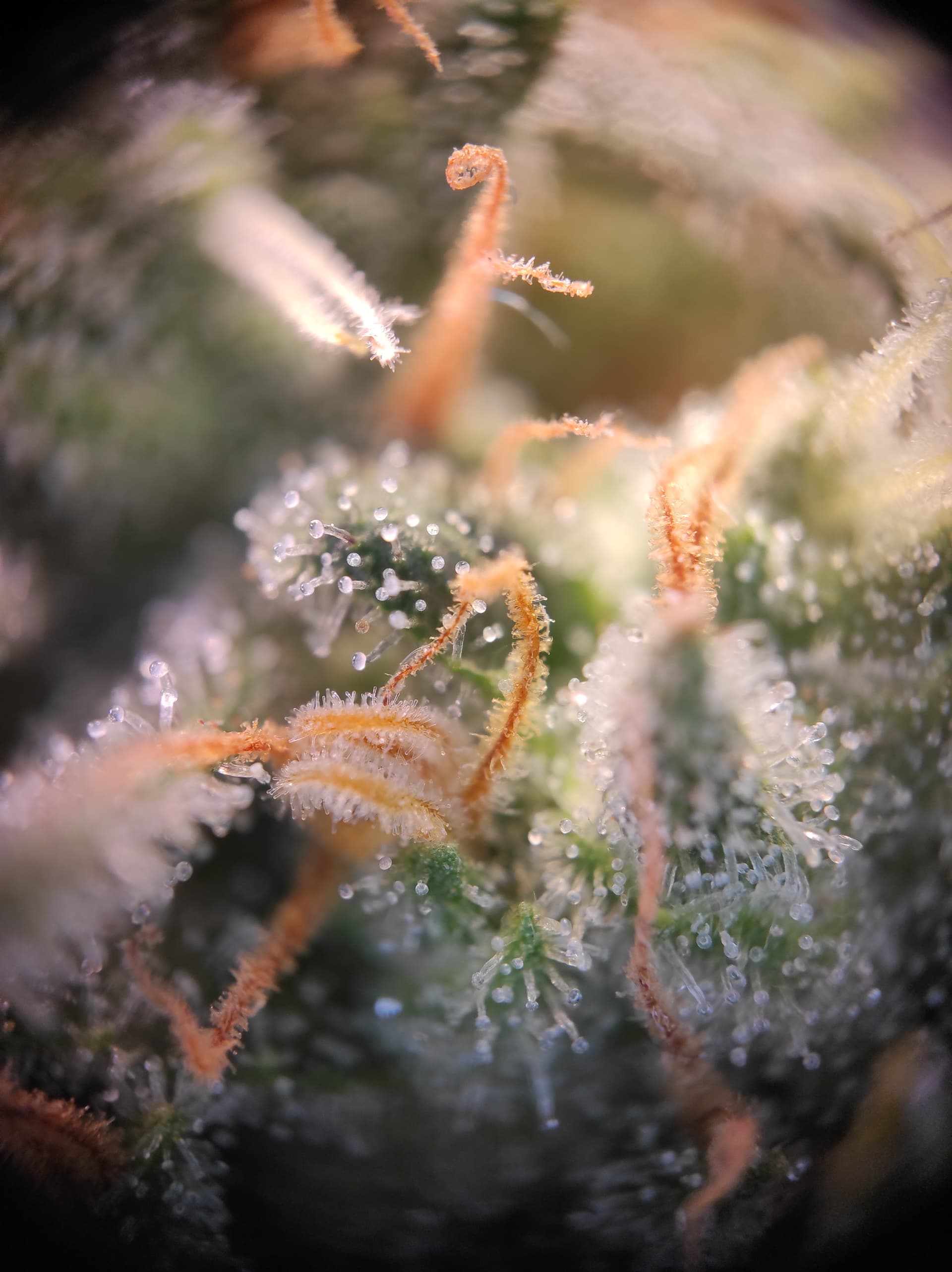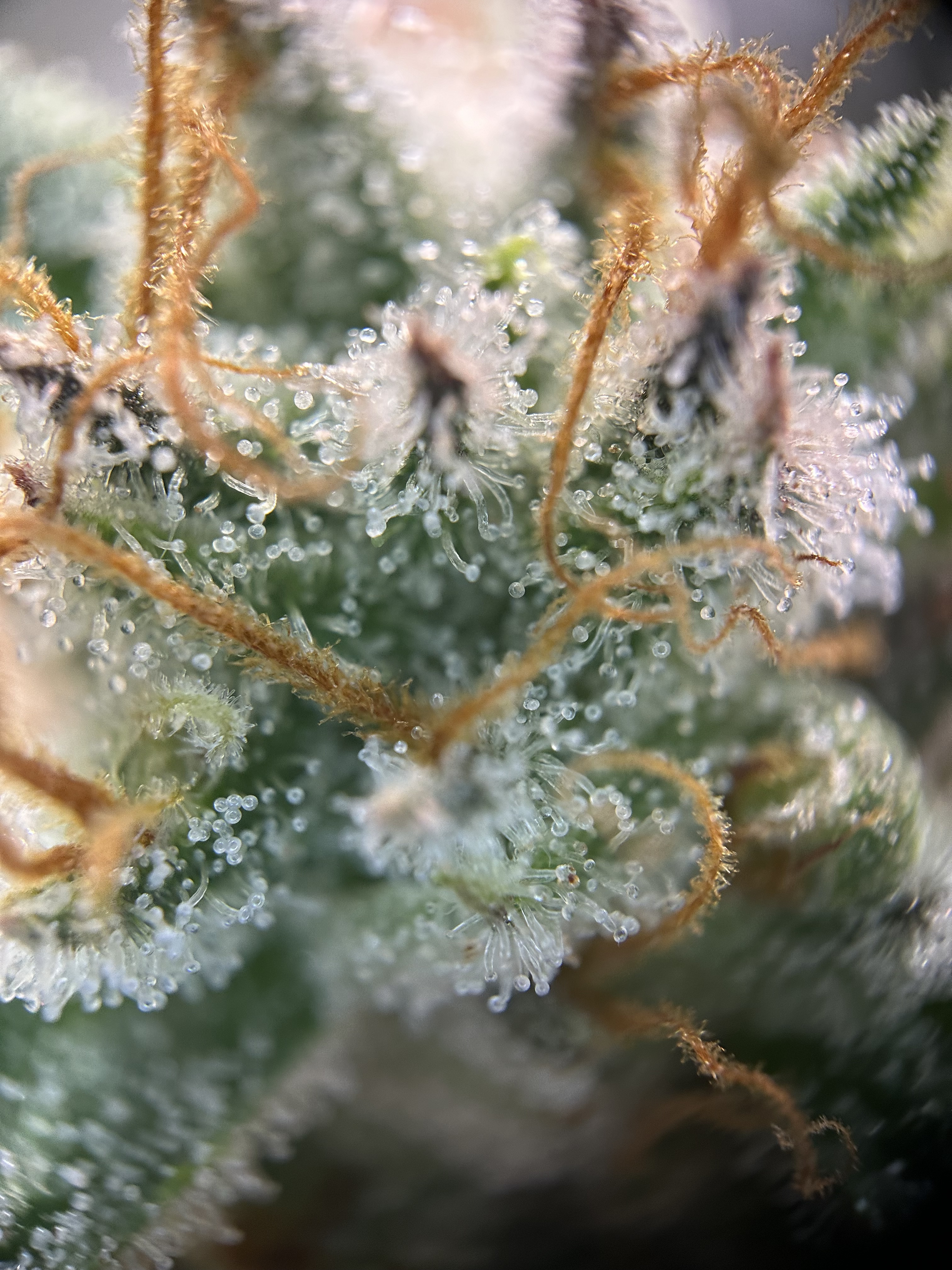 Die CBD-Blüte von gestern war ein schlechtes Beispiel und ich war zu weit weg. Wenn man richtig nah ran geht und frische, dicke Trichomköpfchen fotografiert, geht da schon noch was.