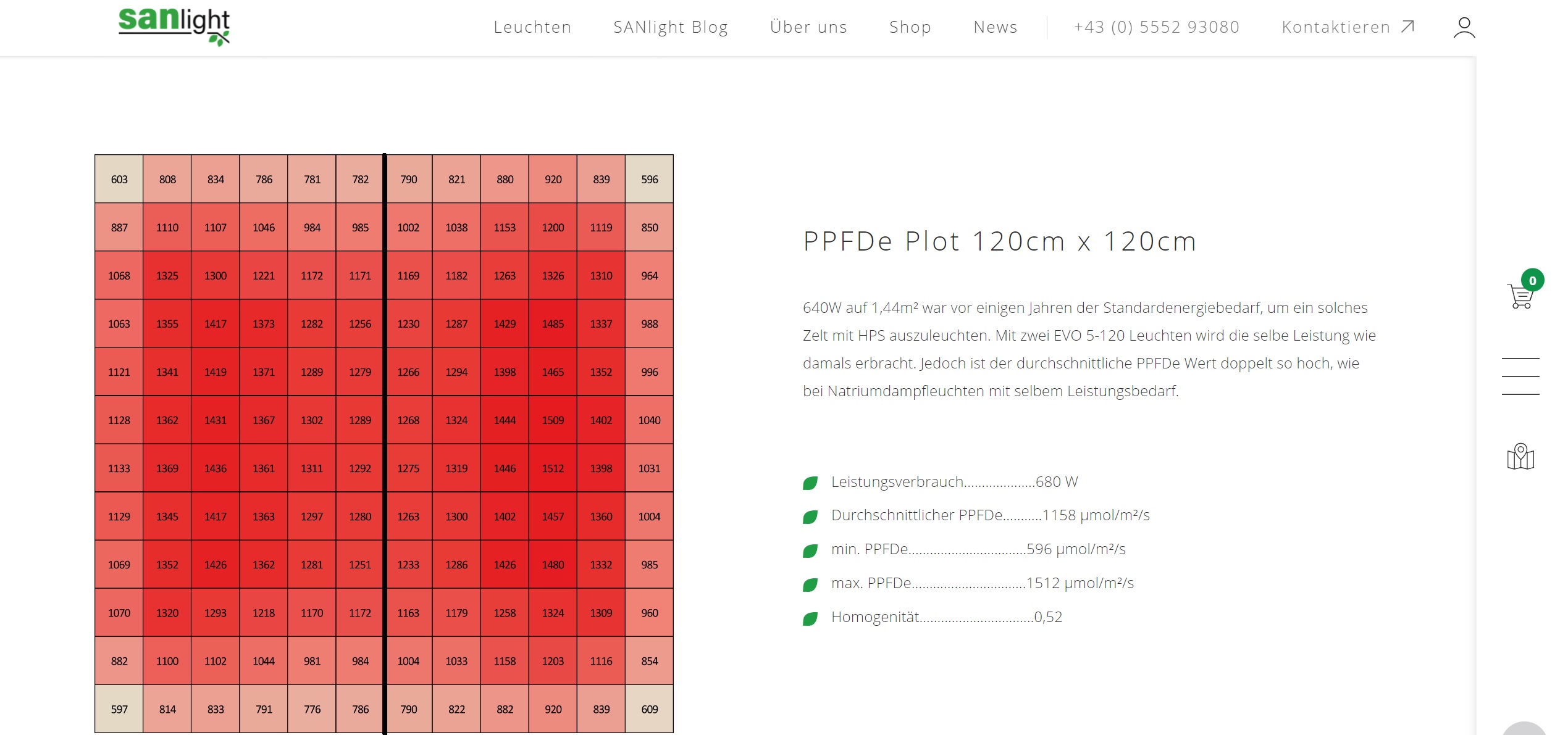 Hier die Daten mit 2x der besagten Lampe auf 120x120 mit 30cm Abstand zur Pflanze und 100% Leistung. Ich habe ja sozusagen die Hälfte und mir ist bewusst das ich mit einer Lampe nicht auf die Höchstwerte komme. Nehme ich jetzt aber den durchschnittlichen Wert (1158 µmol/m²/s) als Höchstwert und arbeite anfangs logischerweise mit 40%, komme ich ja auf einen Wert von 463,2 µmol/m²/s bei ebenfalls 30cm Abstand.