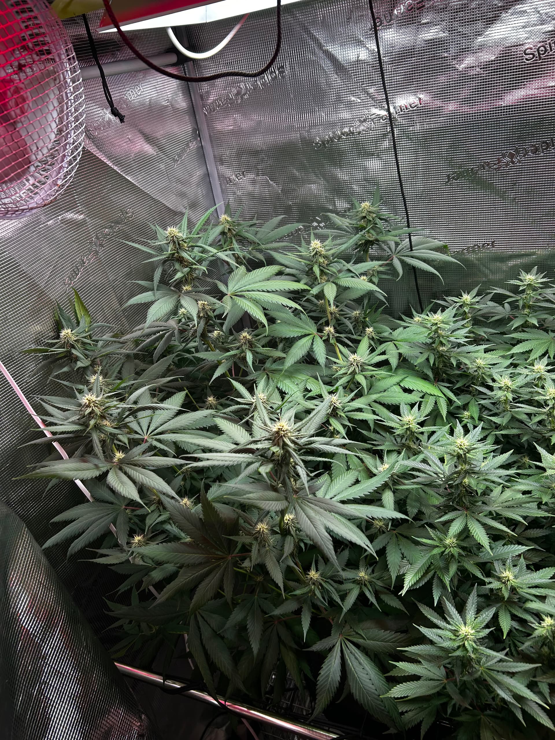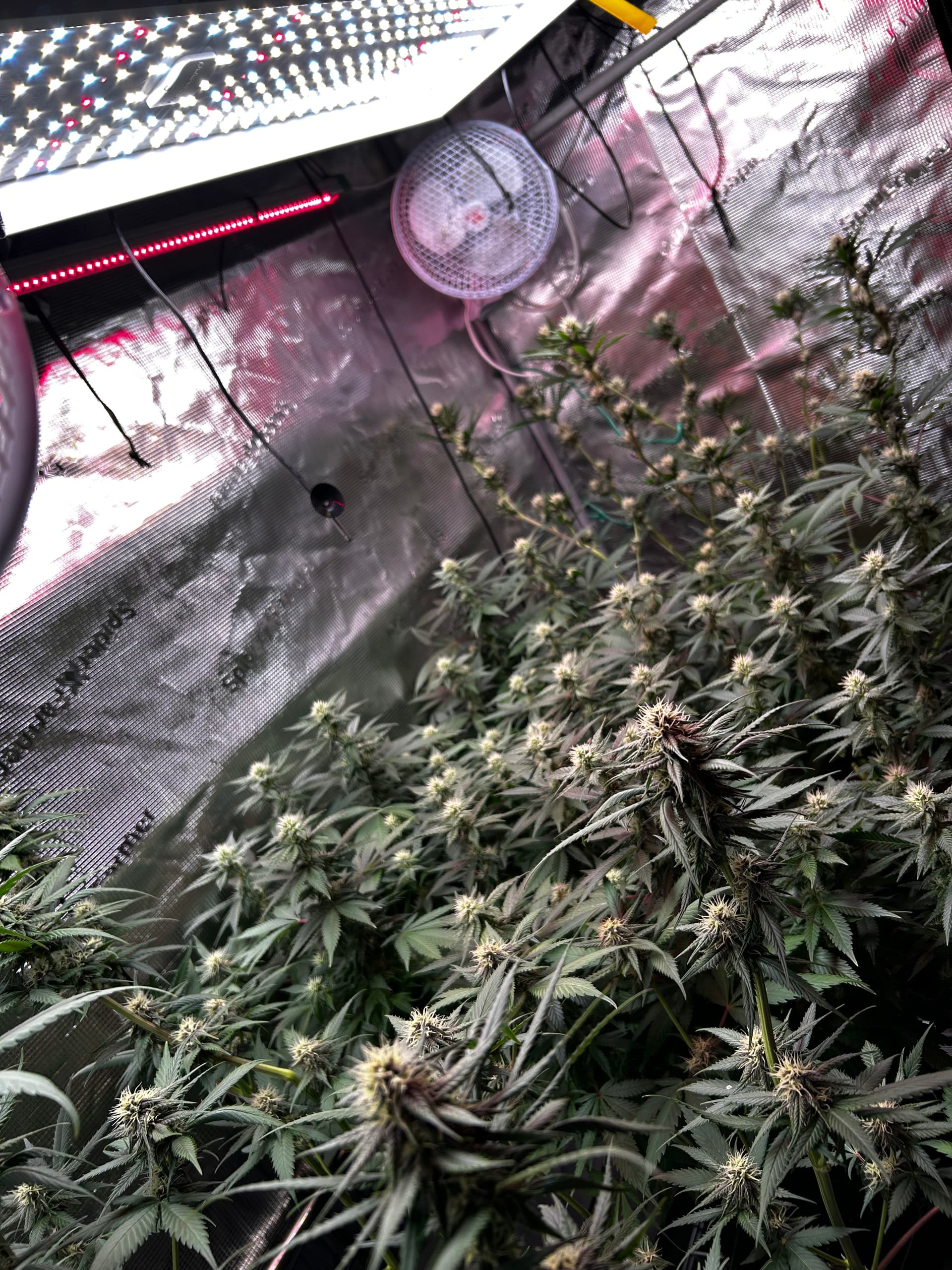 Aktuell läuft die TSL auf 100 %, Abstand in der Mitte so ca. 40 cm, an den Seiten eher 20–25 cm. Da das Licht außen eh weniger intensiv ankommt, ist das so gewollt – näher dran gleicht das gut aus. Die Red 55 läuft auch, bringt aber mit ihren ~50 W nur einen kleinen PPFD-Boost. Passt aktuell ganz gut alles.