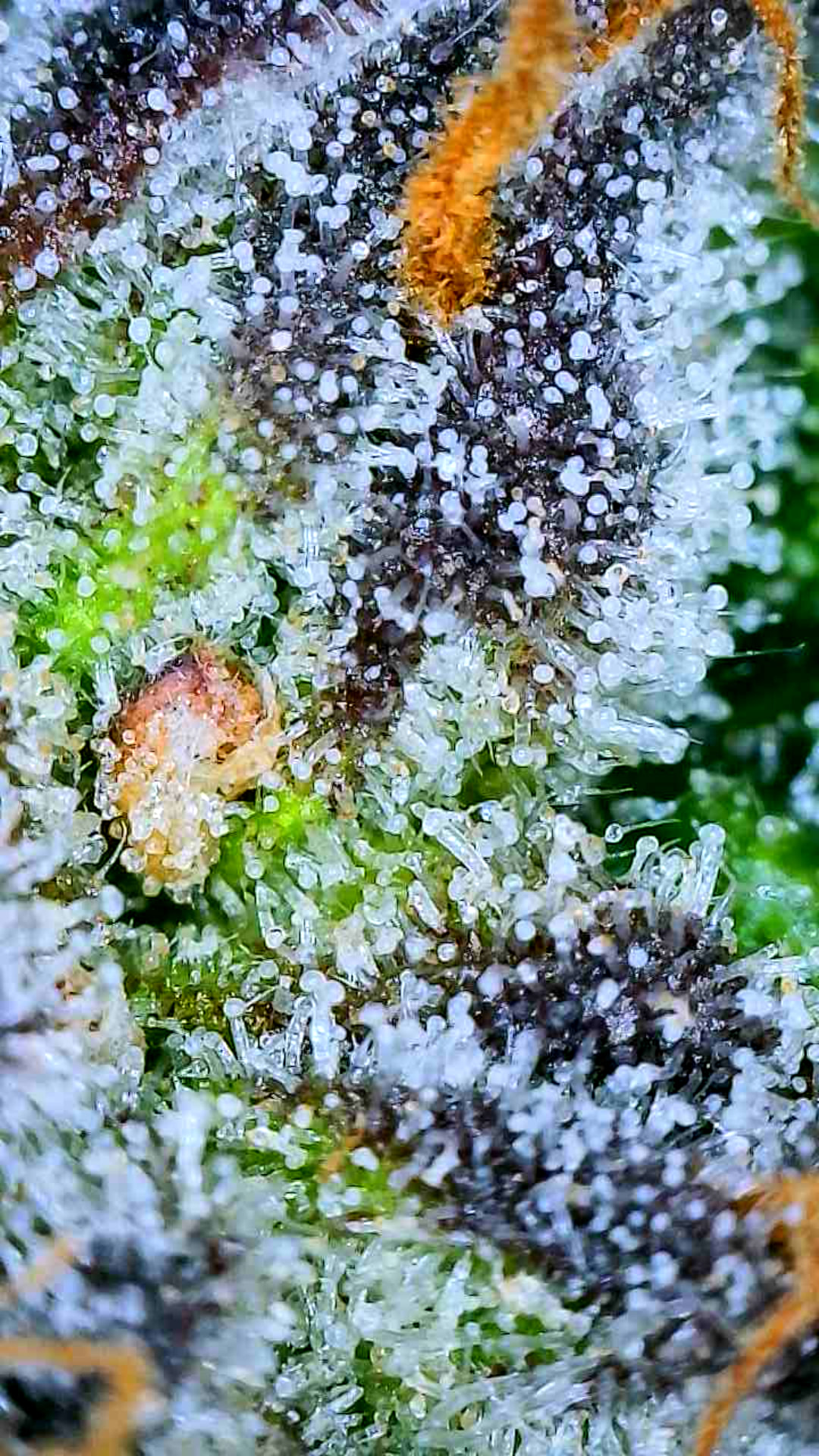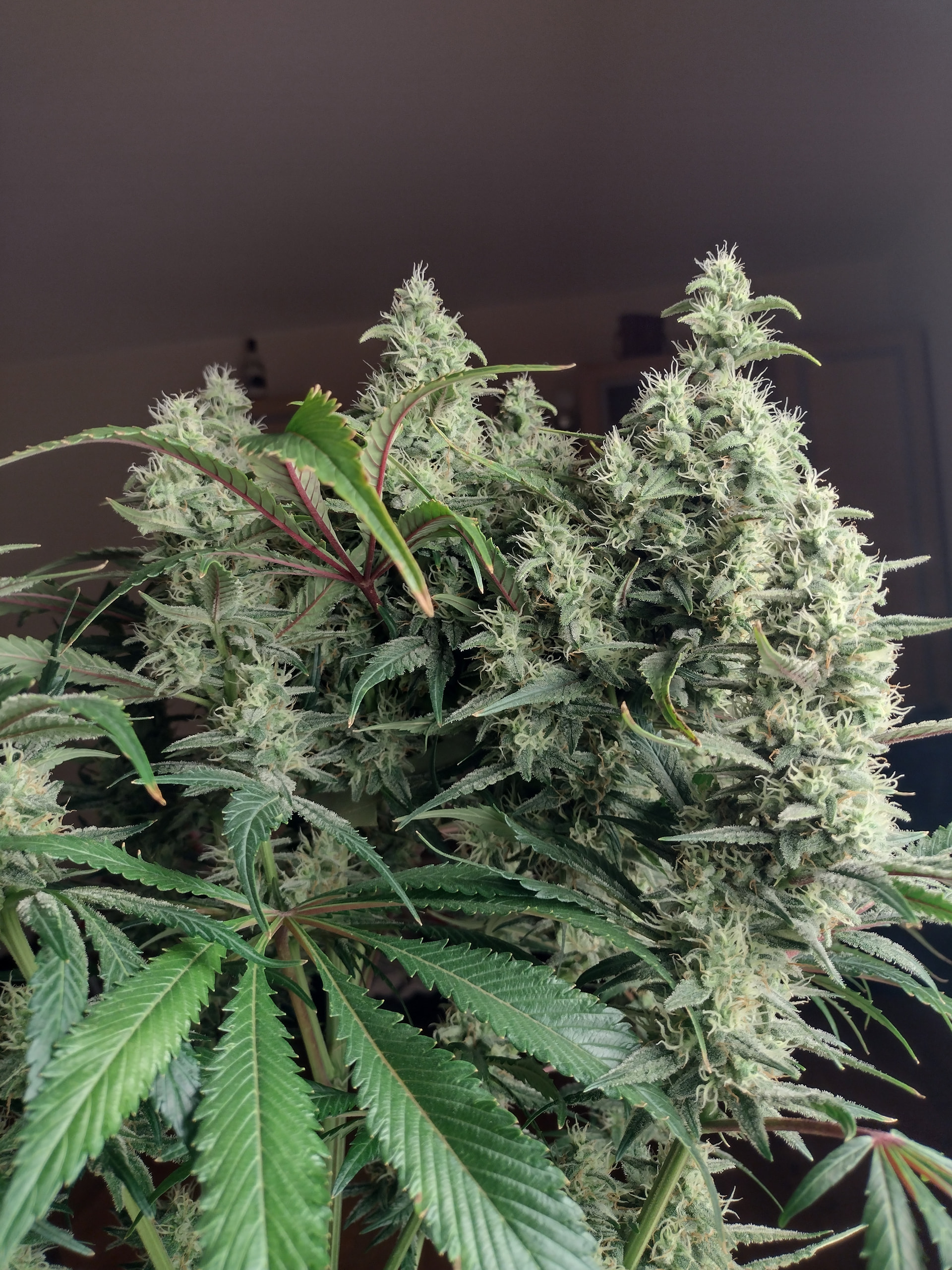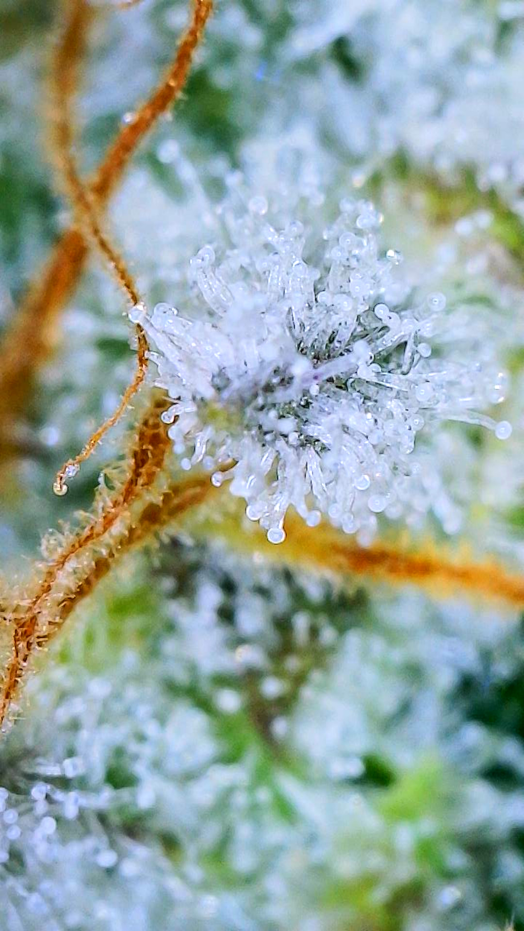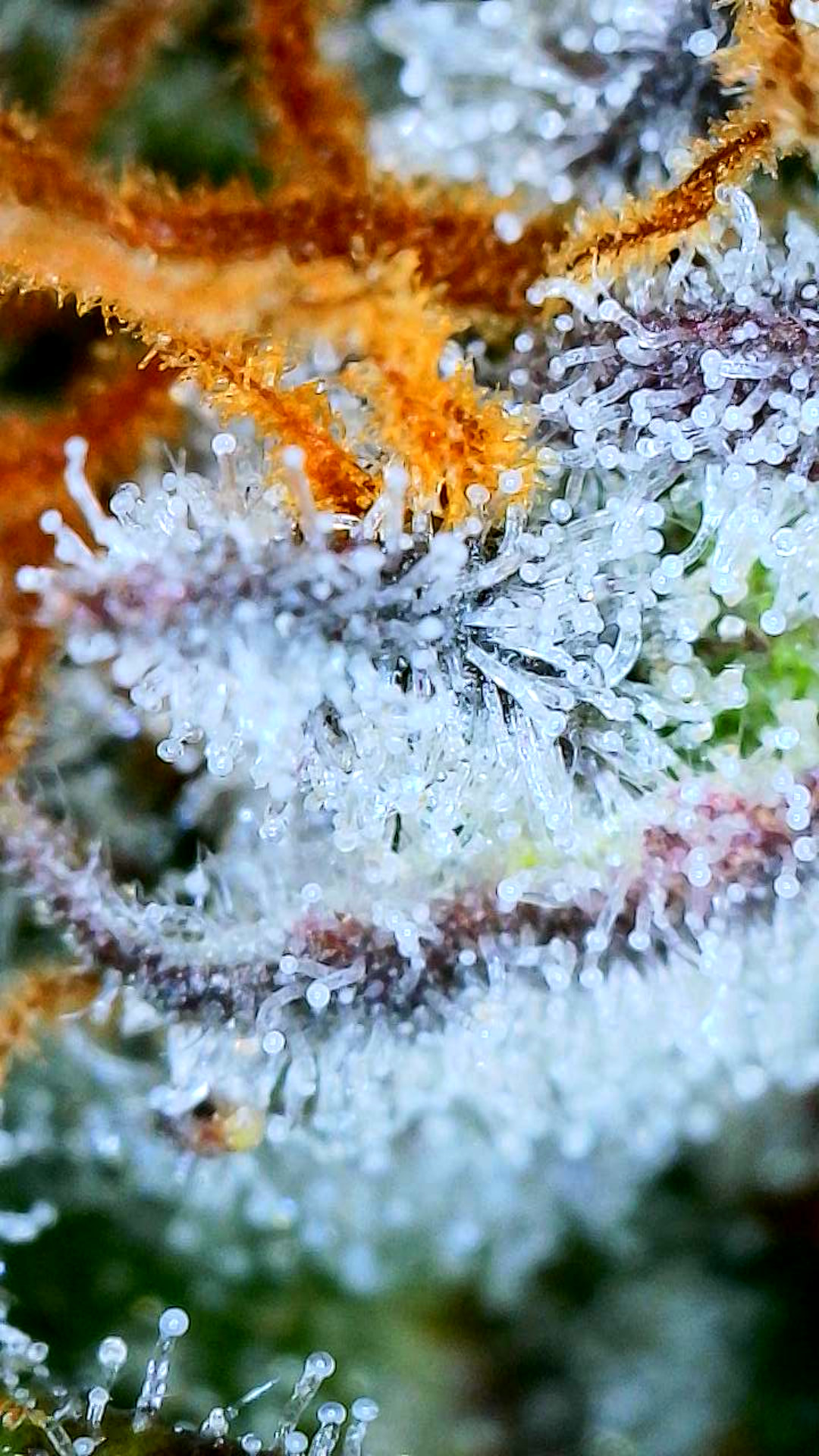 Sowohl alte wie neue Blätter waren betroffen! Wir hatten wohl zu wenig Nährstoffe gegeben die NL der Tage zuvor hatte 1.810 EC, 1.711 EC, der Drain war aber 1.202 EC, dann plötzlich 0.900 EC (also -0.608 und -0.811 EC zum Schluß). Das war wohl zuviel Licht und zu wenig Nährstoffe. Gezeigt hatte es sich zum Glück nur an der Epic Buzz mit der schnellsten Blüteentwicklung und den meisten Trichomen.