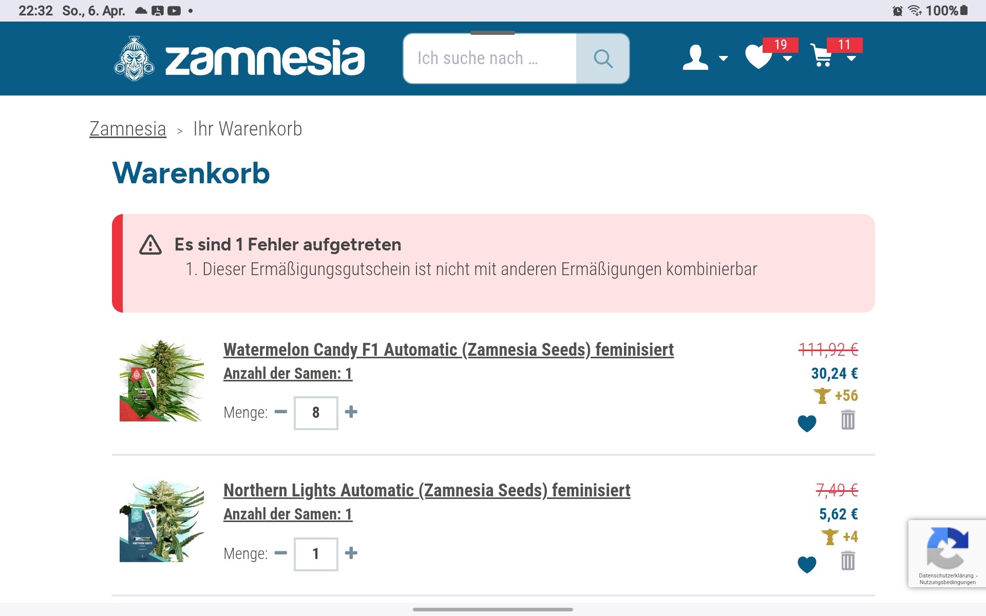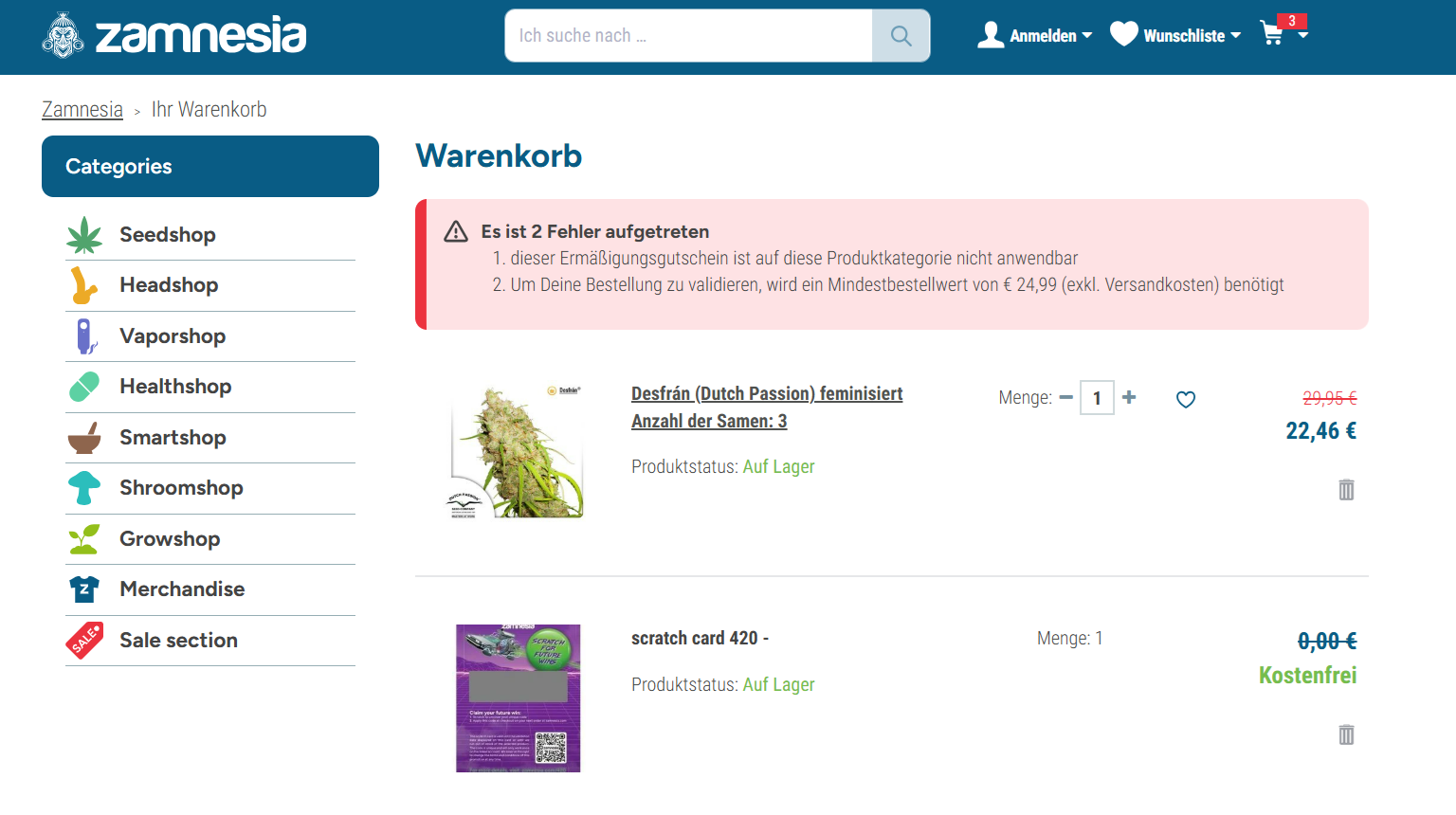 War bei mir das selbe. Es geht wohl nur mit Zamnesiasamen, sobald du was anderes im Warenkorb hast gehts nicht mehr… ![]()