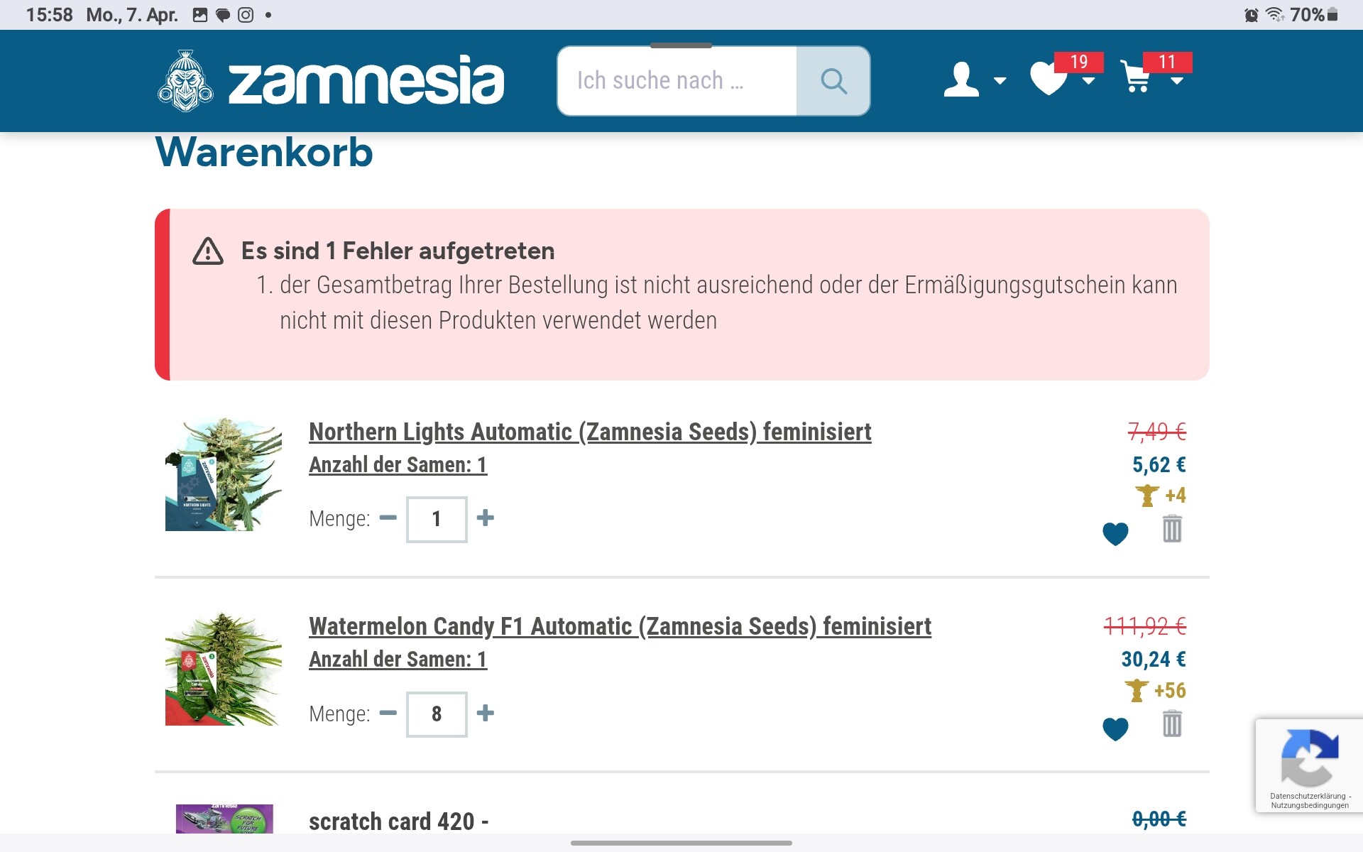 und leider wird mein Gutschein „Forever 420“ für 3 Wurlz f1 hybrid Automatiks in Höhe von 34,99€ nicht akzeptiert,obwohl dieser noch bis zum 31.05.2025 Gültigkeit besitzt,das ist nicht das erste mal, aber leider nun das letzte