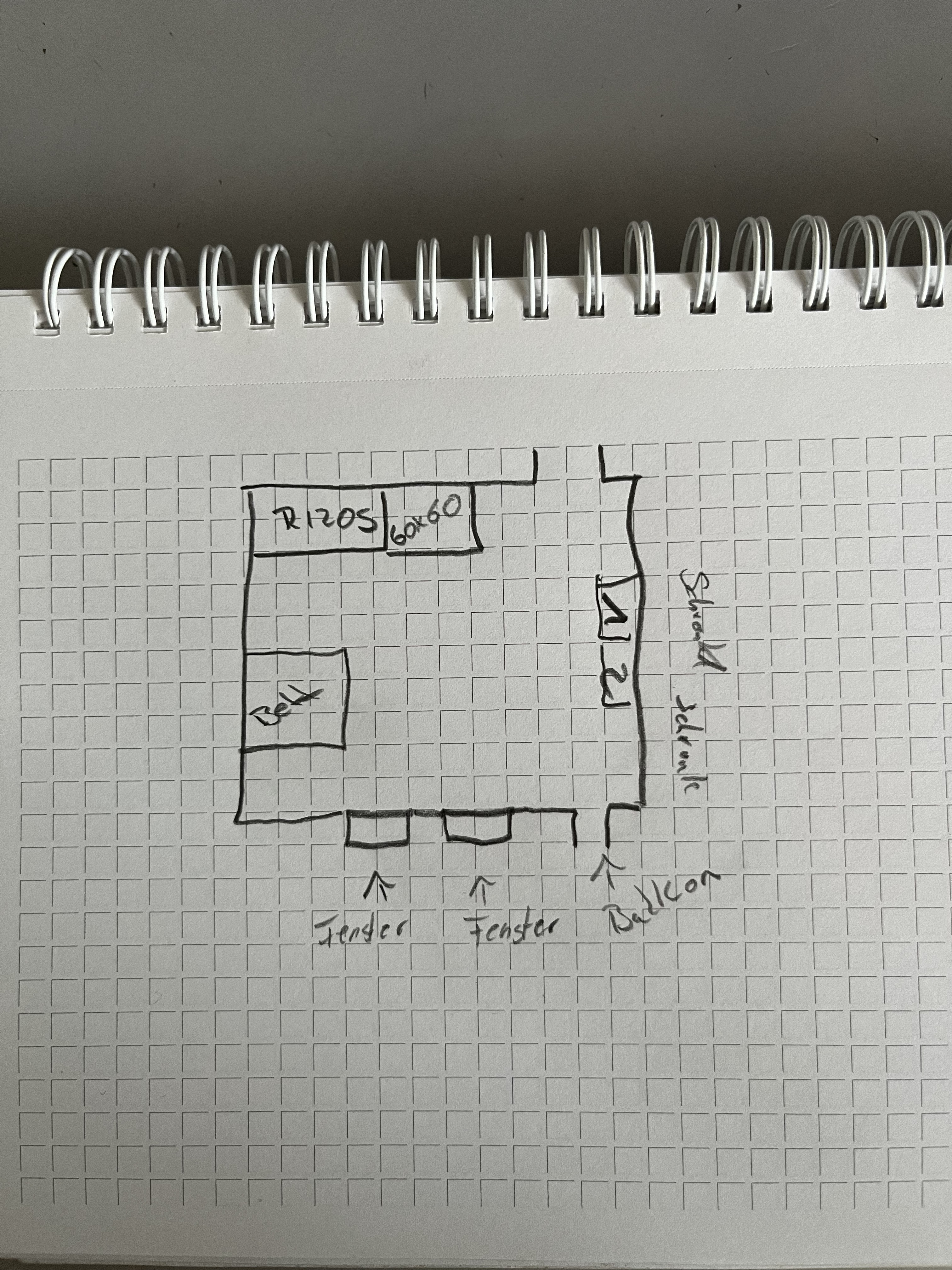 Ich habe mal einen Grundriss vom Zimmer gezeichnet damit ihr mal ein groben Überblick bekommt. Das Problem ist das die Abluft und zuluft vom gleichen Zimmer gezogen wird.