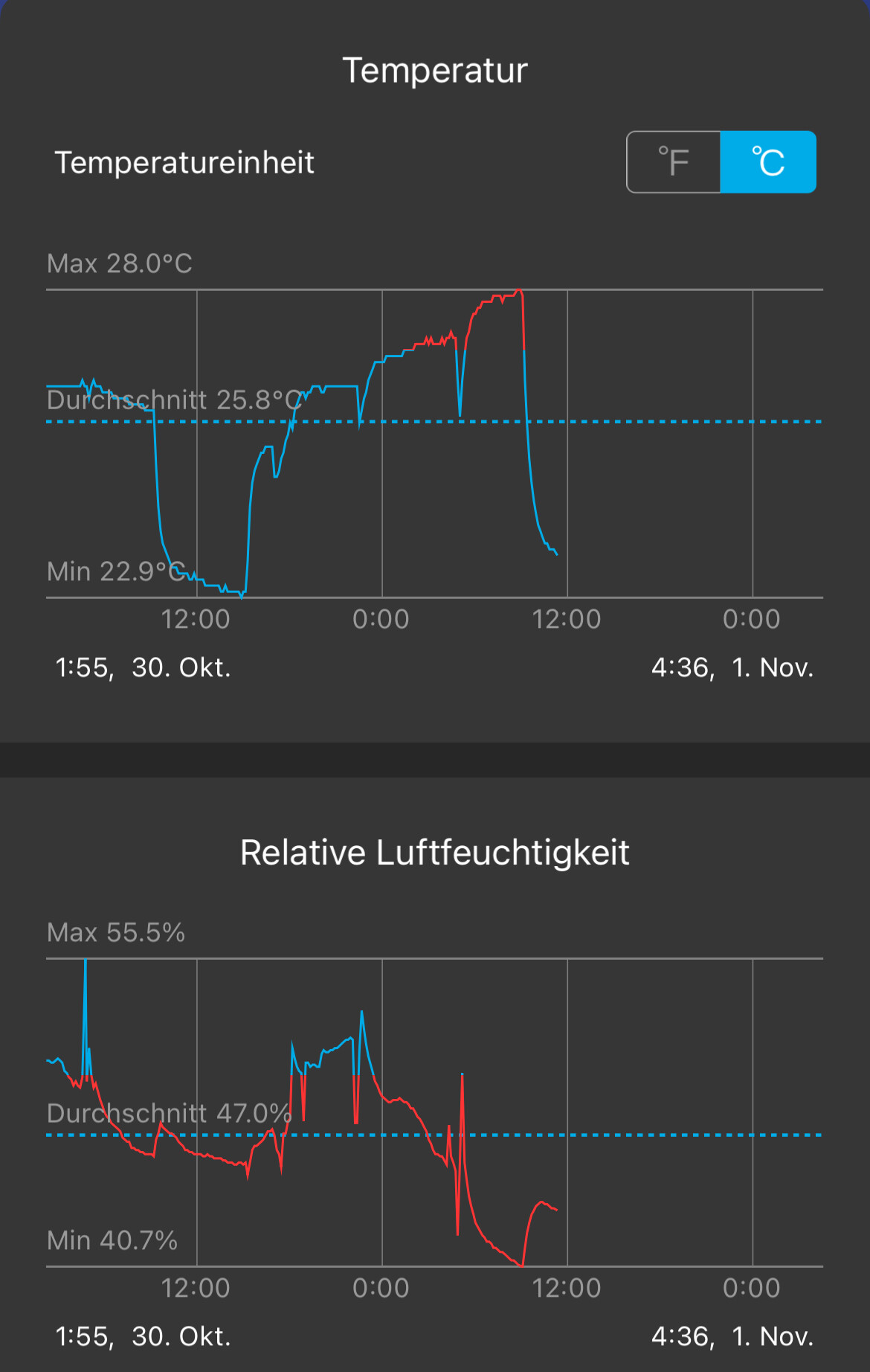 Ich lüfte halt morgens mittags wenn ich heim komm und vor dem schlafen gehen. Versuche halt die LF zwischen 40-50% zu halten. Fenster oder Türe auf direkt wenn es nass draußen ist 5-10% mehr LF im Zimmer
