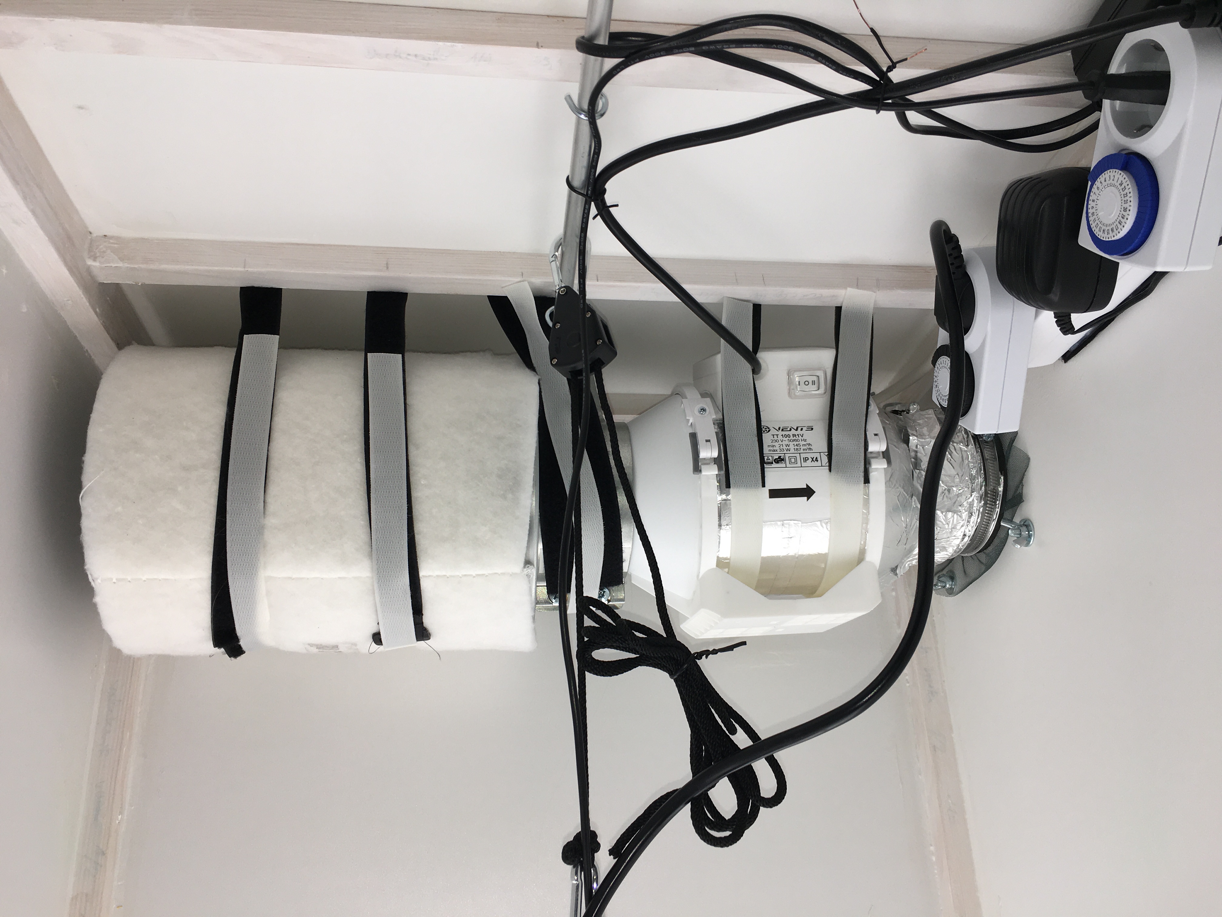 Die Growbox hat 60x60x120. Abluft wird das Set „Lüftungsset 160 ECO, Abluftventilation & AKF“ von growmart. Fördervolumen zwei Stufen wählbar: 145 und 187m³/h. 100mm Rohrdurchmesser.