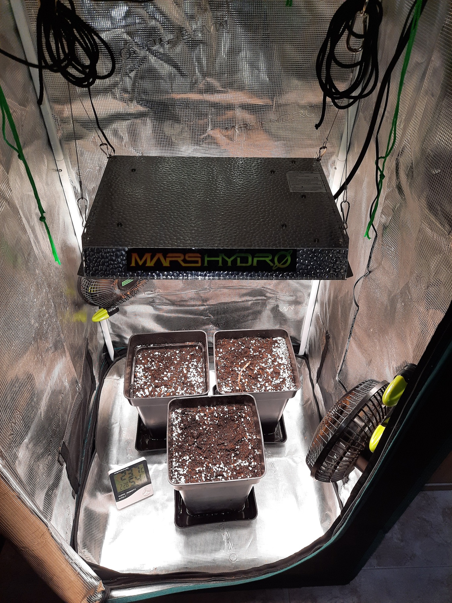 Habe wie beim ersten Lauf Wasser abstehen lassen und die Töpfe vorgegossen mit ca. 2.3L jeweils. Habe wie gehabt Root Juice reingemacht nach Plan damit es gleich richtig losgehen kann. Einzige Änderung beim Düngen ist das ich diesmal den PH absenke (mit BioBizz ph-). Habe dazu 0.278ml/L reingemischt was den PH von 7.64 auf 6.25 runter bringt. Gemessen habe ich mit diesem Gerät hier: Fivota pH-Messgerät für den Boden, 3 in 1, pH-Messgerät, Bodenfeuchtigkeit/Licht/pH-Messgerät, TDS : Amazon.de: Gewerbe, Industrie & Wissenschaft Gabs im Sonderangebot für 16 Euro.