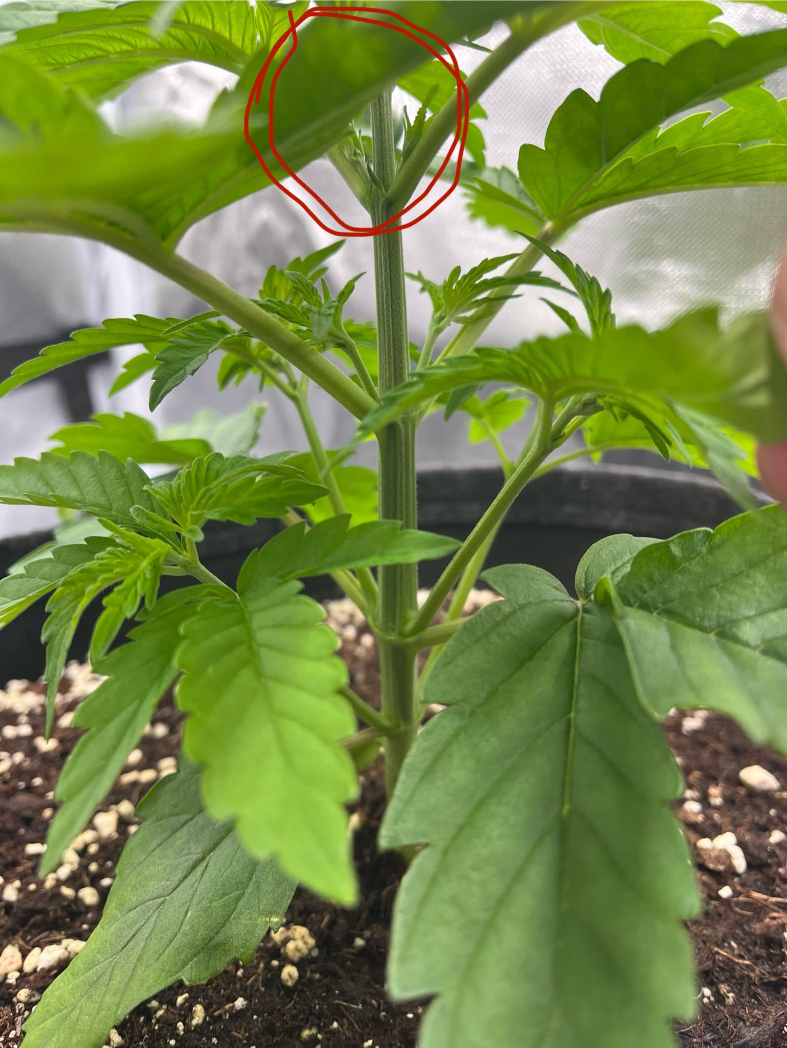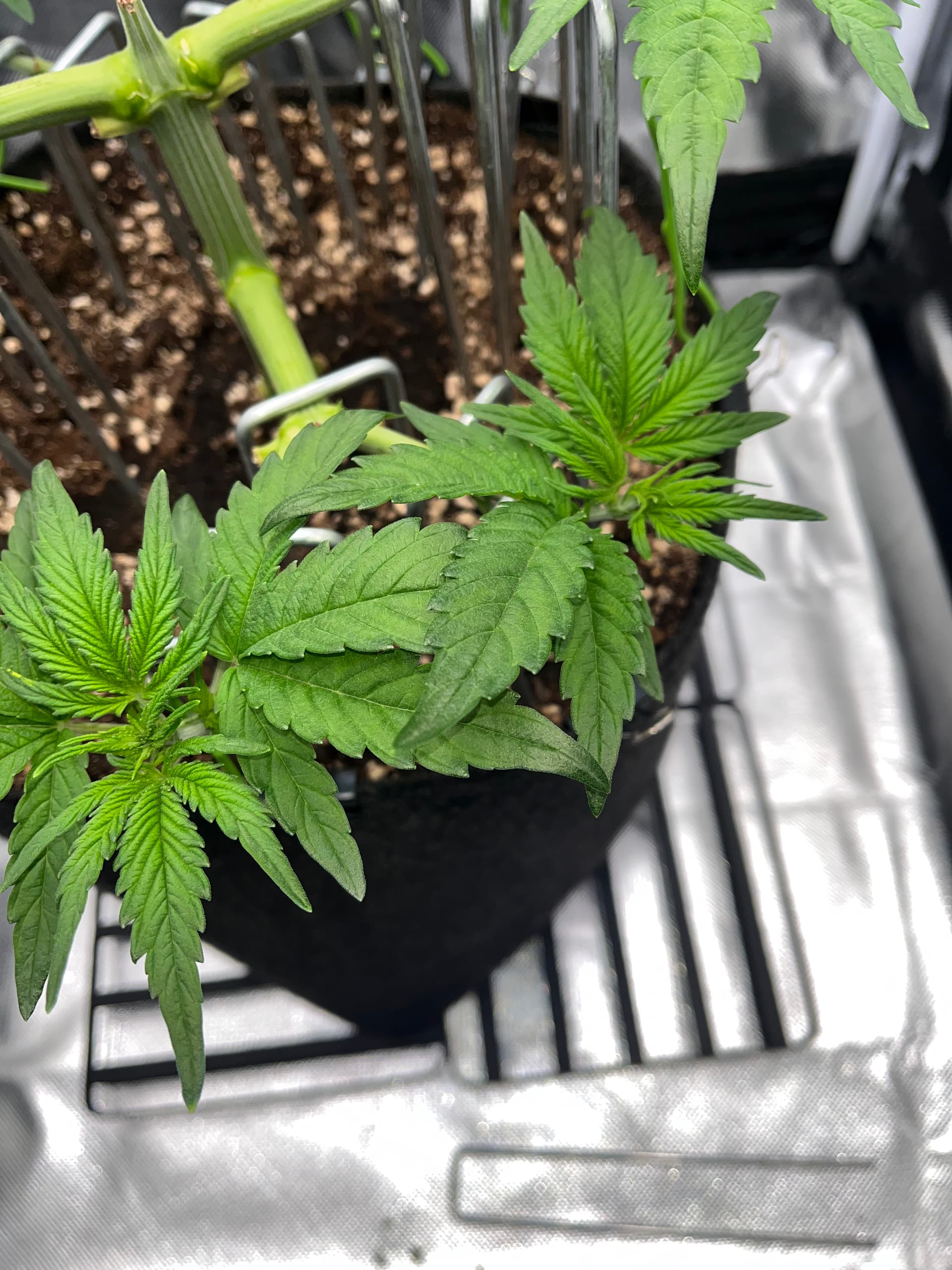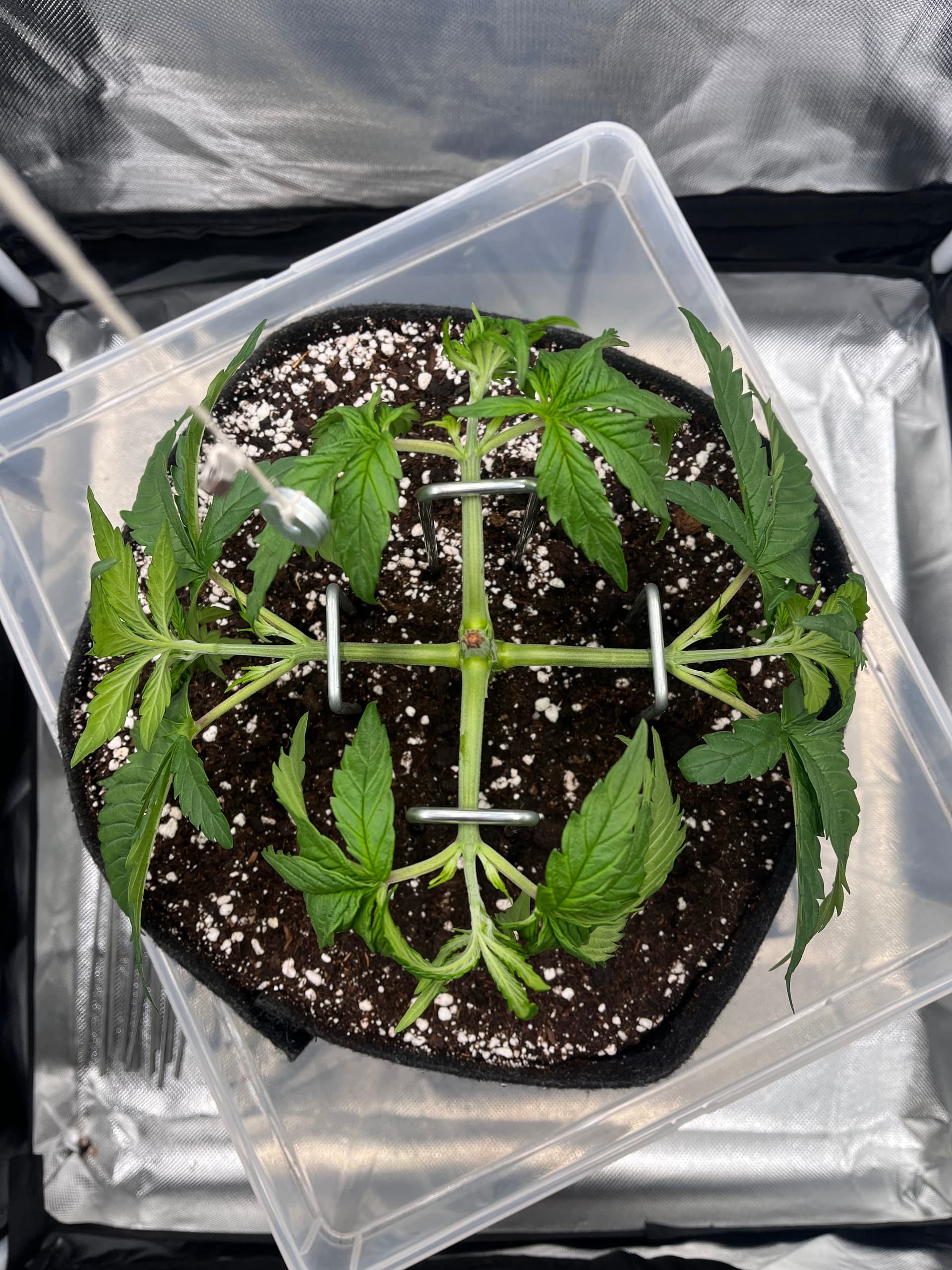 Den Plan, die Triebe der zweiten und dritten Nodie zu nehmen werfe ich ĂŒber Board. Die Erde hat sich dann doch mehr gesetzt als ich dachte und die zweiten Triebe sind unter dem Topfrand. Ich werde sie ĂŒber der vierten Nodie toppen morgen oder ĂŒbermorgen und die Triebe der ersten und zweiten Nodie entfernen, damit ich mit 3 und 4 im Mainling arbeiten kann. Ich werde auch noch 1-2 Liter Light Mix in den Topf geben damit der ein bisschen voller wird und ich nicht so langen Draht benutzen muss um zu trainieren.